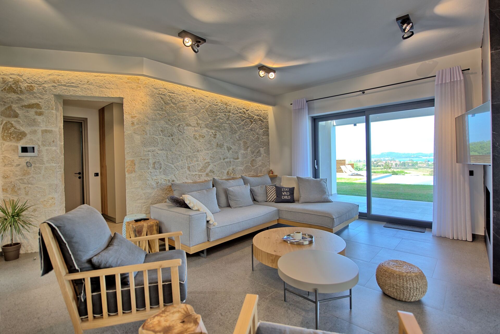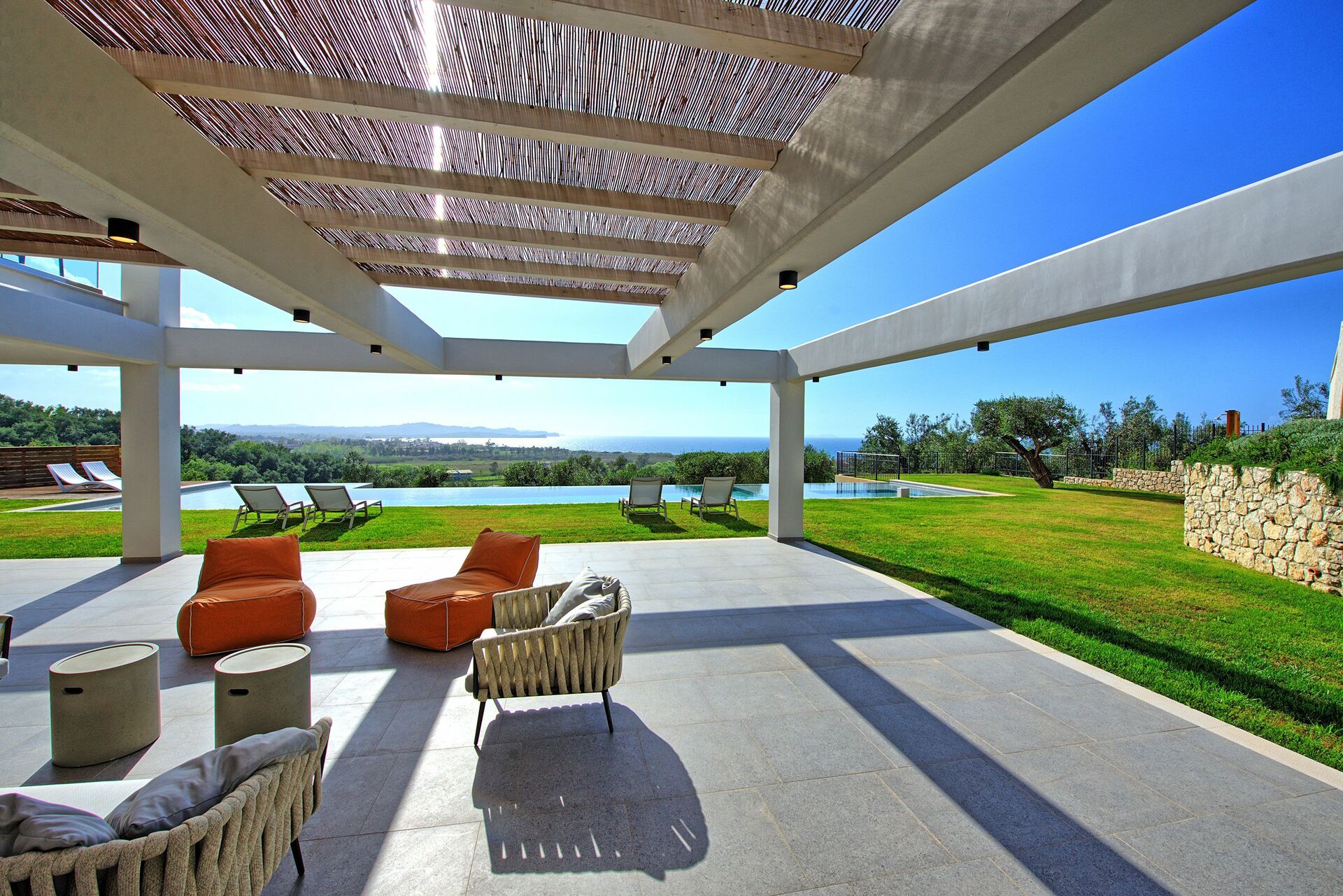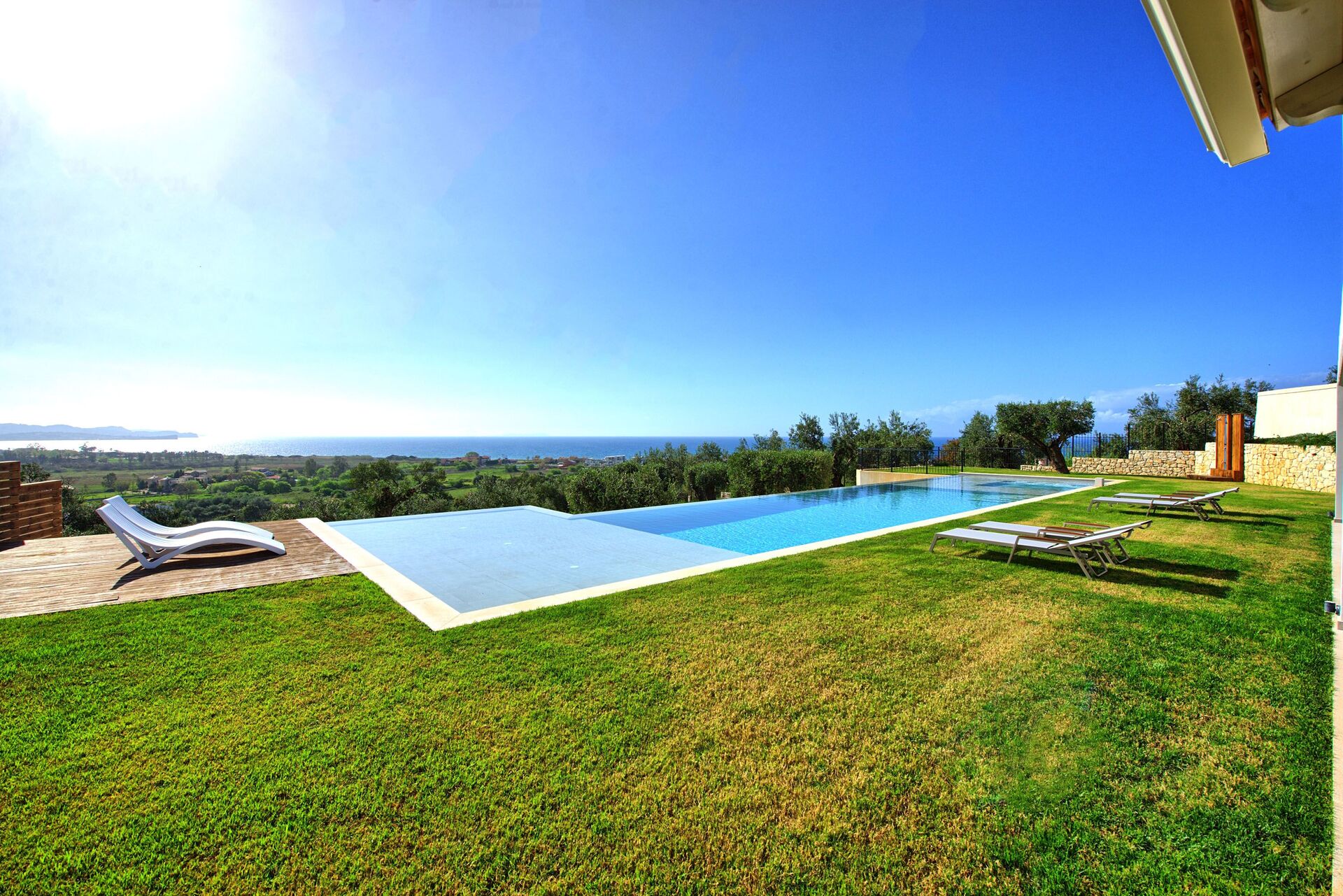 A beautiful, modern and spacious property perched on a hill with views from all the rooms overlooking the sea and the Albanian mountains in the distance.