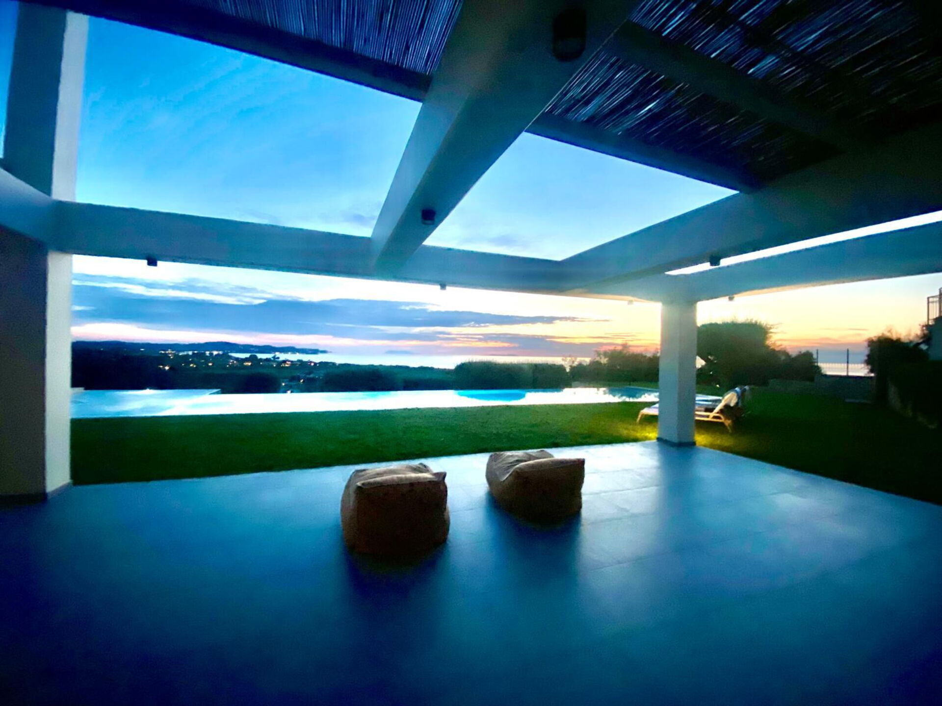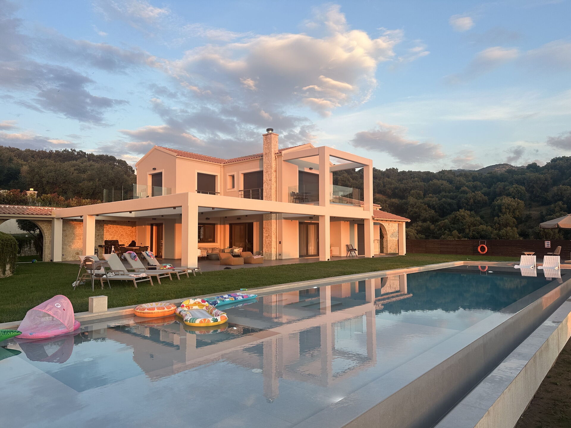 The house, unlike other villas we experienced in Corfu, was a modern masterpiece, with every detail being thought out. Electrical black out blinds keep the sun's brightness at bay in all 3 bedrooms, allowing you to wake at your own pace. AC so up-to-date and effective, it could be in a million dollar mansion in Miami. The house includes three en-suite double showers with great pressure, a full and modern kitchen, a large flat screen TV with HDMI plugin, open, light, indoor outdoor flow with screens on every window and door and a washer and dryer. We grilled on the BBQ, hung out on the bean bag chairs and outdoor dining table, and took constant dips in the pool as the sun beat down amidst the beautiful backdrop.