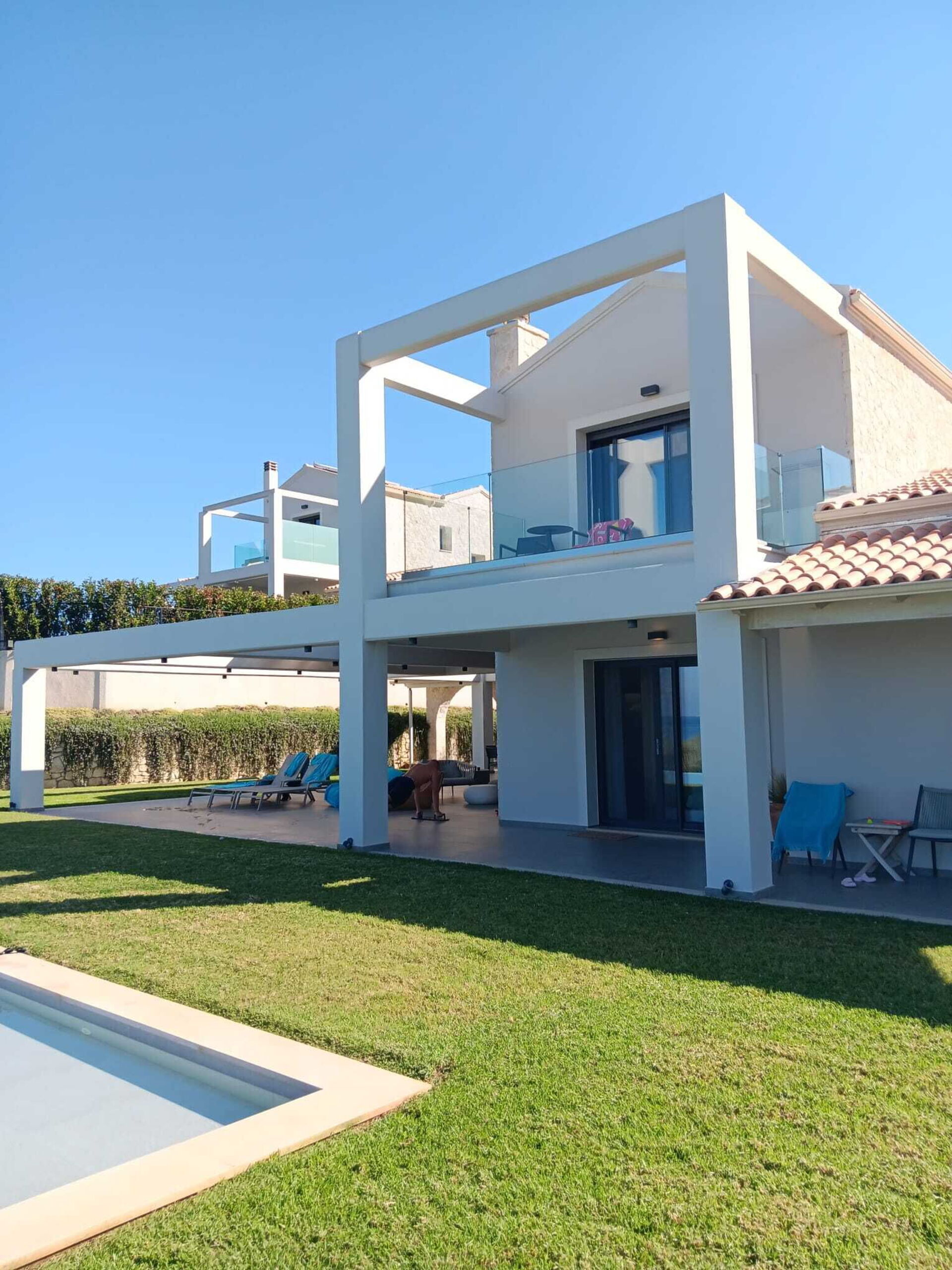 We were a family of 4, stayed for 10 days and had an amazing time. Location: just outside of Acharavi, up a short drive off the main road. You need a car, but it's about 5 min drive to Acharavi, which has great shops and a beach, and the other way about 15 mins to Kassiopi, which is really beautiful. The house is in a peaceful location - one house next door, but then nothing else around, so really relaxing. Outside: The best bit of the house really is the outside - the pool is huge, and the terrace is beautiful and large. There's a lot of nice terrace furniture, and shade as well as sunny bits. Great view of the bay, and beautiful sunsets. Inside: Two bedrooms upstairs, one down. All with good a/c and bathroom. Living area had a big sofa and a big TV so we could all sit and watch films together. Wifi was good! Kitchen was large and had all the equipment we needed. The decor inside was clean and minimal. Would happily stay here again.