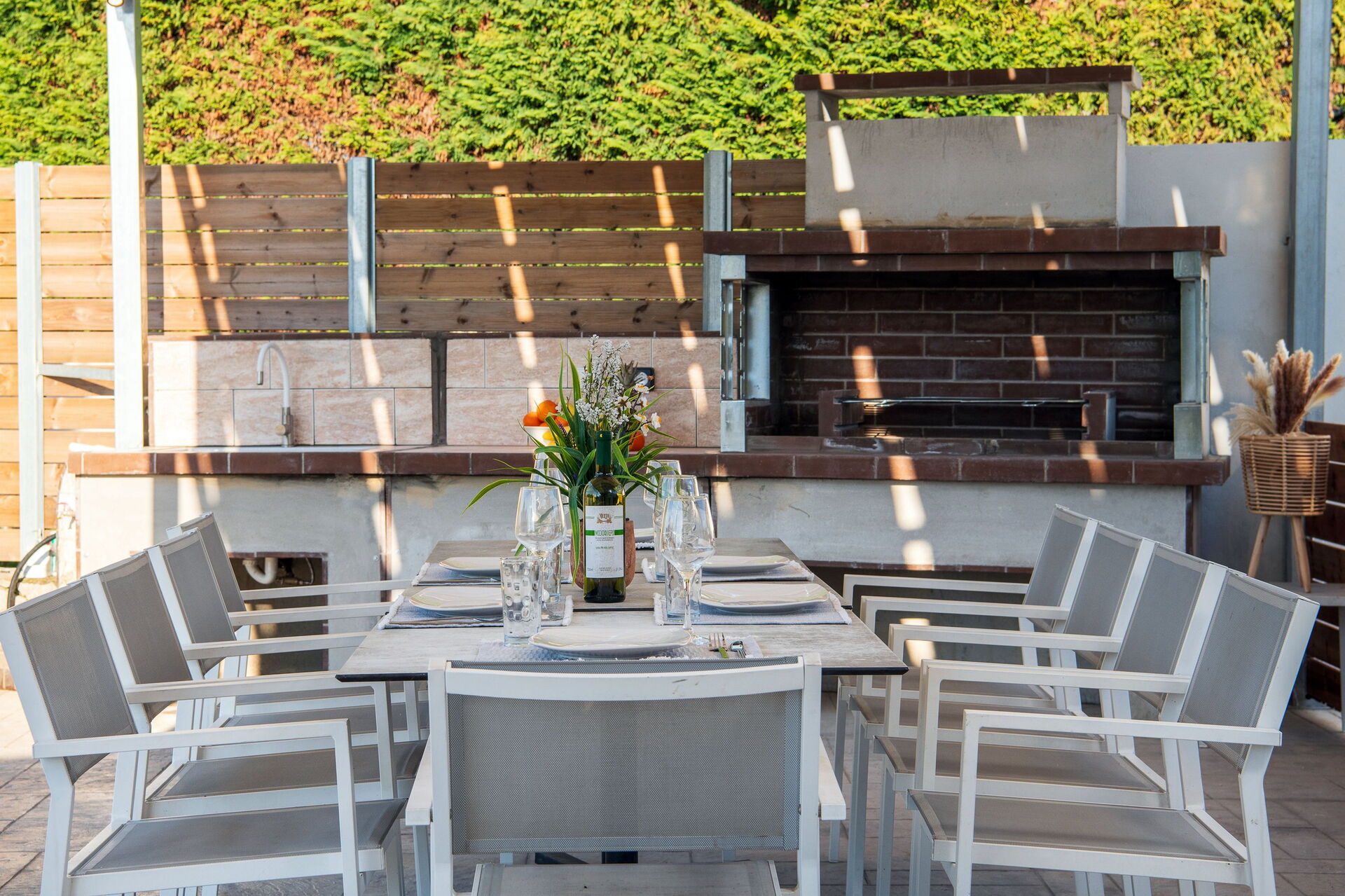 - möblerad uteplats med grill, bord och stolar för utomhusmåltider