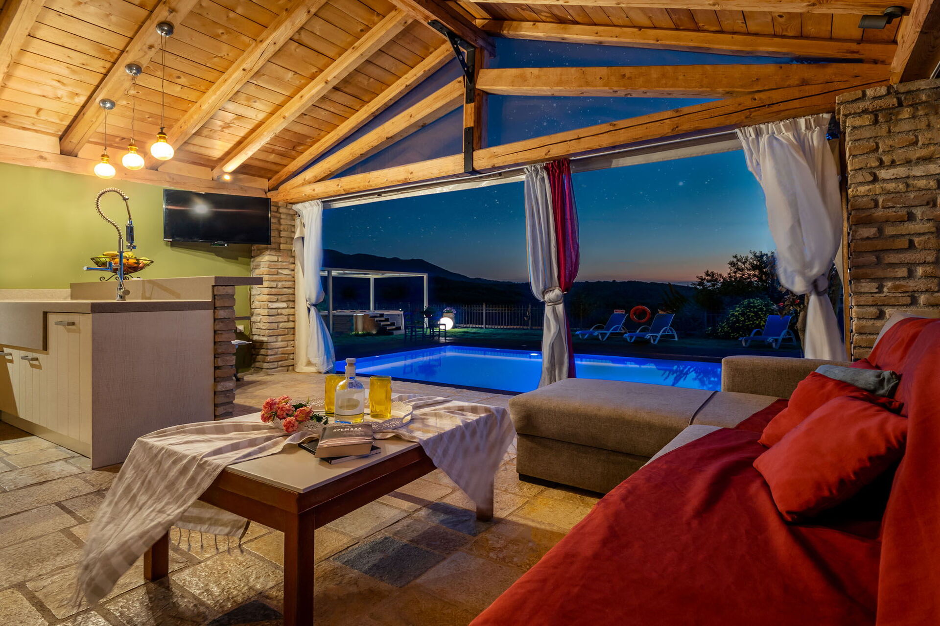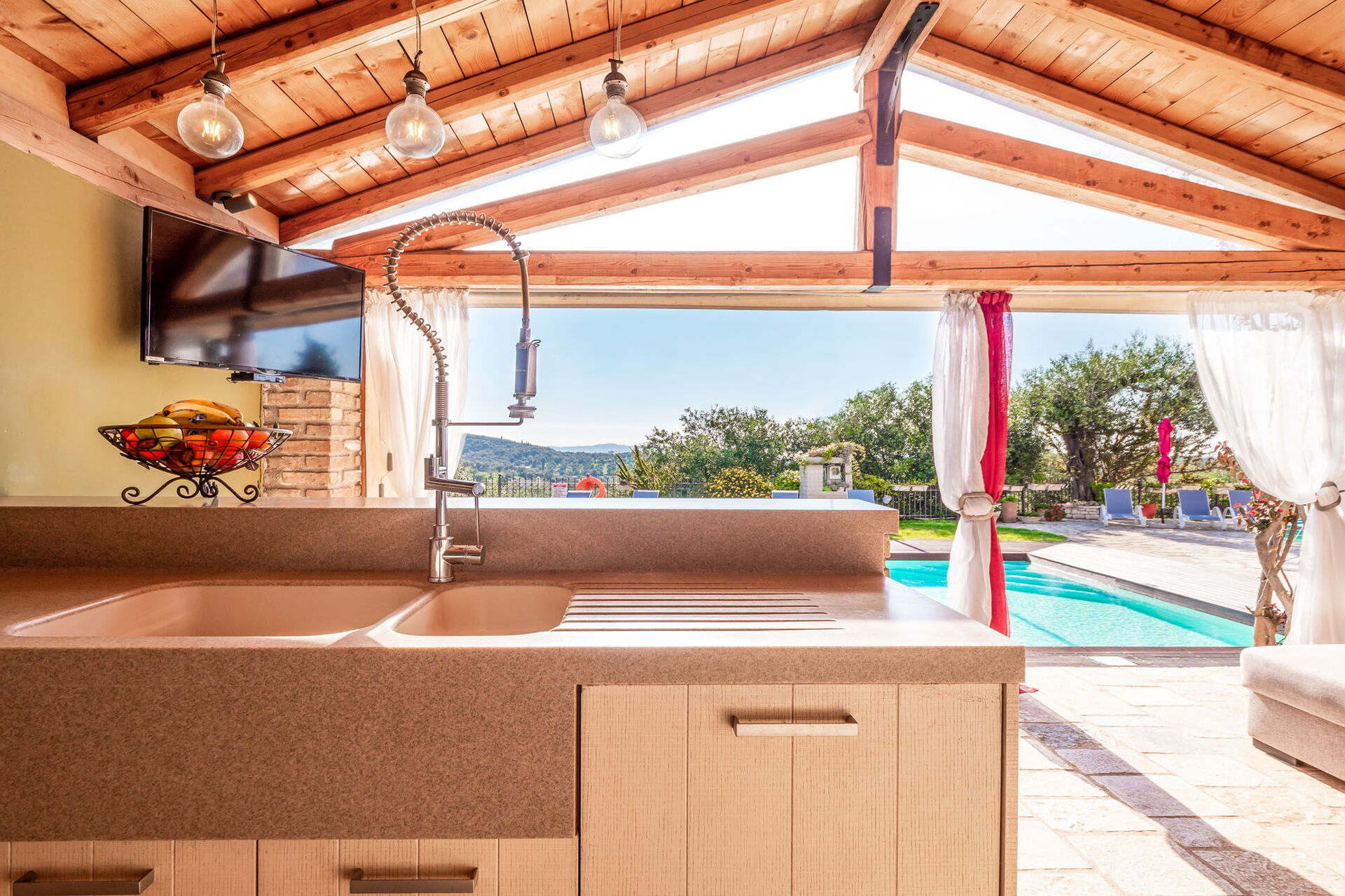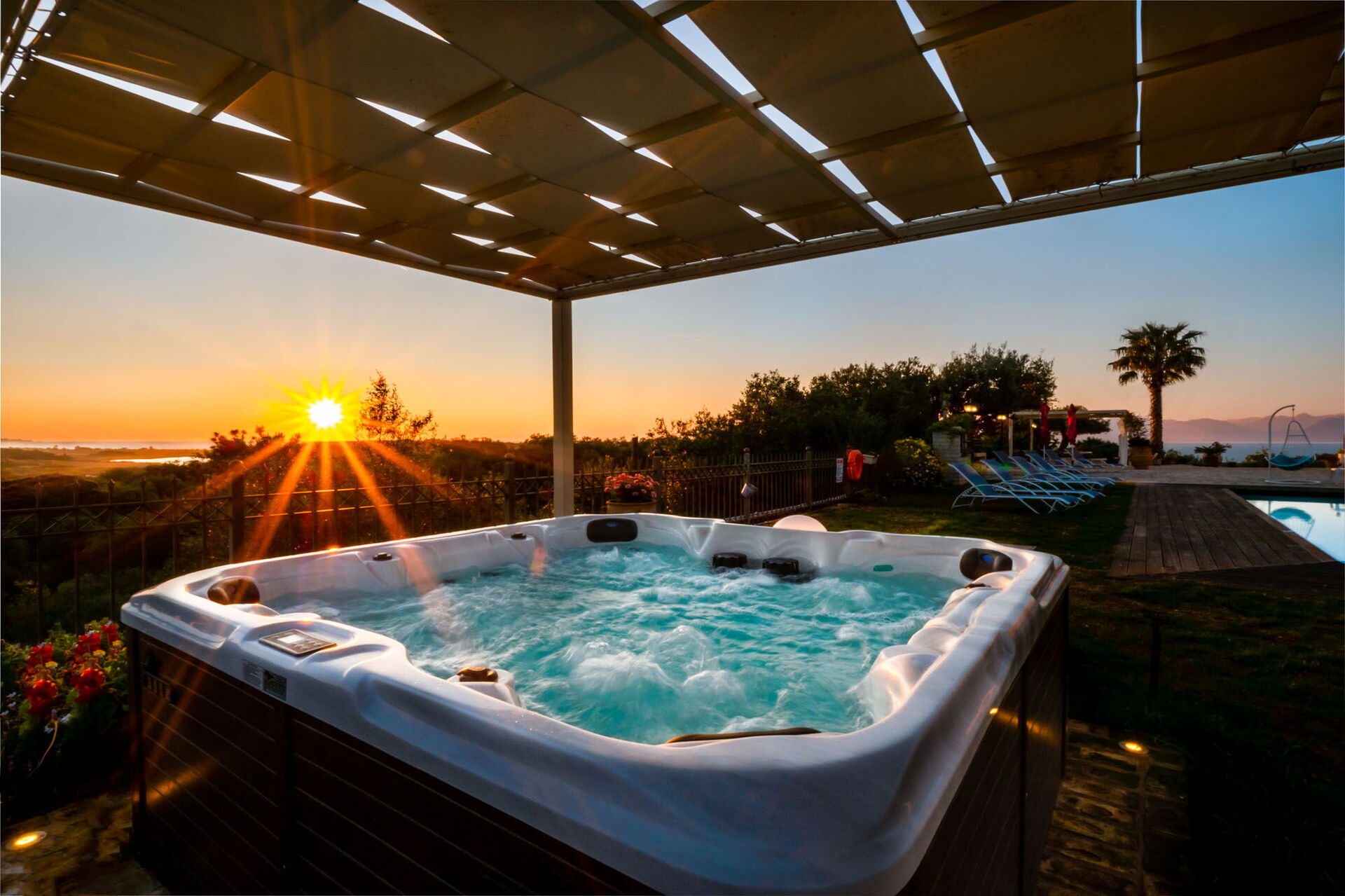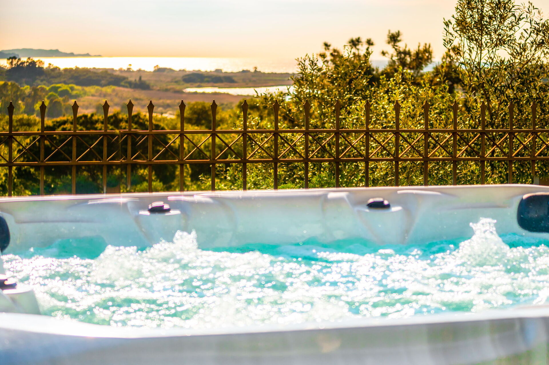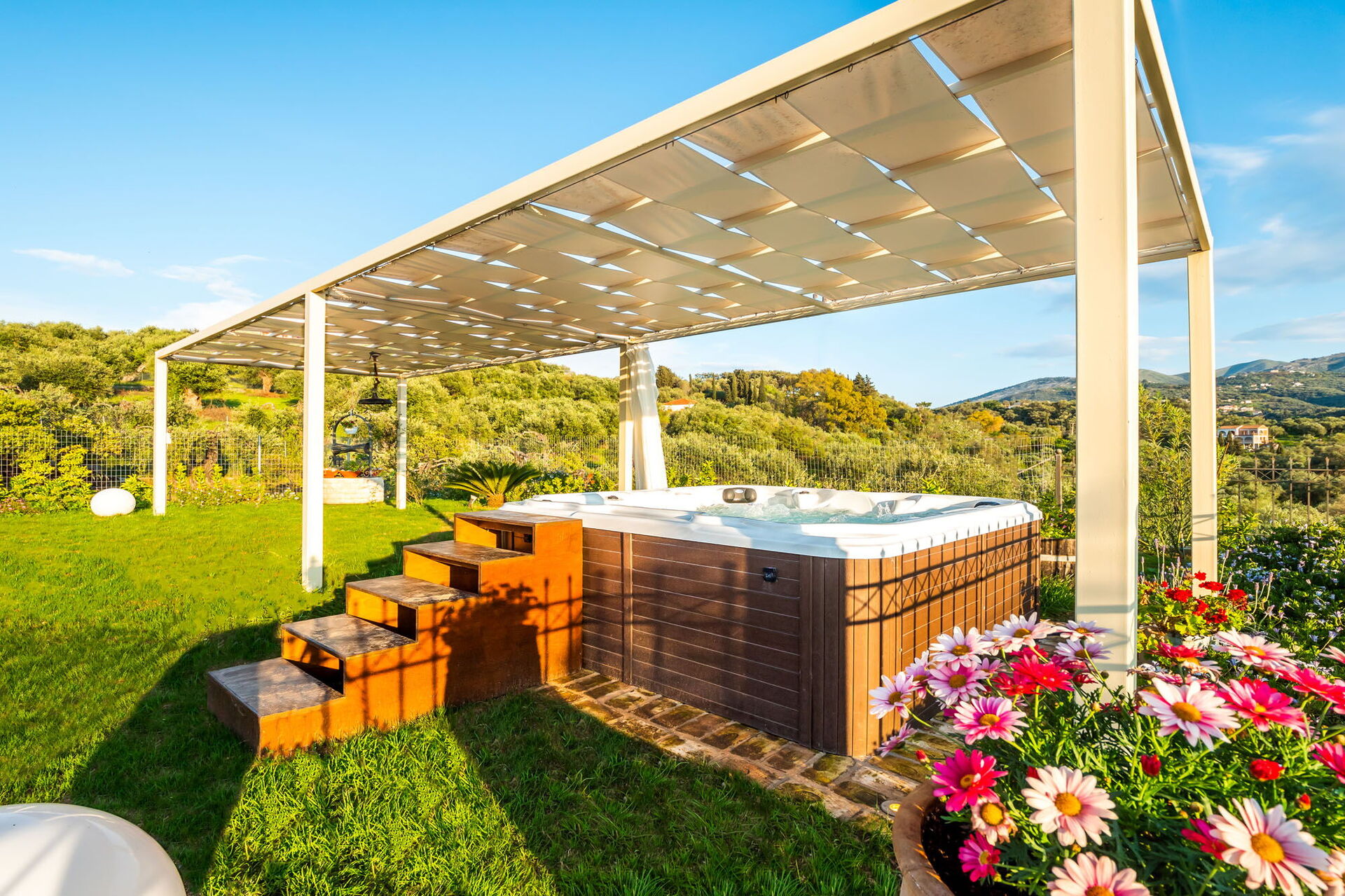 En vacker pool och ett spektakulärt bubbelbad med plats för 7 personer står till gästernas förfogande. Även utomhusområdena är privata, liksom ett imponerande externt rum med kök och stor matplats som vetter mot poolen och trädgården. Detta rum har justerbara gardiner som kan öppnas på soliga dagar eller stängas för att skydda mot vind och svalare temperaturer.