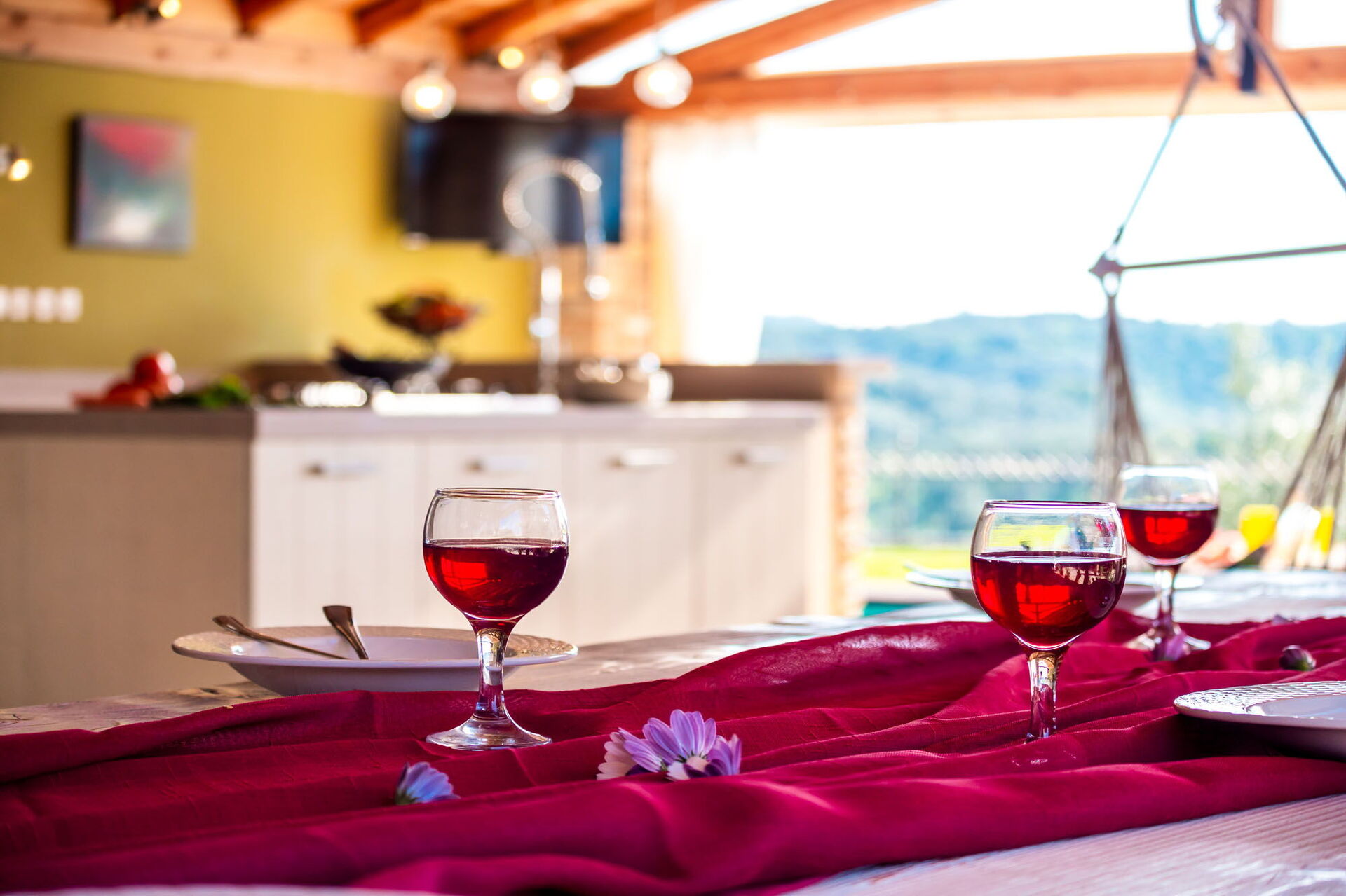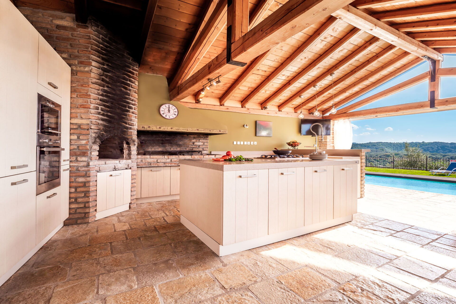 Extern byggnad (inte ansluten till huvudbyggnaden inifrån, men bara några meter bort): vardagsrum med TV och matplats med stort, välutrustat kök (spisplattor, ugn, grill, vedeldad ugn).