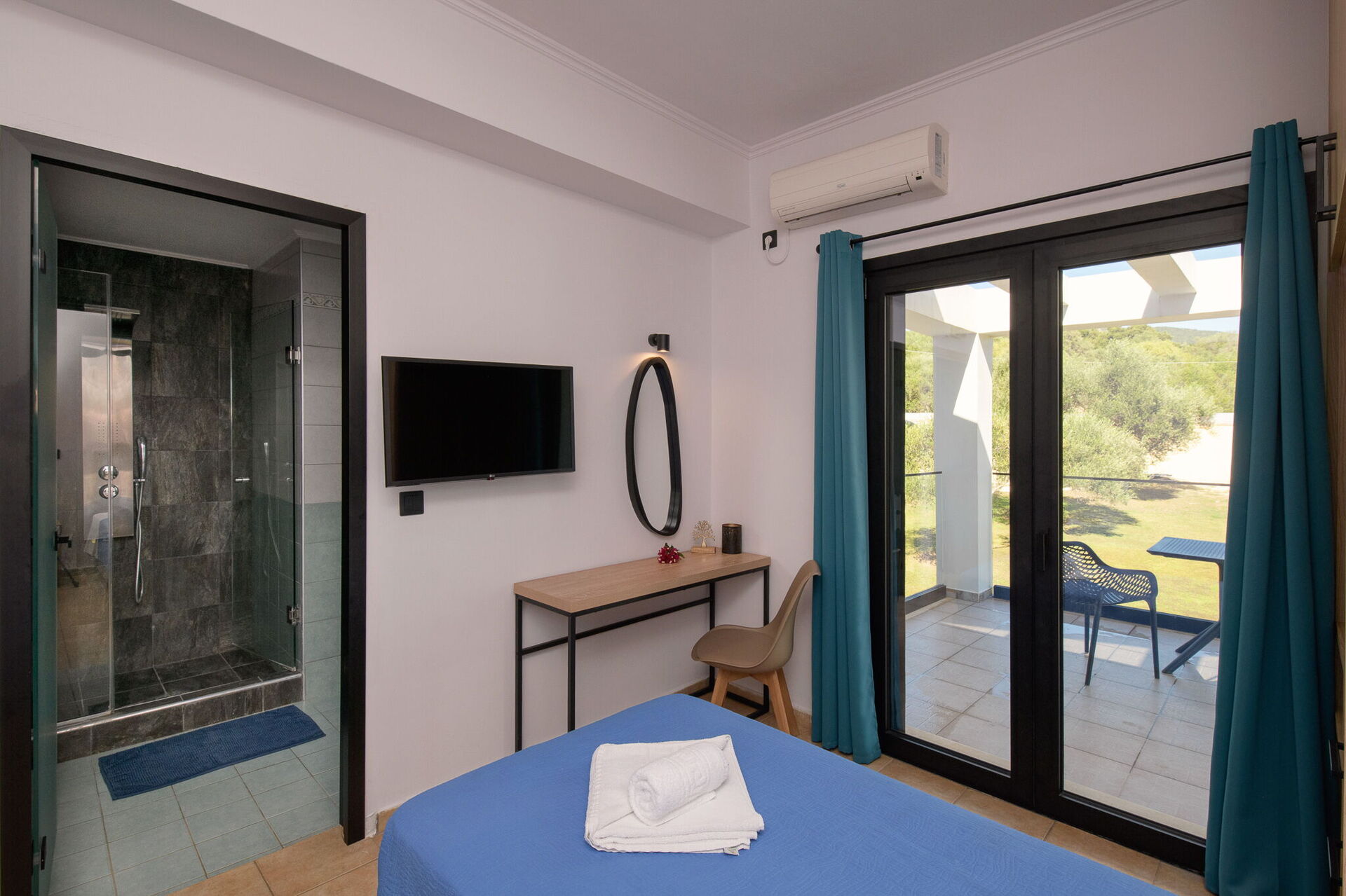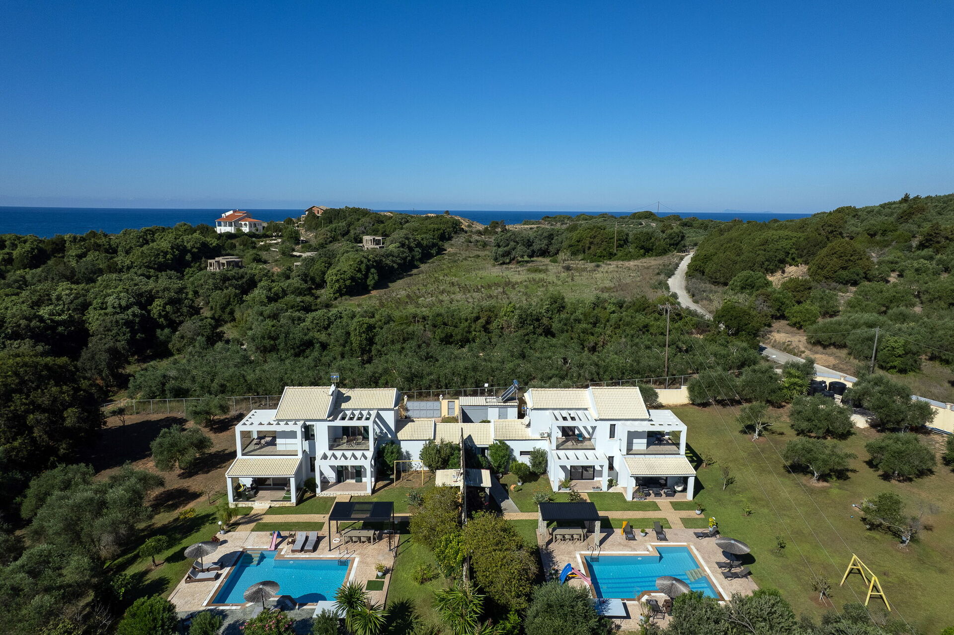 Fastigheten ligger nära havet och den välkända stranden Chalikounas – en gyllene sandremsa som skiljer Korission-lagunens vatten från havet och som är en populär plats bland surfare och kitesurfare tack vare de gynnsamma vindförhållandena.