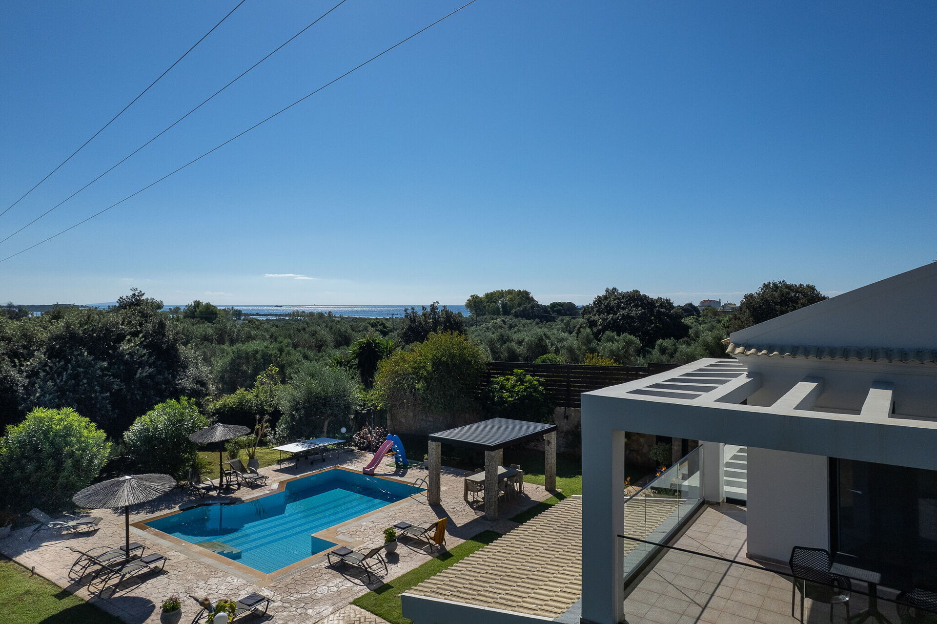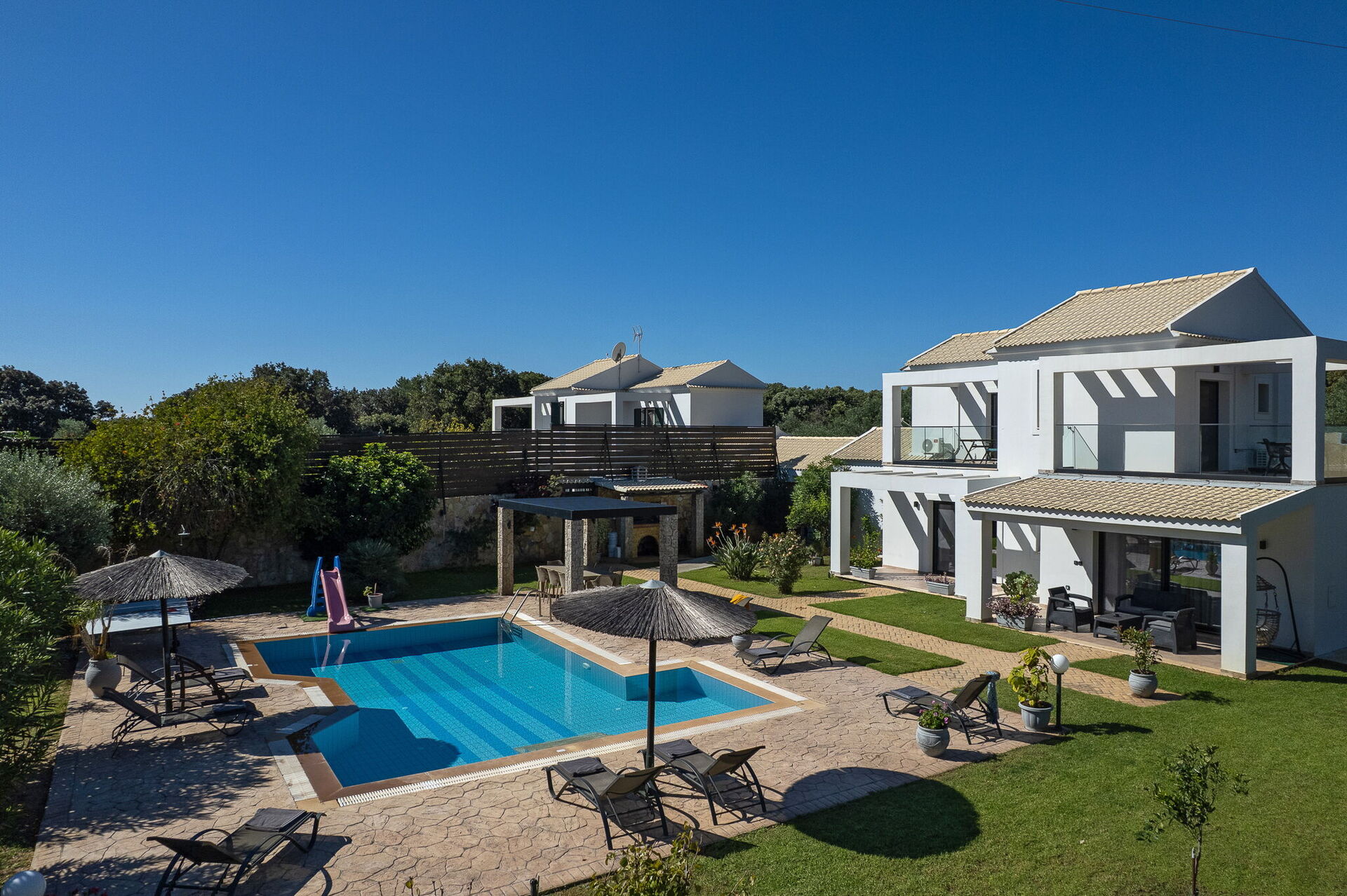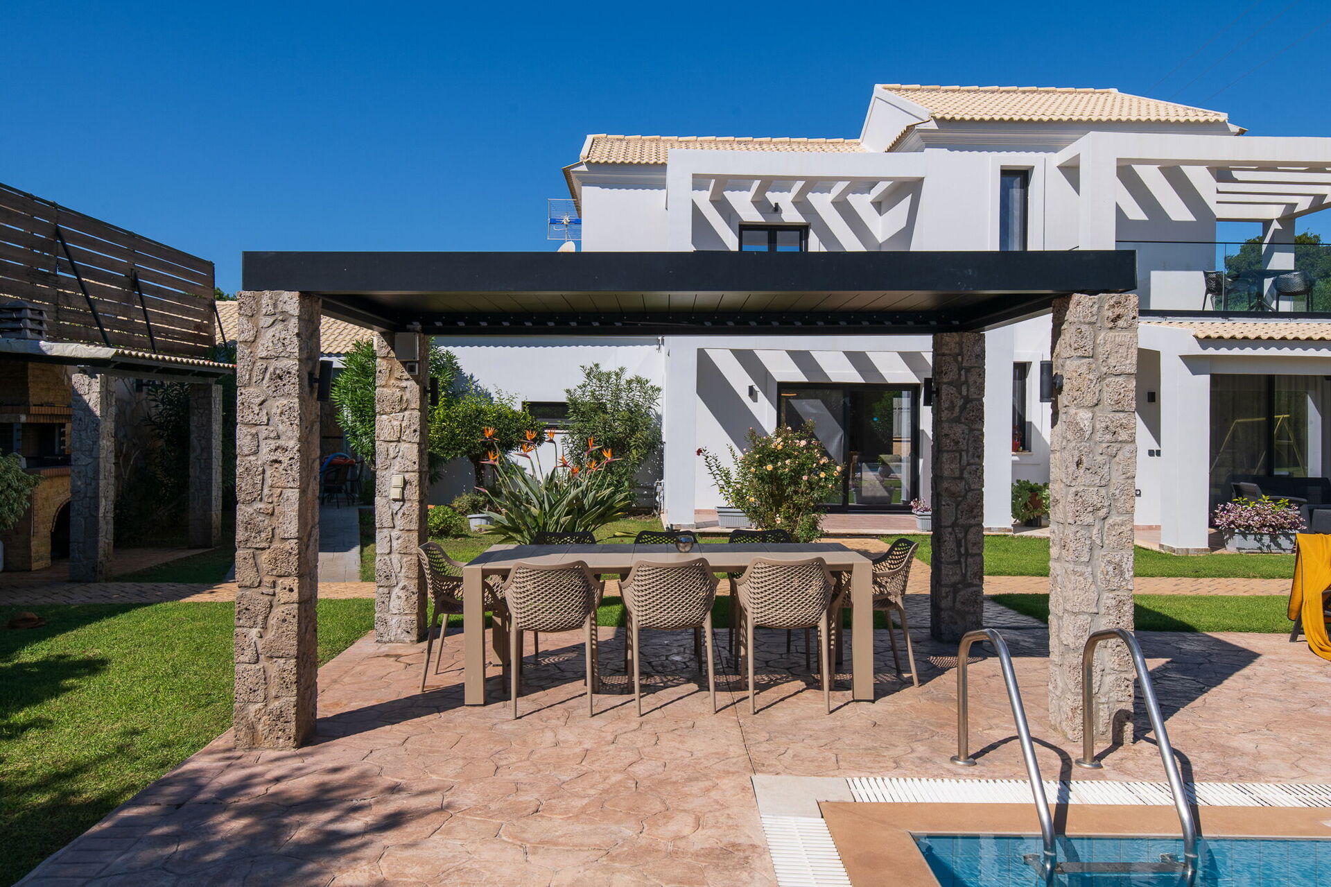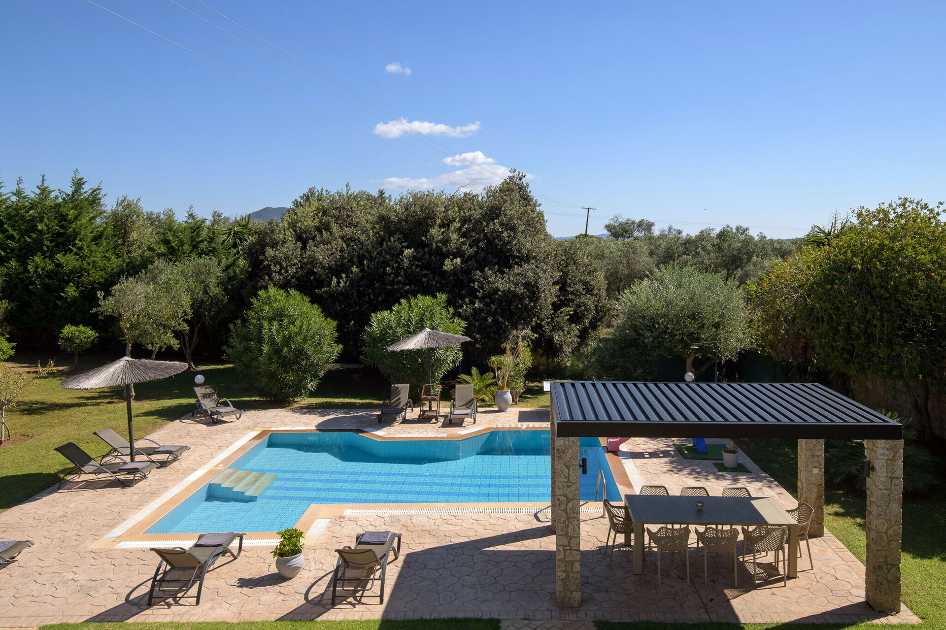 Utomhus finns flera gemensamma utrymmen där gästerna kan tillbringa tid tillsammans och skapa oförglömliga minnen under Korfus sol – antingen under paviljongen med matplats för att njuta av måltider utomhus, eller vid det stora poolområdet med solstolar runtomkring.
