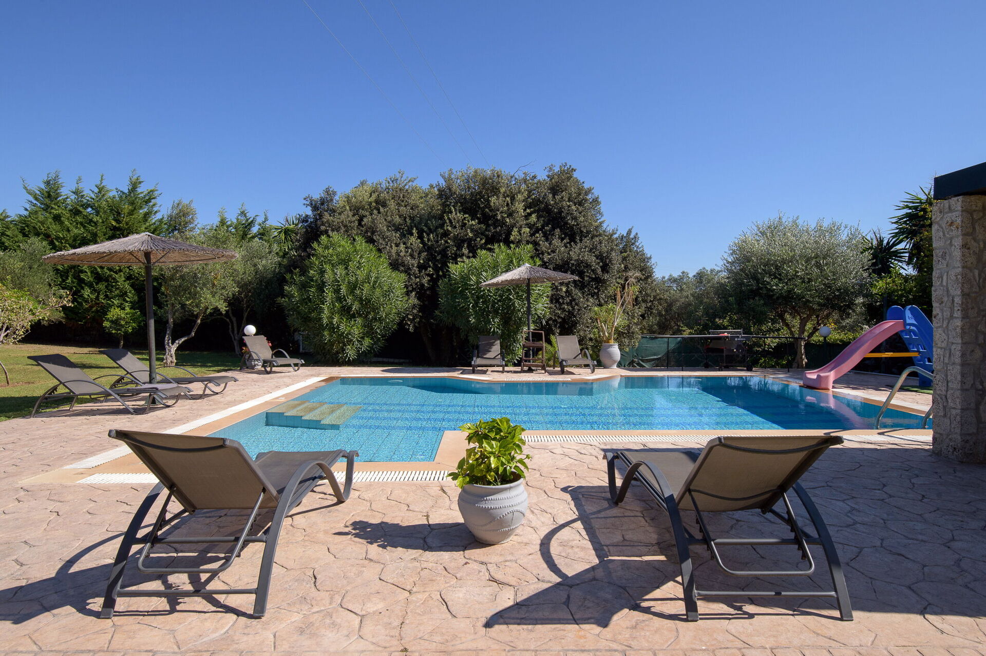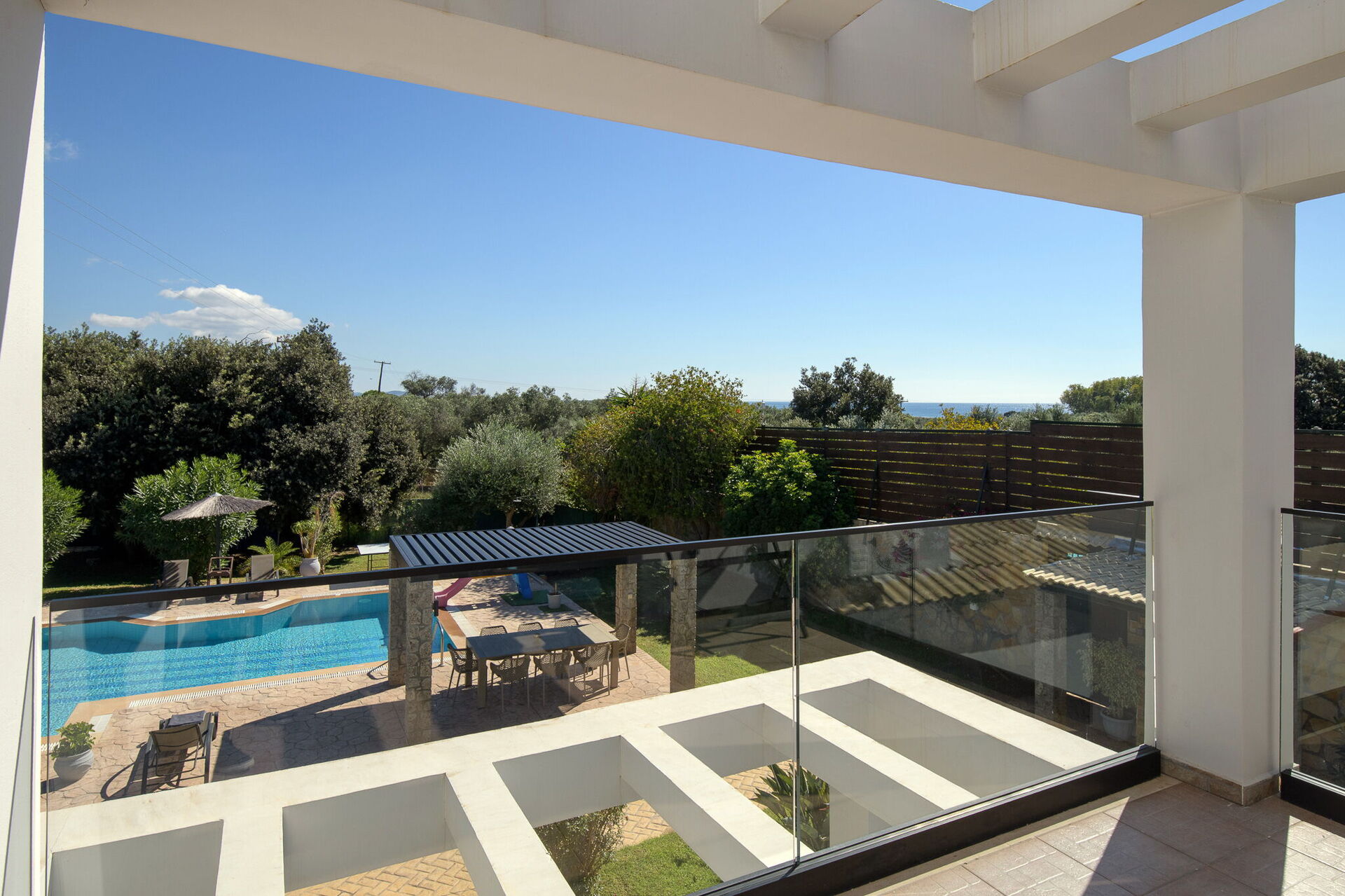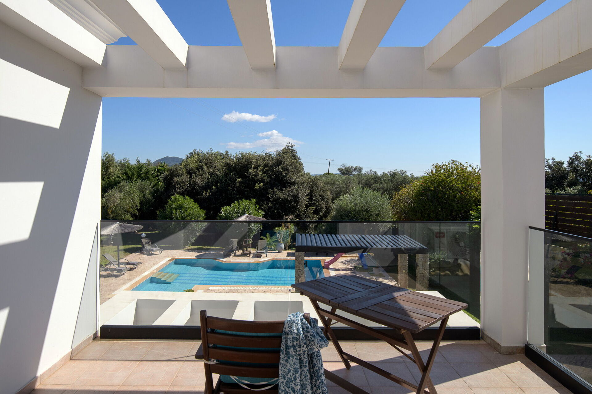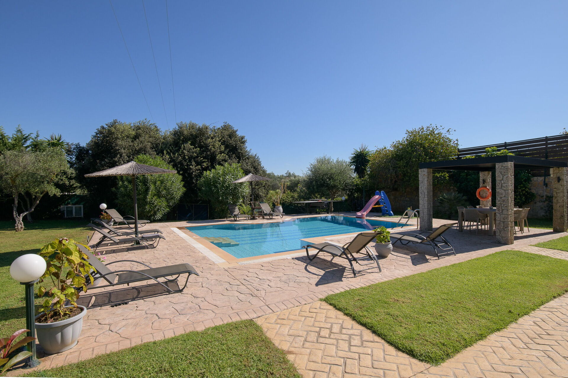Utomhus finns flera gemensamma utrymmen där gästerna kan tillbringa tid tillsammans och skapa oförglömliga minnen under Korfus sol – antingen under paviljongen med matplats för att njuta av måltider utomhus, eller vid det stora poolområdet med solstolar runtomkring.
