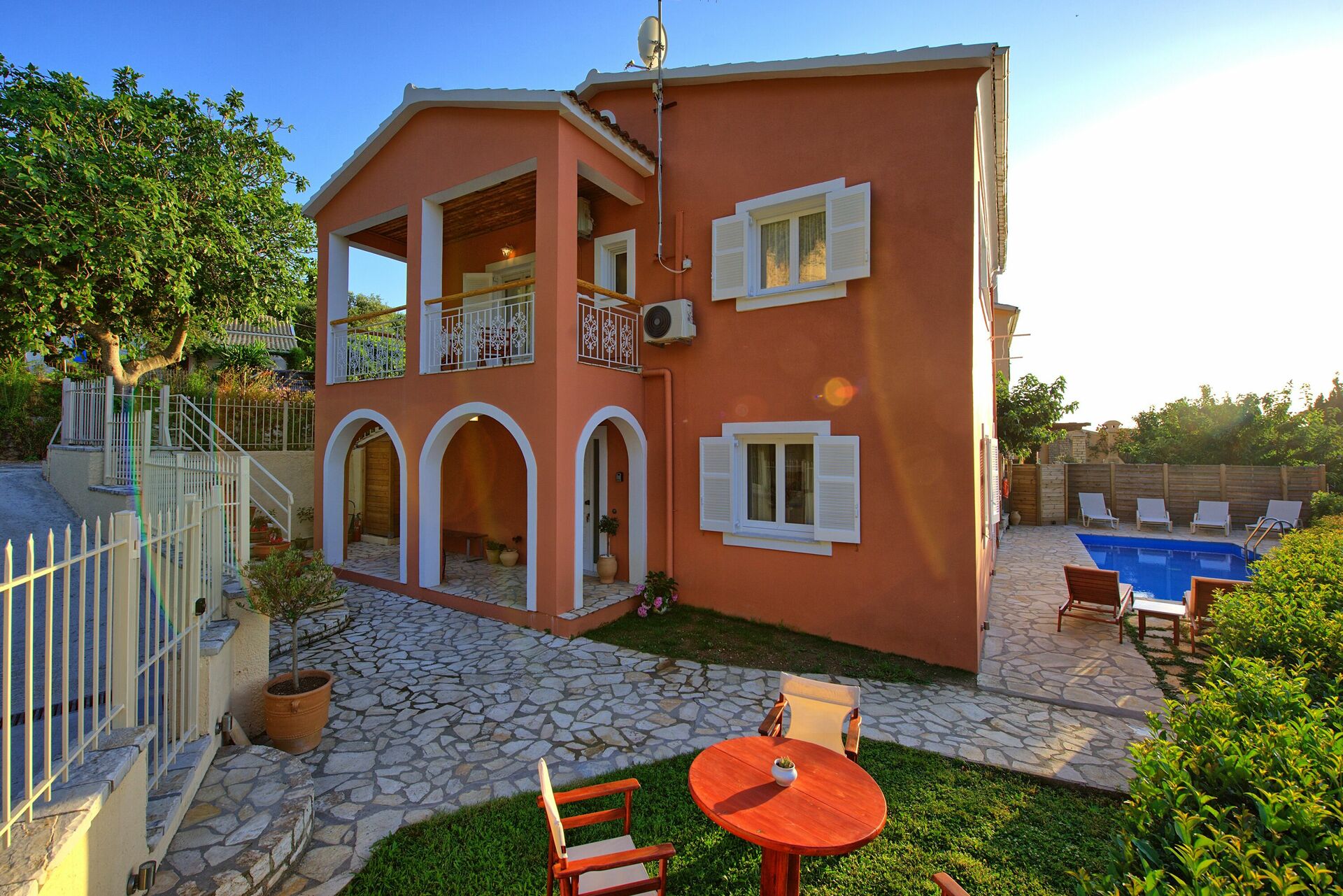 Huset är över 2 våningar och erbjuder en vacker stil som blandar traditionella möbler med moderna element och bekvämligheter. Villan har 3 sovrum, 2 badrum, 1 wc, privat pool och kan bekvämt sova upp till 7 gäster med oslagbart värde för pengarna. På bottenvåningen finns en stor lounge (med soffor, bäddsoffa, matplats, altandörrar till utsidan) samt ett fullt utrustat kök och toalett. Vackra trätrappor leder upp till första våningen där det finns ett stort sovrum med dubbelsäng, ett välkomnande sovrum med dubbelsäng, ett stort badrum med eget badrum och ytterligare ett familjebadrum med badkar. Sovrummen är luftkonditionerade och erbjuder fantastisk utsikt över landskapet, havet och bergen bakom.