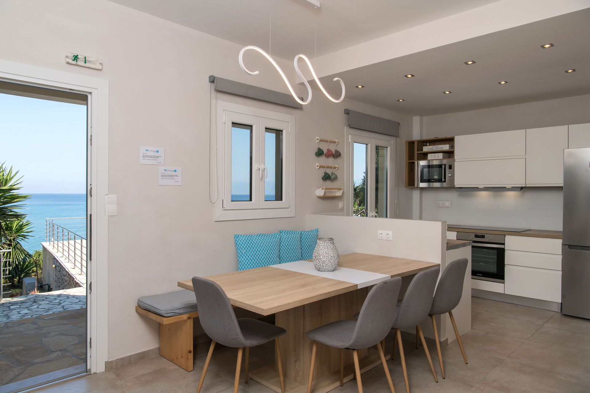 Inomhus är semesterhuset uppdelat på två våningar som är identiska, förbundna med en extern trappa mellan våningarna. Villan rymmer totalt 14/15 gäster.