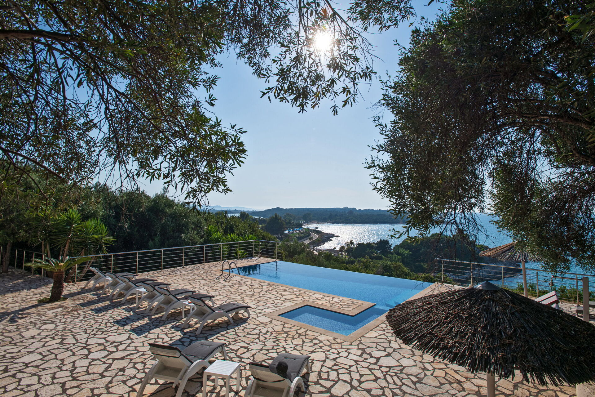 Hela fritidshuset är färdigt och möblerat med det högsta. Villa SeaSun har ett fantastiskt utomhusområde med en unik formad pool (med en egen barnavdelning) för exklusiv användning av gästerna. Huset ligger i ett stort område omgivet av orörd natur. Poolen mäter 9,5 x 5 m och djupet är mellan 1,2 och 1,6 m. På uteplatsen finns även solstolar och parasoller för att njuta av lata dagar under Korfus lysande sol. För dem som gillar att äta ute finns det en trevlig matplats vid poolen. I ett skuggat område finns ett matbord (14 stolar), grill och köksbänk: ett perfekt ställe att njuta av en utsökt måltid medan du ser solen gå ner och båtarna glider förbi ut på havet.