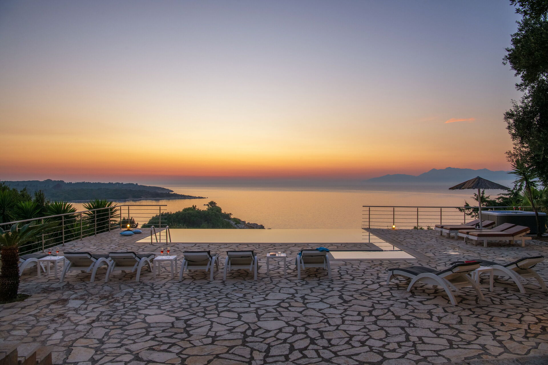 The first impressions of the Villa are the stunning views over the Ionian Sea to Albania and also over the lagoon towards north west Corfu. The sunsets are amazing.
