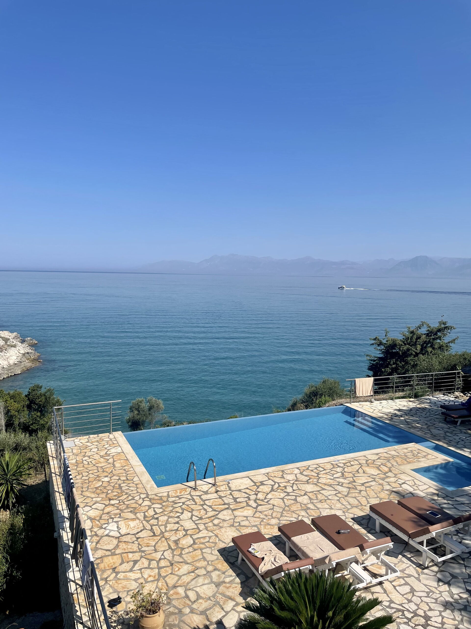 Our party of1 10 7 adults and 3 children 8 to14 spent 10 days at this beautiful Villa.With incredible Views across the sea and to Albania.The outdoor was perfect for our BBQ’s with plenty of seating undercover.The infinity pool and Jacuzi were just a magnet for everyone.We could have done with some more sun shades though 3 was just not enough for 10 people..Situated just minutes walk away from a mini market and supermarket as well as a couple of Tavernas.The lovely beach was also just a short walk away.We had a great stay.A couple of suggestions.Another bin for recycling and some bin liners would be helpful.Also an information book with emergency telephone numbers and local information ie Taxi phone numbers would b also have been helpful