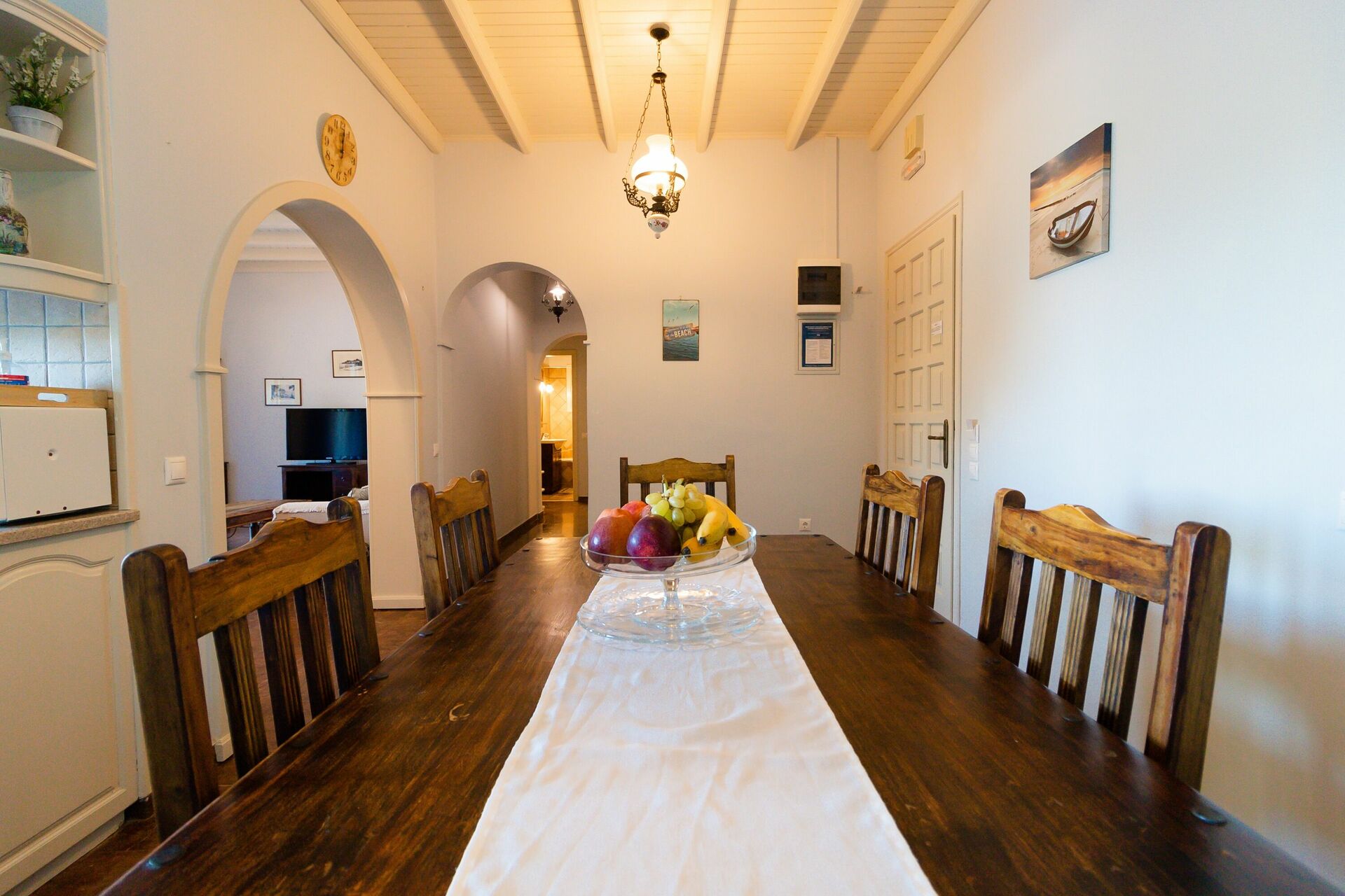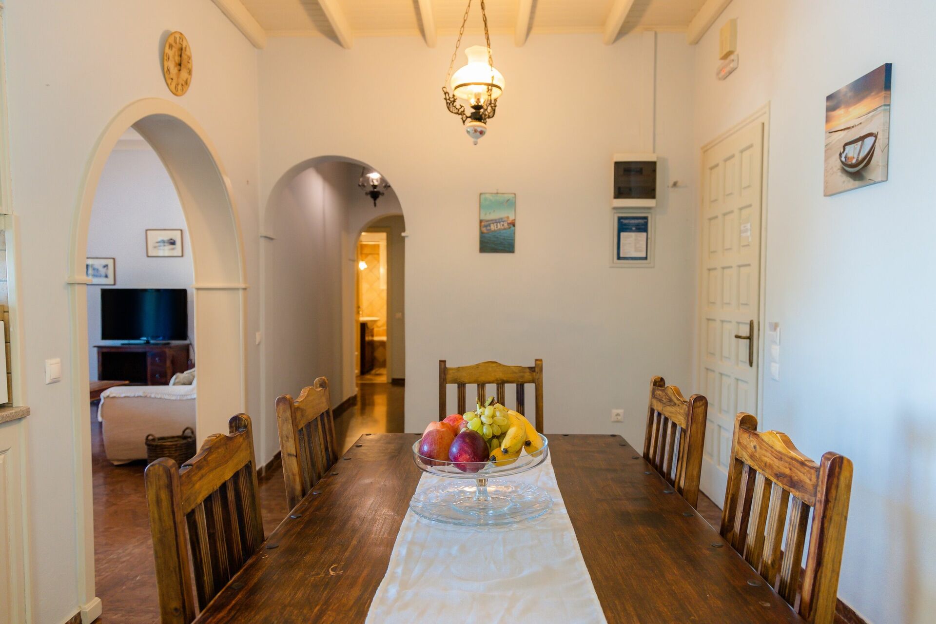 Bottenvåning: kök med halvö intill matsalen, vardagsrum (satellit -TV, DVD -spelare, CD -spelare) ansluten till den täckta uteplatsen, sovrum med dubbelsäng och utgång till uteplatsen, två sovrum med enkelsängar, badrum med dusch och tvättmaskin, badrum med badkar och dusch.
