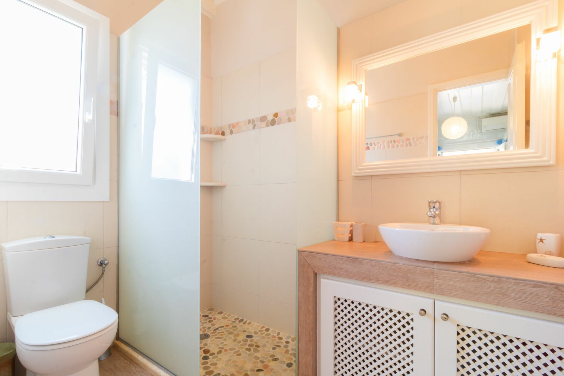 Brett vardagsrum med kök (diskmaskin, mikrovågsugn, ugn, spis), matsal och vardagsrum, master bedroom med eget badrum med dusch och direkt tillgång till terrassen, två sovrum med enkelsängar anslutna till uteplatsen, badrum med dusch, badrum med dusch och tvättmaskin.