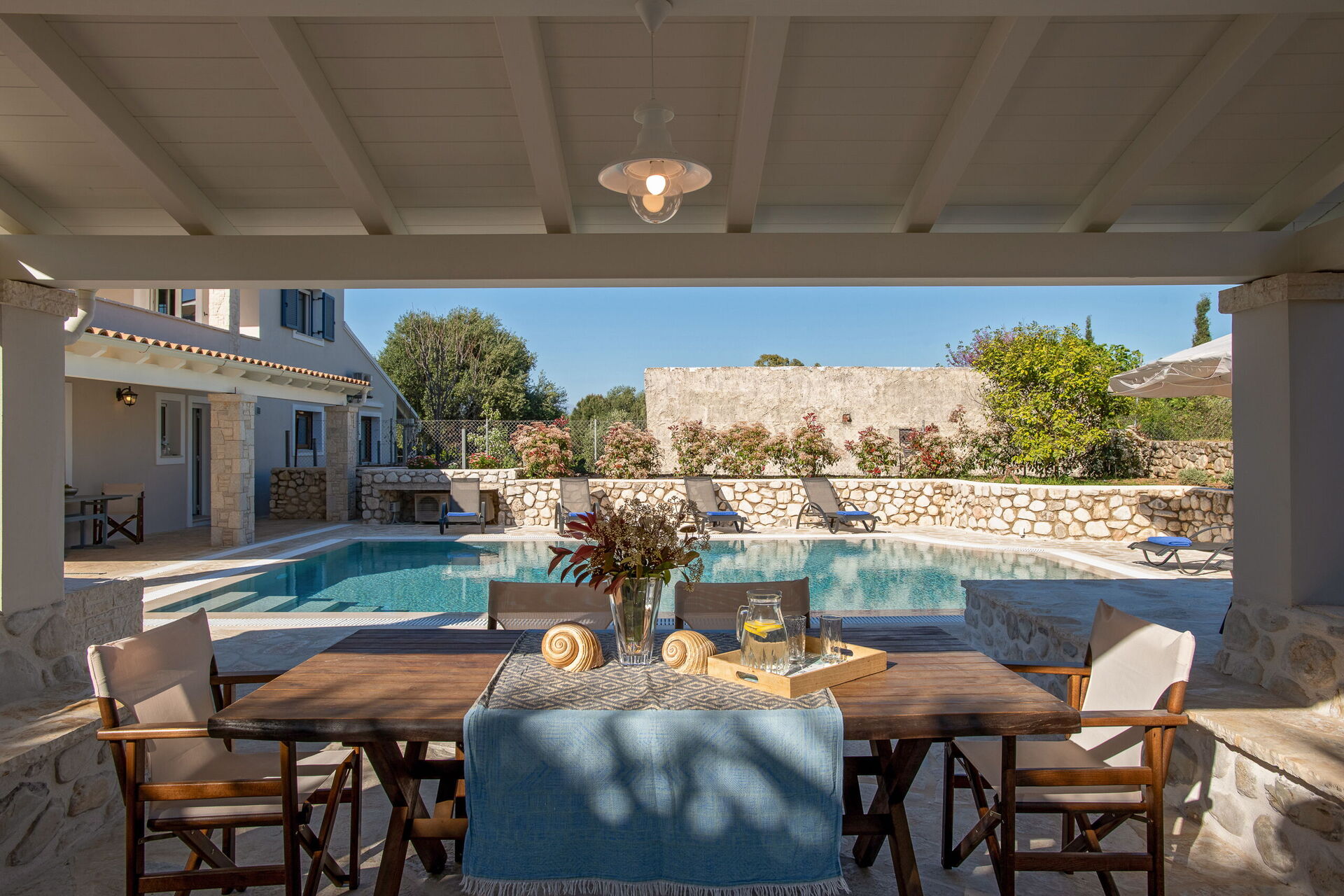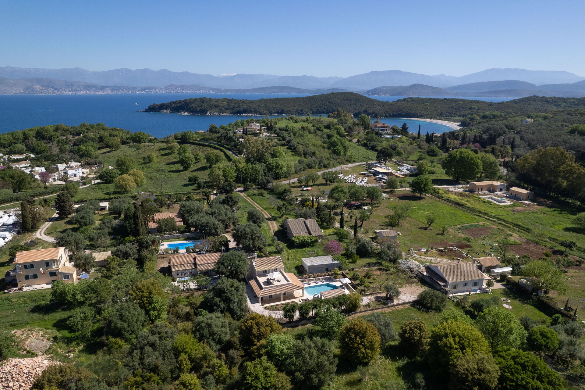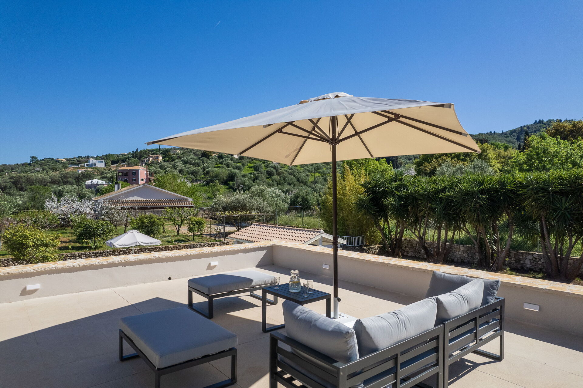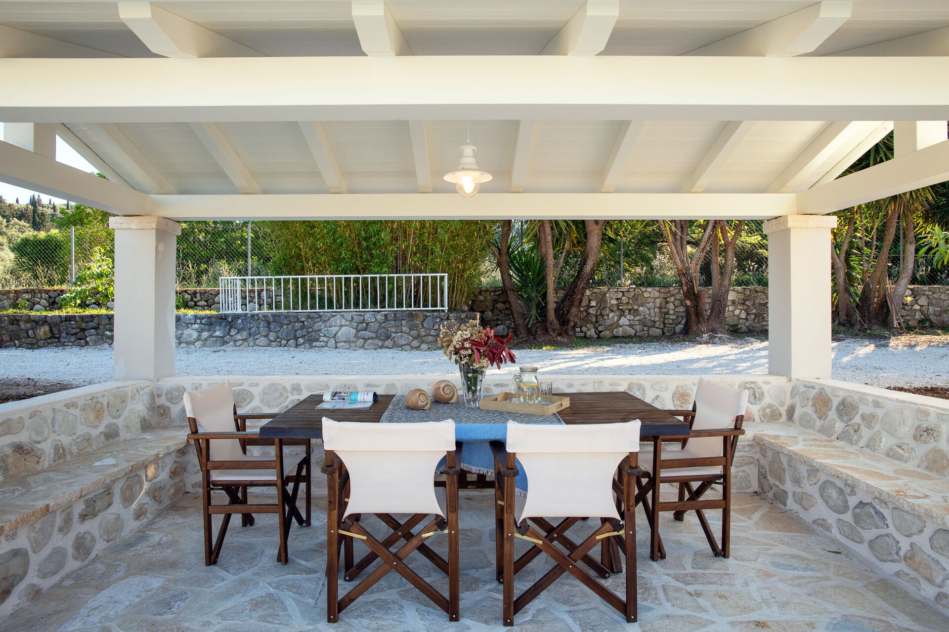 Det rymliga utomhusområdet har gott om gemensamma utrymmen för att njuta av en mysig vistelse med familj eller vänner. Du kan koppla av på verandan som är utrustad för uteservering eller i det stora poolområdet, perfekt för oförglömliga stunder under Korfus sol.