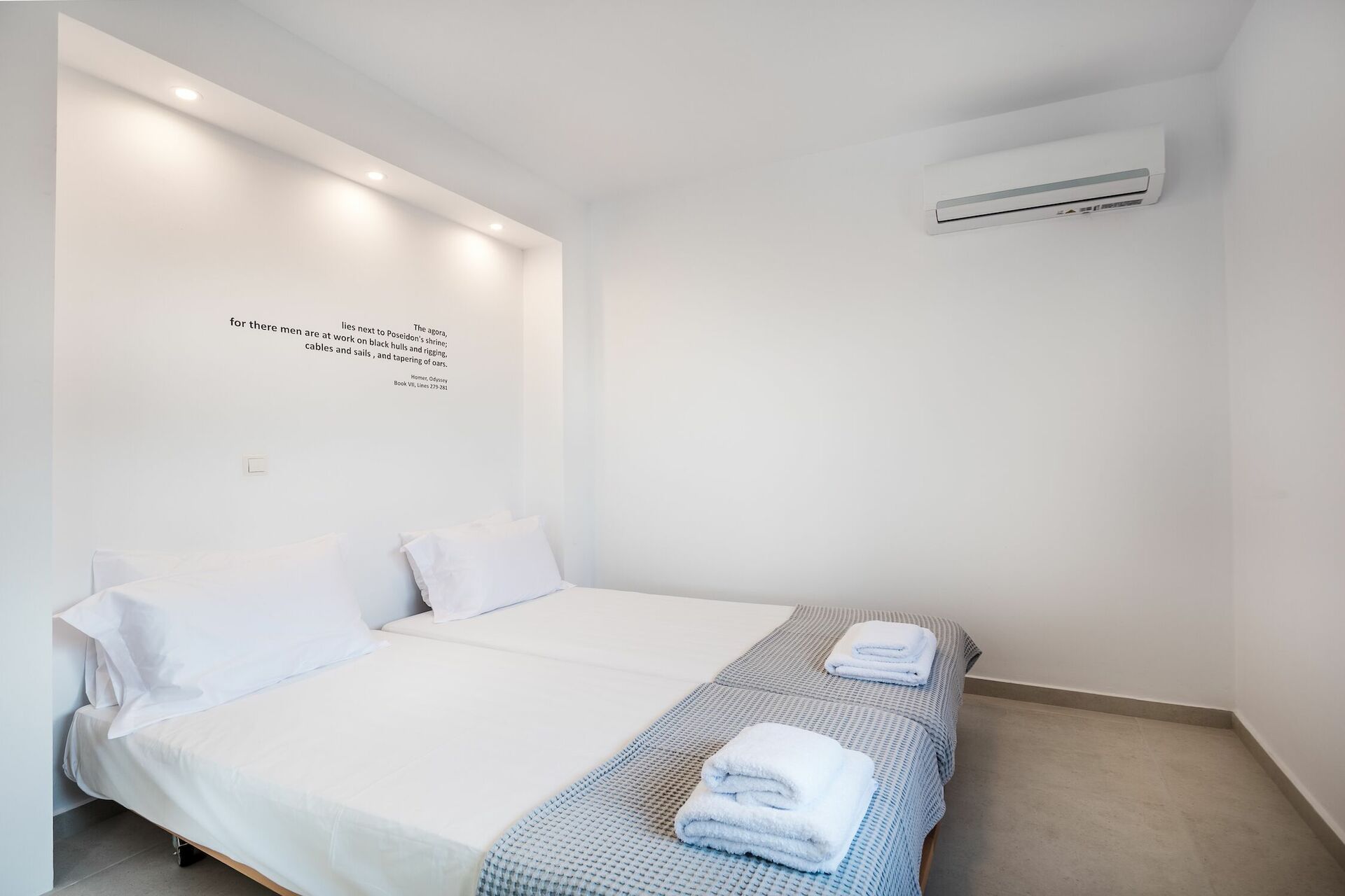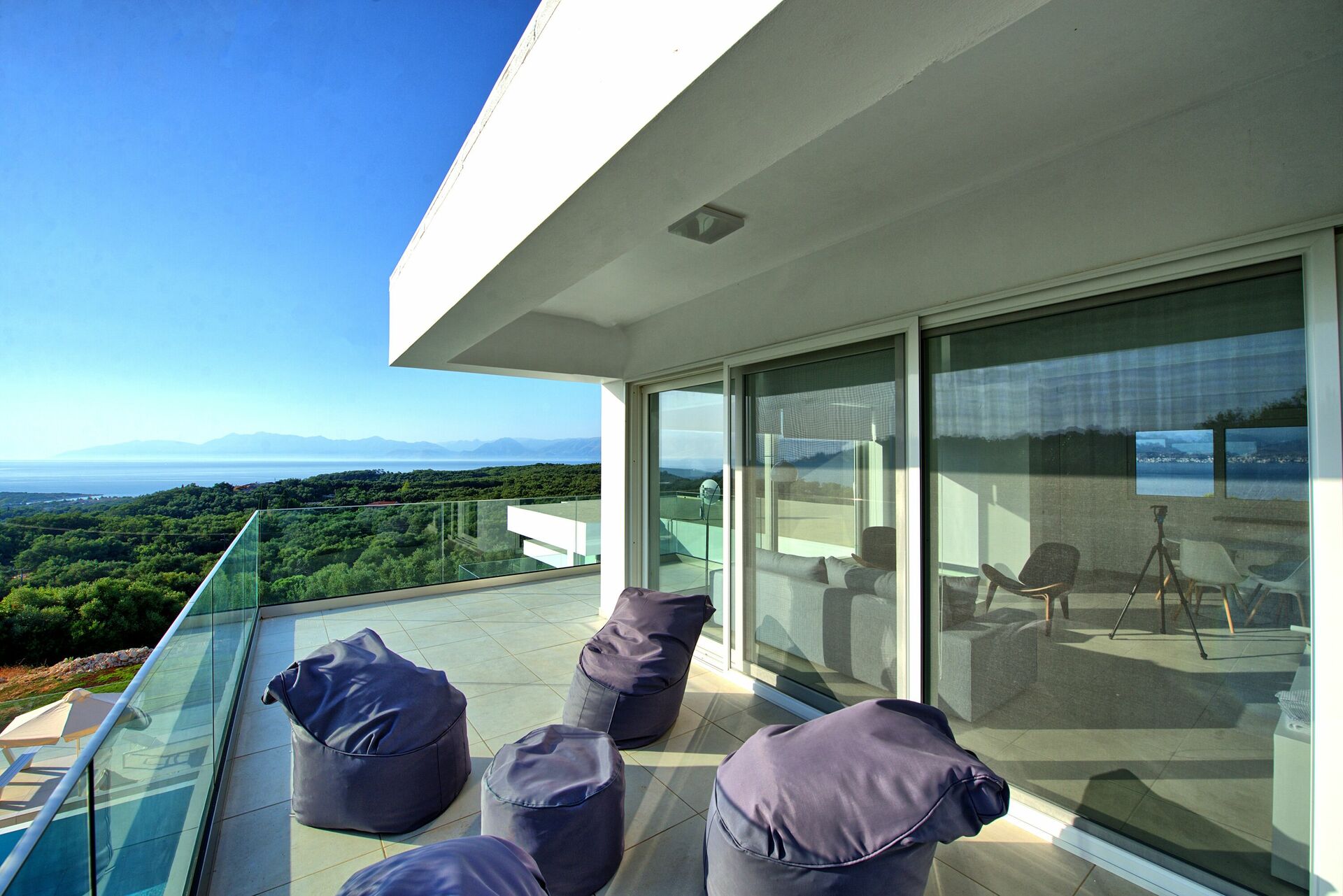 Huset är fördelat på 2 våningar som är förbundna med en sidotrappa. Villa Athena har stora altandörrar, stora fönster och designmöbler och har därför ljusa rum. På bottenvåningen finns ett rymligt vardagsrum (soffor, wi-fi, luftkonditionering) med angränsande kök (fullt utrustat) samt 2 sovrum (båda med privat badrum). Ett sovrum har en dubbelsäng + en soffa (som kan omvandlas till en enkel bäddsoffa i full storlek), medan det andra sovrummet har två enkelsängar. Övre våningen är identisk med den nedre, förutom att sovrummet endast har en dubbelsäng och inte en extra bäddsoffa. Det finns en stor terrass på båda våningarna med vacker utsikt över Joniska havet och den albanska kusten nedanför.