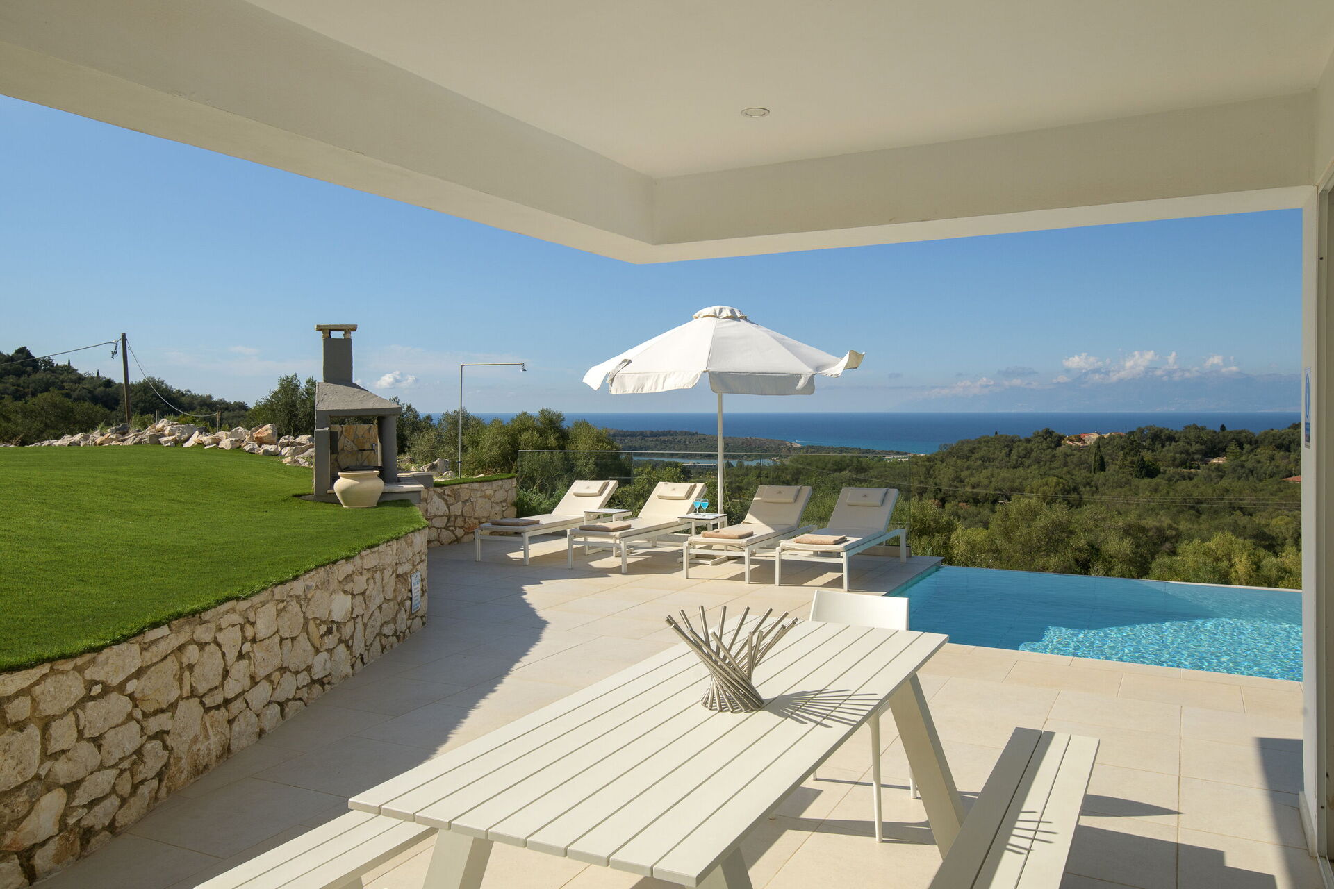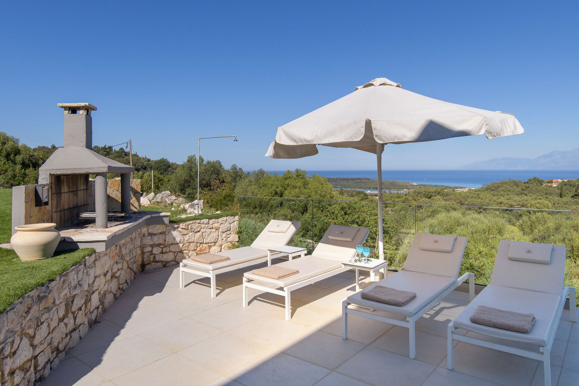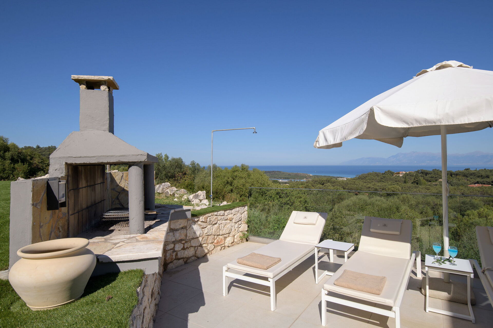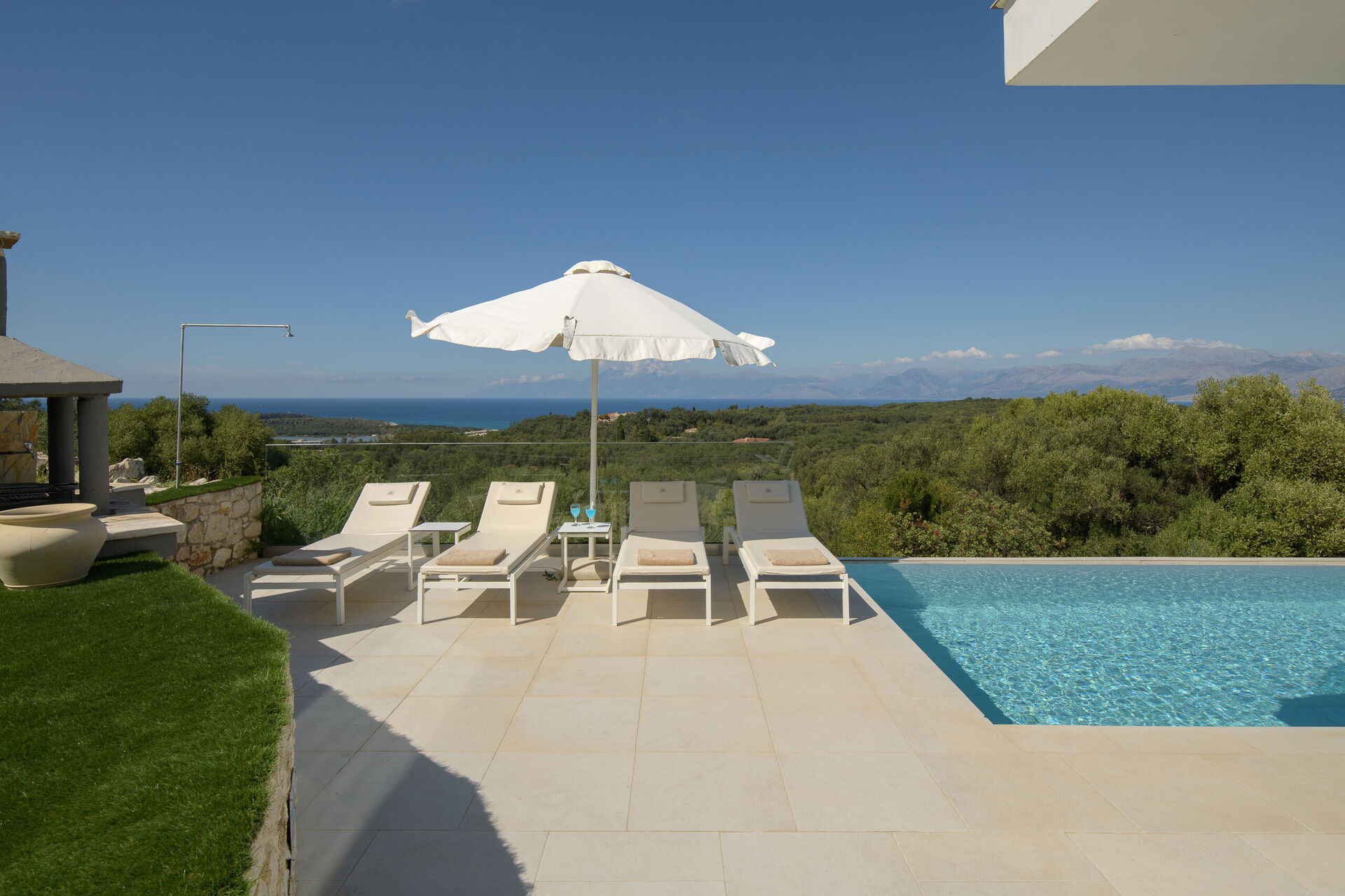 I utomhusområdet finns vackra asfalterade uteplatser med solstolar så att alla gäster kan njuta av den sensationella havsutsikten. En matplats och grill finns tillgängliga så att gästerna kan njuta av utomhus måltider. Den privata poolen mäter 7,5 m x 5,7 m (djup 1,5 m) och är vackert upplyst på natten (tillgång via romerska trappsteg).