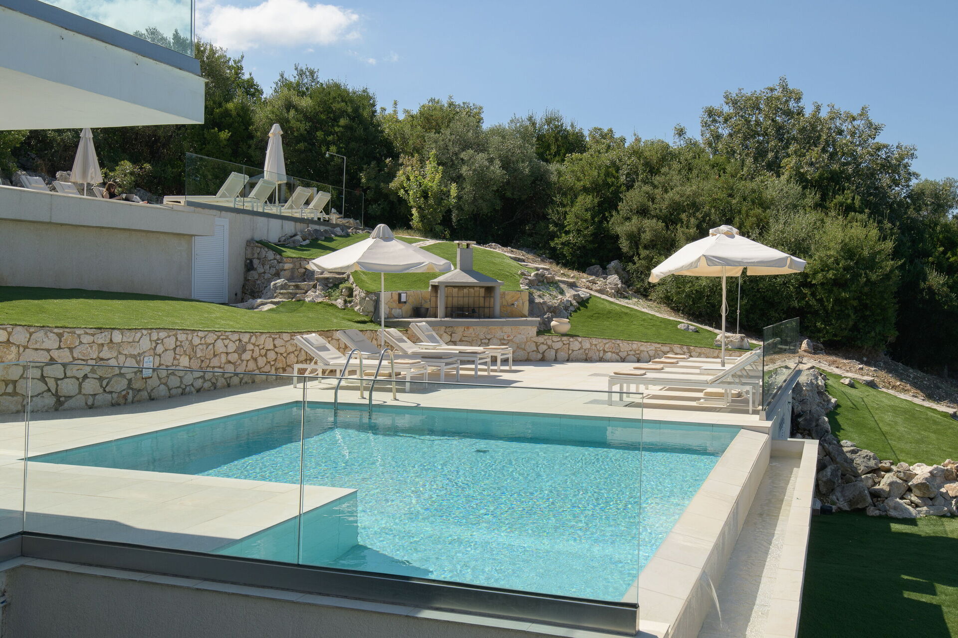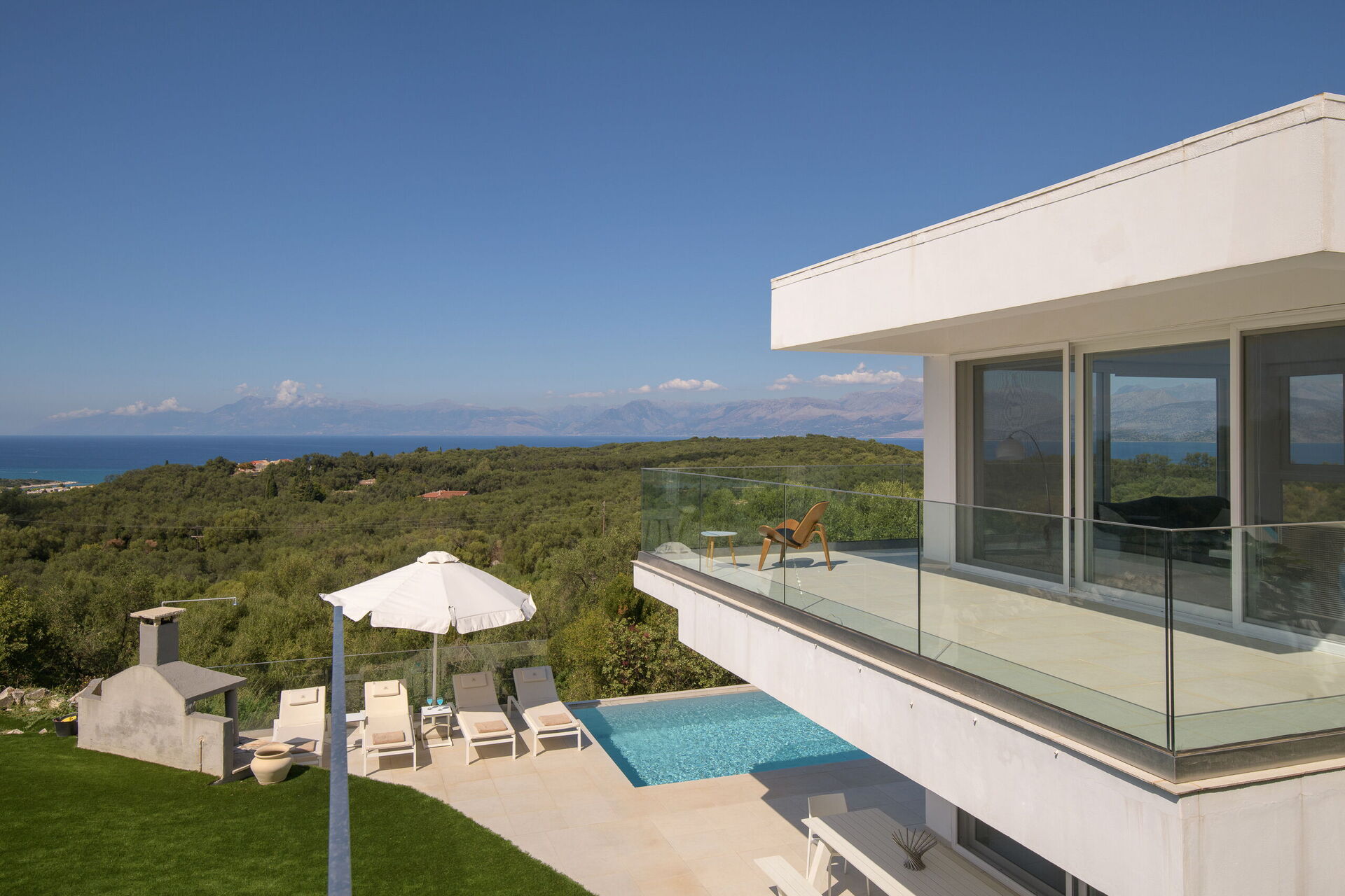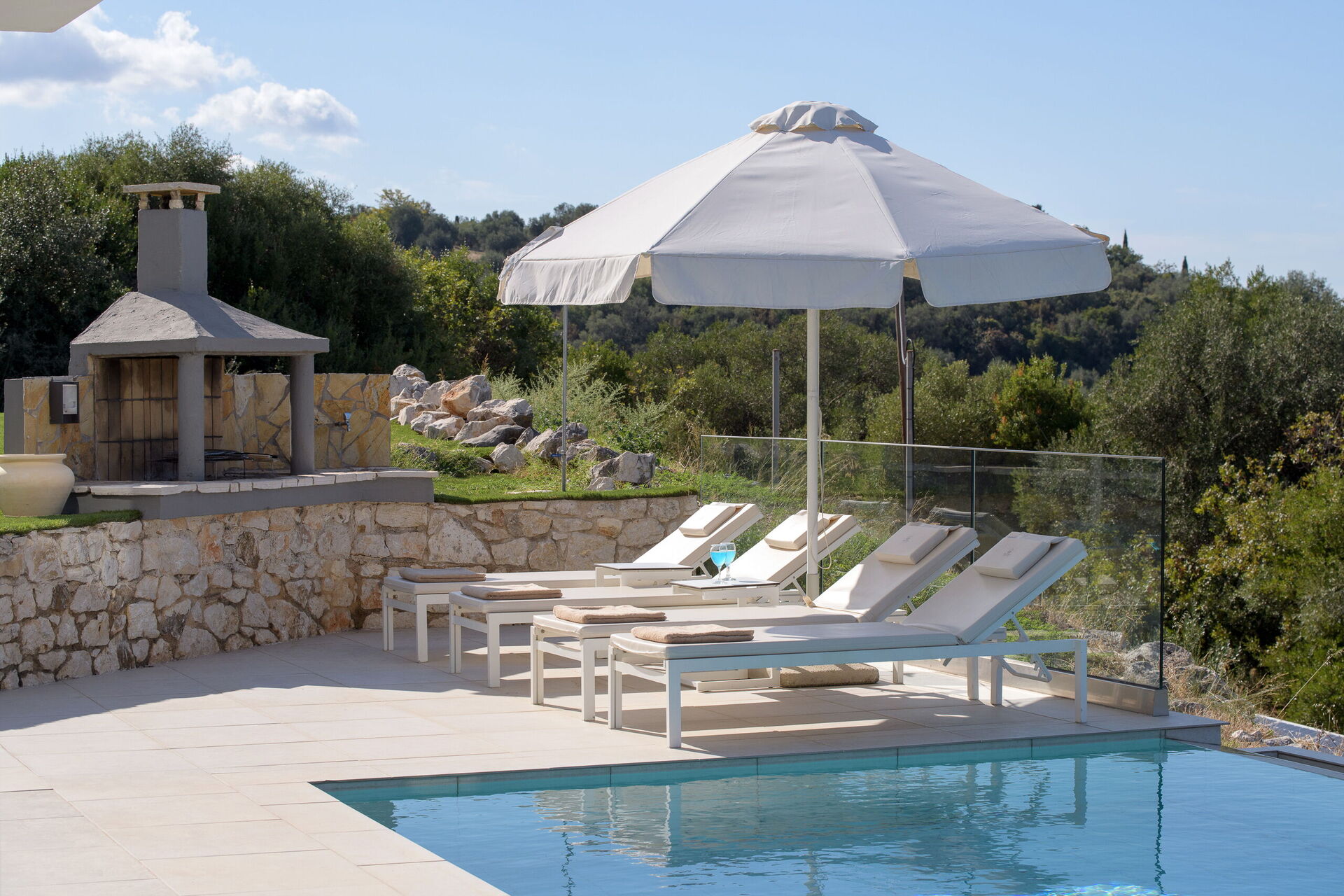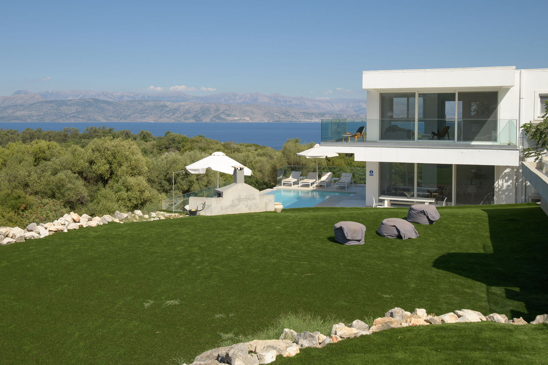 I utomhusområdet finns vackra asfalterade uteplatser med solstolar så att alla gäster kan njuta av den sensationella havsutsikten. En matplats och grill finns tillgängliga så att gästerna kan njuta av utomhus måltider. Den privata poolen mäter 7,5 m x 5,7 m (djup 1,5 m) och är vackert upplyst på natten (tillgång via romerska trappsteg).