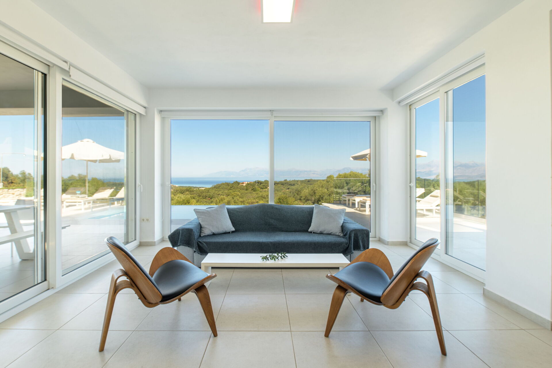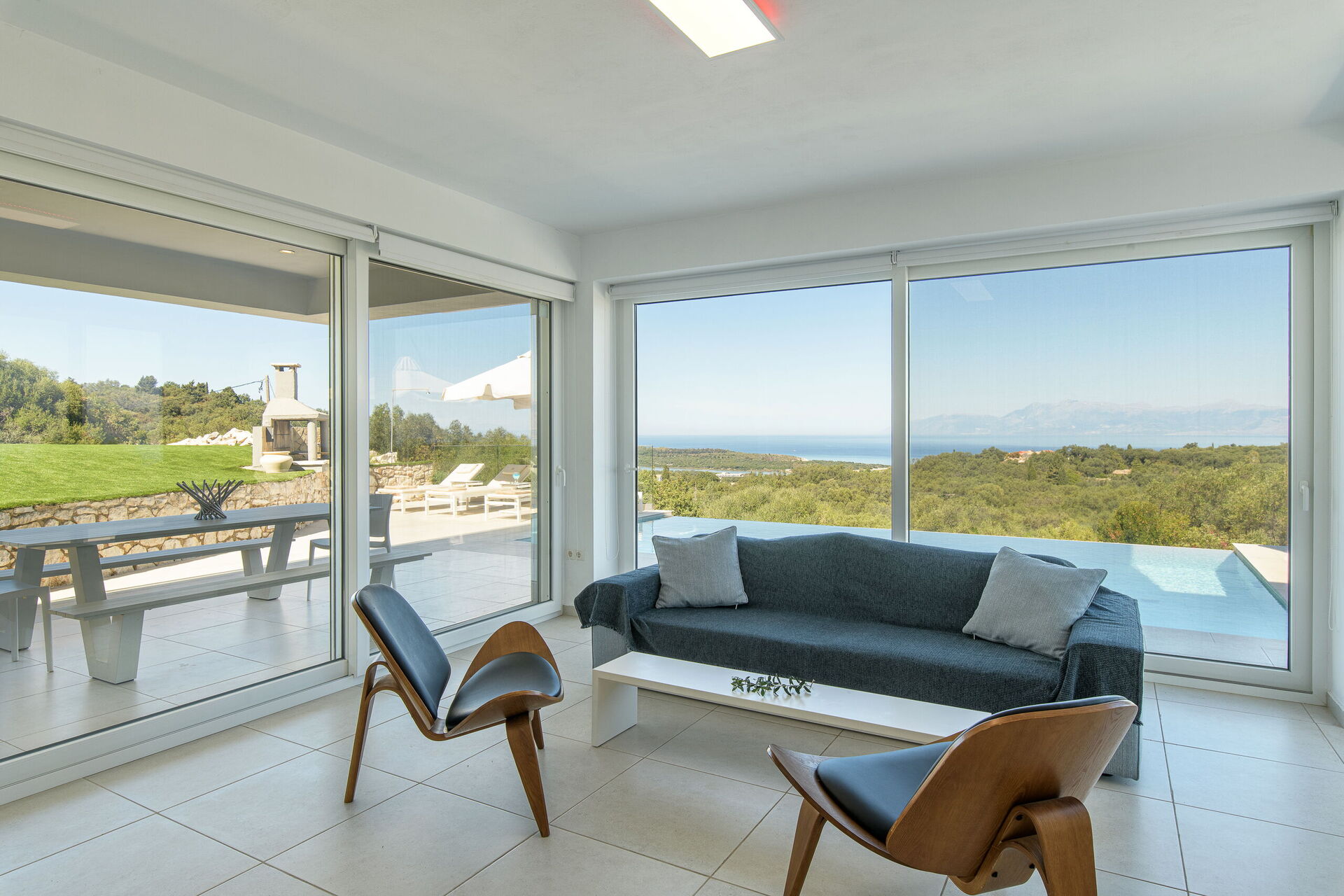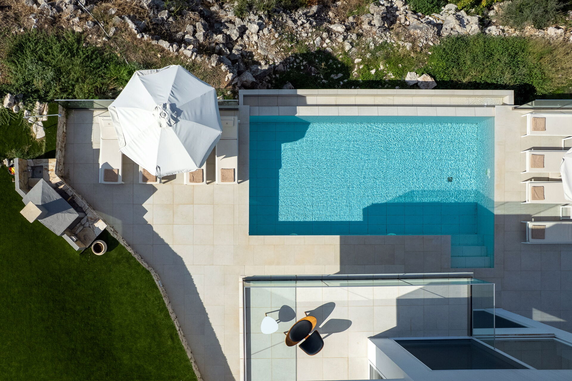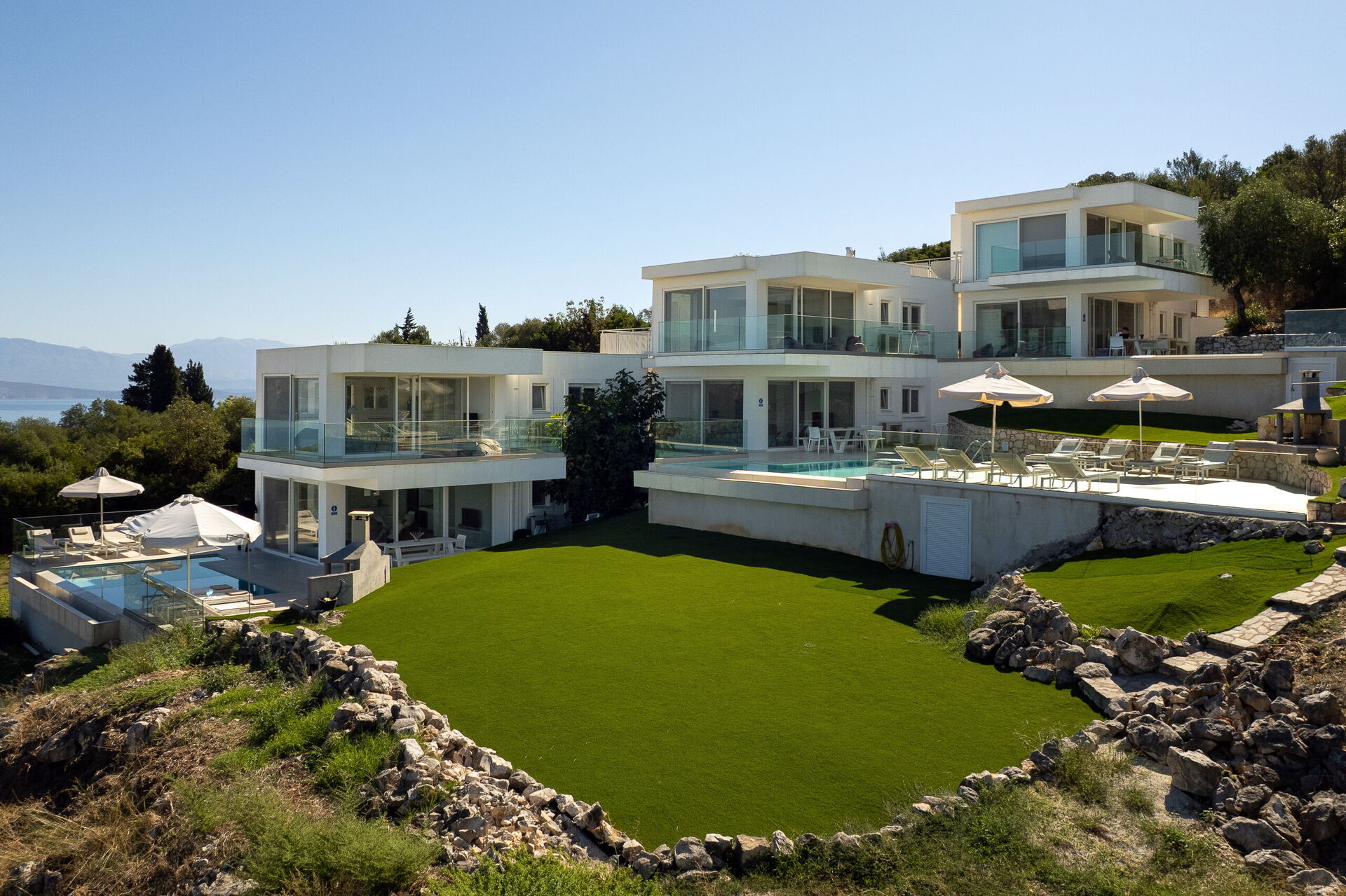 I utomhusområdet finns vackra asfalterade uteplatser med solstolar så att alla gäster kan njuta av den sensationella havsutsikten. En matplats och grill finns tillgängliga så att gästerna kan njuta av utomhus måltider. Den privata poolen mäter 7,5 m x 5,7 m (djup 1,5 m) och är vackert upplyst på natten (tillgång via romerska trappsteg).