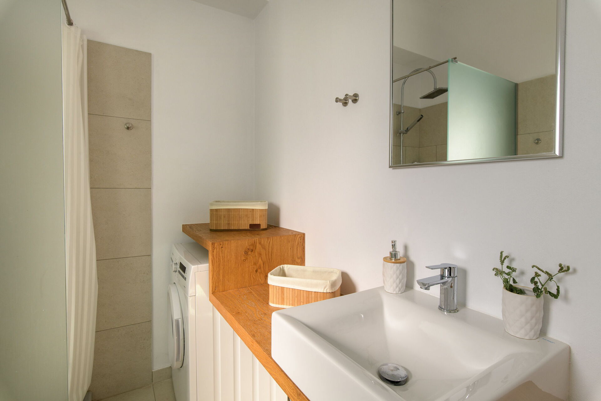 Bottenvåning: vardagsrum (luftkonditionering, platt-TV, soffor, fåtölj, wi-fi internet) med matplats och fullt utrustat kök (ugn, diskmaskin, kyl, frys, brödrost, vattenkokare) med stora altandörrar som öppnar mot utomhus, tvåbäddsrum (luftkonditionering) med badrum med duschrum, dubbelrum + enkelsäng med eget badrum med dusch (tvättmaskin)