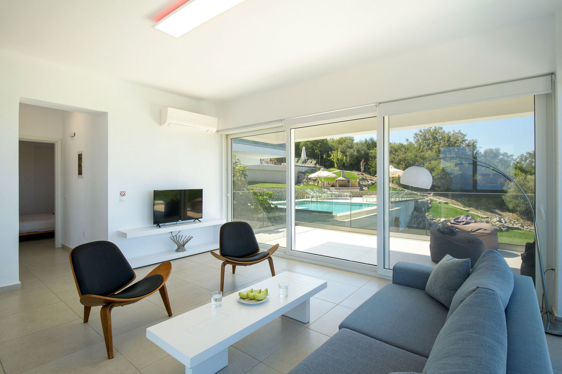 Really great place with stunning views, lovely pool and excellent air conditioning! Notes - the villas are split into two apartments which means you get two kitchens, two living rooms and two outdoor areas; great perk. The hosts left a bottle of wine on arrival which was a lovely touch. There is plenty of spare towels and bedding etc. Pros - great space for entertaining, stunning and well-maintained property, comfy beds, good showers, and good location (secluded but within 10mins walk of a few shops and restaurants) Cons - the hill up to the villas is quite steep but still perfectly manageable, getting a taxi into the closest towns can be a bit tricky at busy times (though this is true of most of Corfu) and there were quite a lot of insects when you say out at night with the lights on. In summary a fantastic place I wouldn't hesitate to recommend!