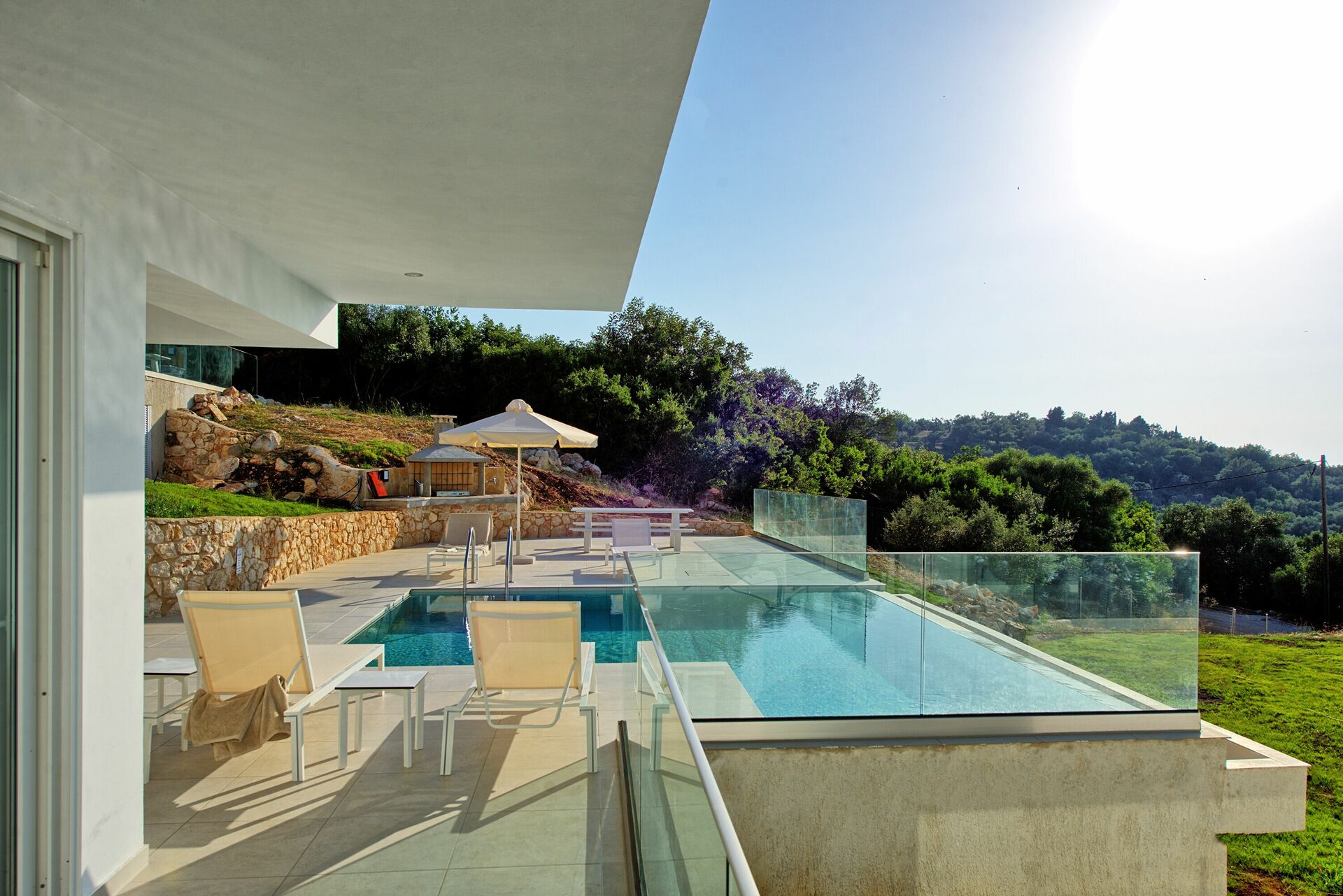We had a wonderful holiday, villa is very nice with all the essential amenities with stunning views across to Albania. Pool area is lovely with plenty of space and sunbeds, and although villa is in the middle of 3, privacy was not an issue. The only negative is that the villa is split onto 2 levels with no internal staircase, but we made this work by making sure the key was always put back in the lock box. The villa is in the North East part of Corfu, which we found to be the nicest area. The local village / harbour of Kassiopi is stunning with wonderful restaurants, cocktail bars, shops and supermarket. Further along the coastline is Kalami (where The Durrells was filmed) - this is a lovely spot, along with Agni Bay (next bay round) - the restaurants at Agni Bay can be accessed by boat from Kalami which makes it extra special. Local beach of Agios Spyridon is sandy with very shallow water, nice lunch-time restaurants. Would definitely recommend this villa / area but would note that a car is ESSENTIAL.