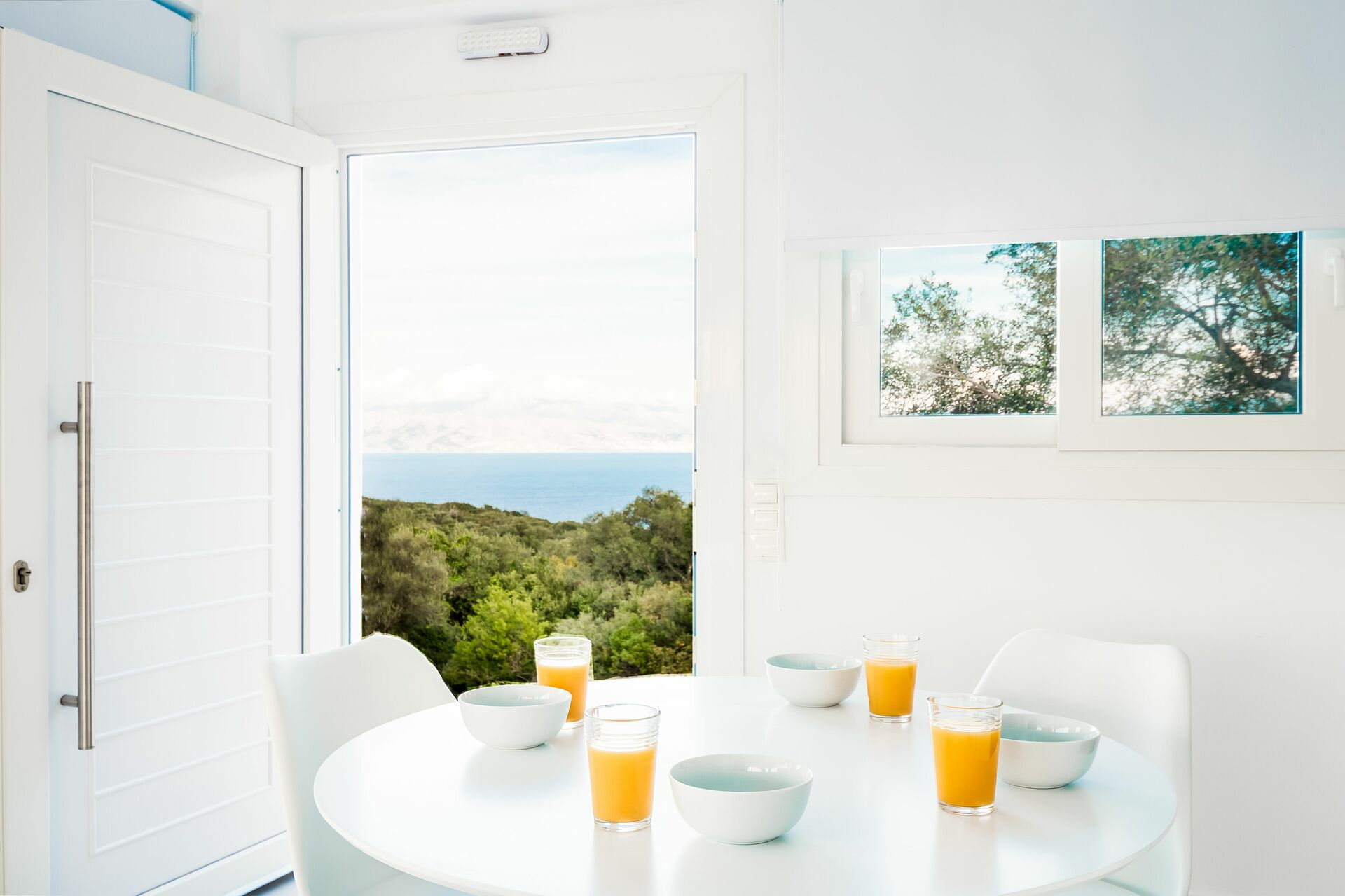 Inuti är huset fördelat på två våningar som är sammanlänkade med en sidotrappa. Villa Arete har stora altandörrar, designmöbler, stora fönster som släpper in mycket ljus. På bottenvåningen finns ett rymligt vardagsrum (soffor, wi-fi, luftkonditionering) med angränsande kök (fullt utrustat) samt 2 sovrum (båda med privat badrum). Ett sovrum har en dubbelsäng + en soffa (som kan omvandlas till en enda bäddsoffa i full storlek) medan det andra sovrummet har två enkelsängar. Övre våningen är identisk med den nedre, förutom att sovrummet endast har en dubbelsäng och inte en extra bäddsoffa. Stora terrasser på båda våningarna erbjuder magisk utsikt över Joniska havet och den albanska kusten bortom.