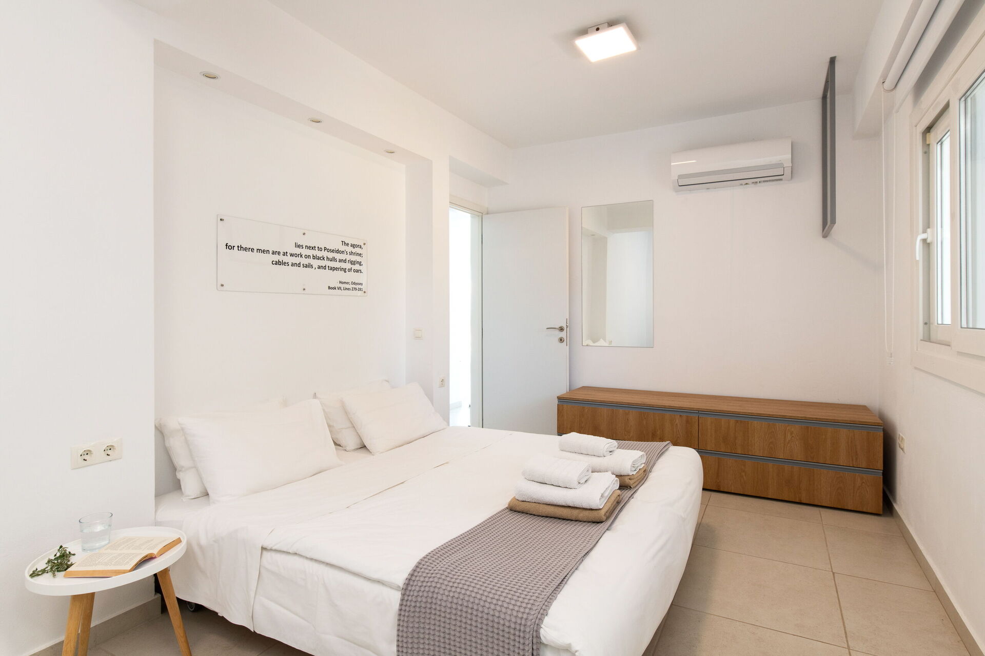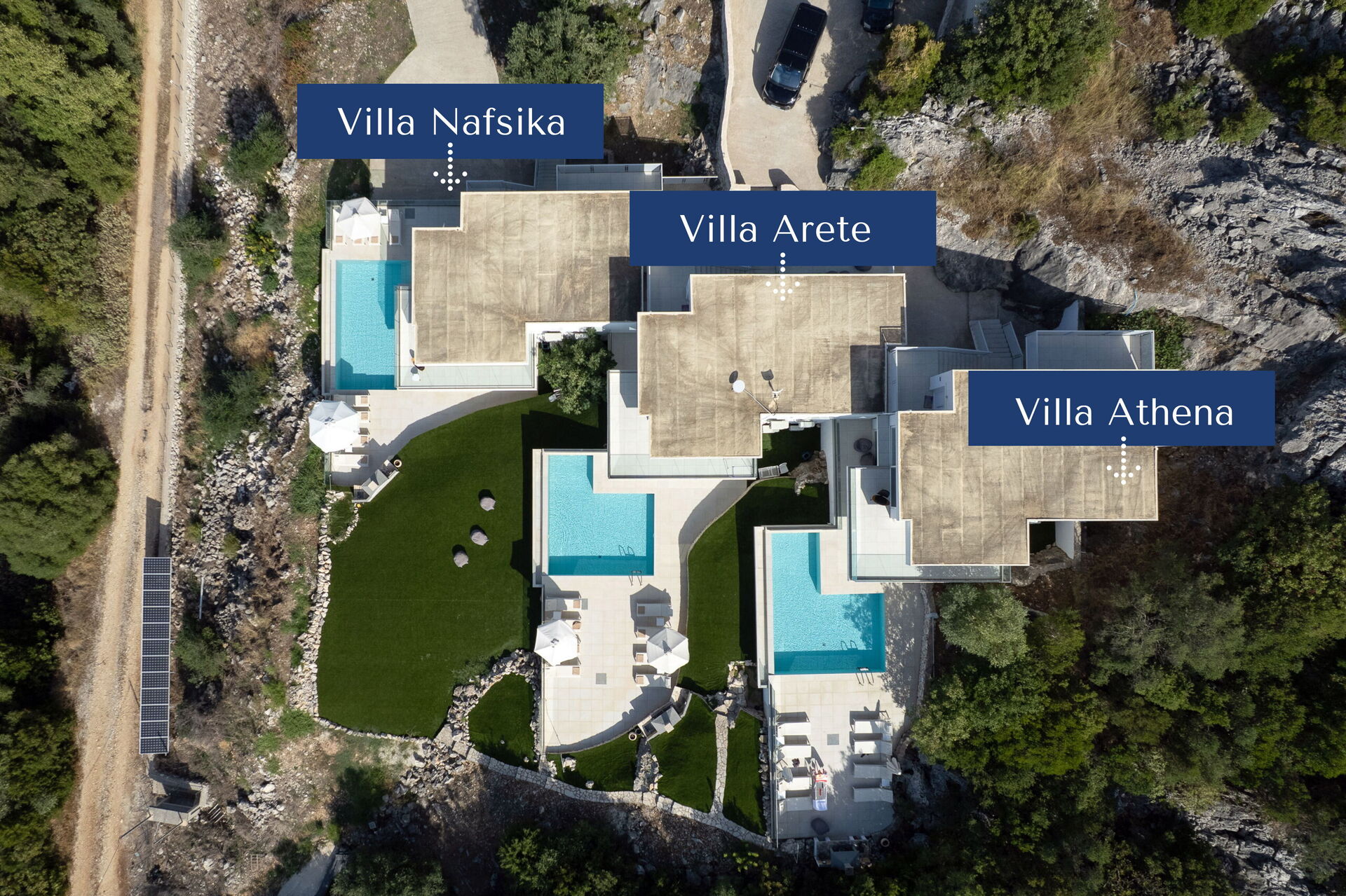 Inuti är huset fördelat på två våningar som är sammanlänkade med en sidotrappa. Villa Arete har stora altandörrar, designmöbler, stora fönster som släpper in mycket ljus. På bottenvåningen finns ett rymligt vardagsrum (soffor, wi-fi, luftkonditionering) med angränsande kök (fullt utrustat) samt 2 sovrum (båda med privat badrum). Ett sovrum har en dubbelsäng + en soffa (som kan omvandlas till en enda bäddsoffa i full storlek) medan det andra sovrummet har två enkelsängar. Övre våningen är identisk med den nedre, förutom att sovrummet endast har en dubbelsäng och inte en extra bäddsoffa. Stora terrasser på båda våningarna erbjuder magisk utsikt över Joniska havet och den albanska kusten bortom.
