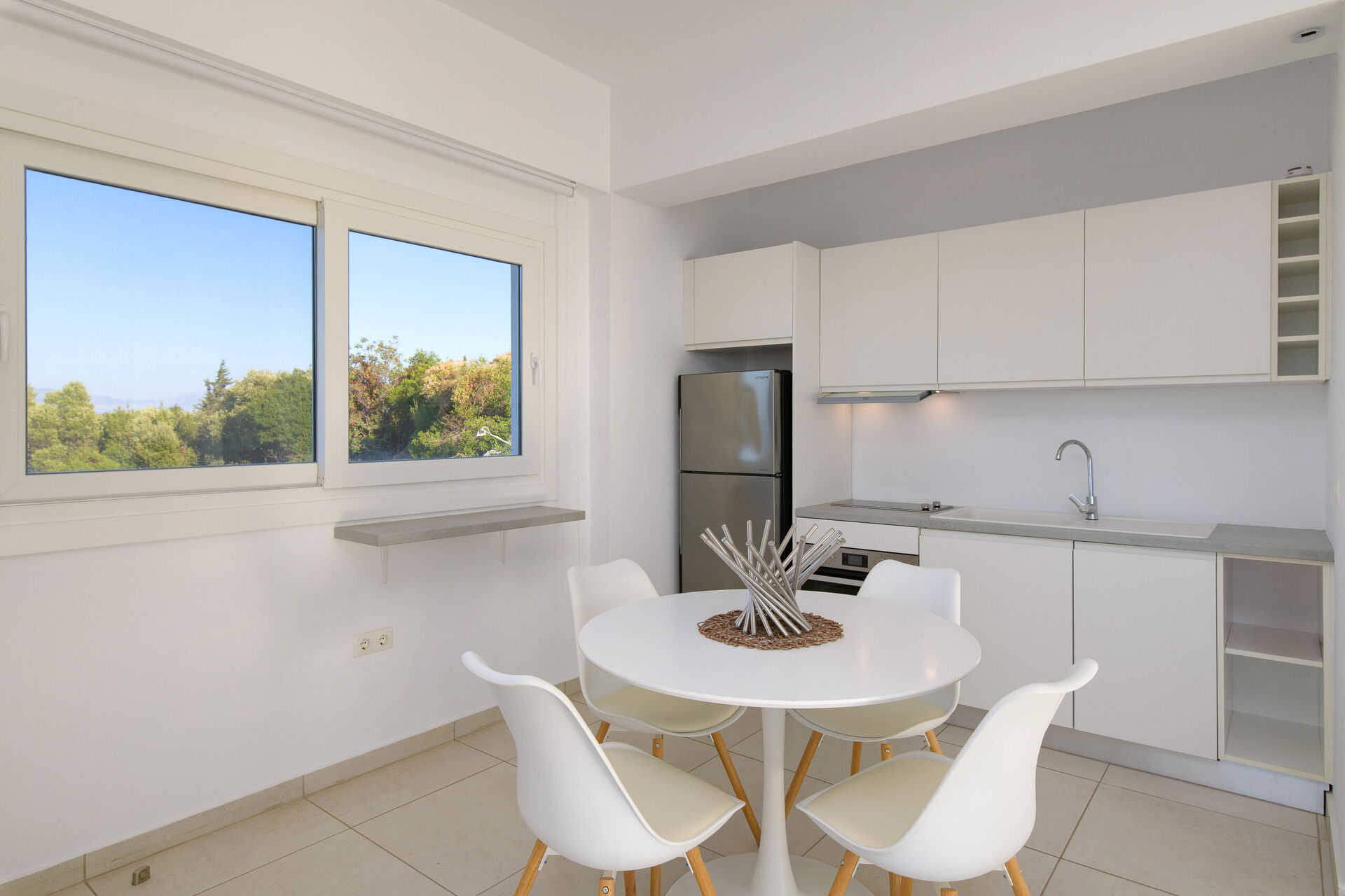 Villa Arete is one of three villas within the Perithia Sea View Villas complex. Each villa consists of 2 separate apartments with 2 bedrooms plus 2 bathrooms and a living room with an open-plan kitchen in each apartment. Everything is arranged simply, in the so-called ikea style but comfortable. Downstairs there is a large terrace with a swimming pool and a place for sunbathing, grilling and dining. Upstairs there is a large terrace and balcony. We needed the whole villa for our nine - 5 adults and 4 children (3,5,10 and 12 years old)