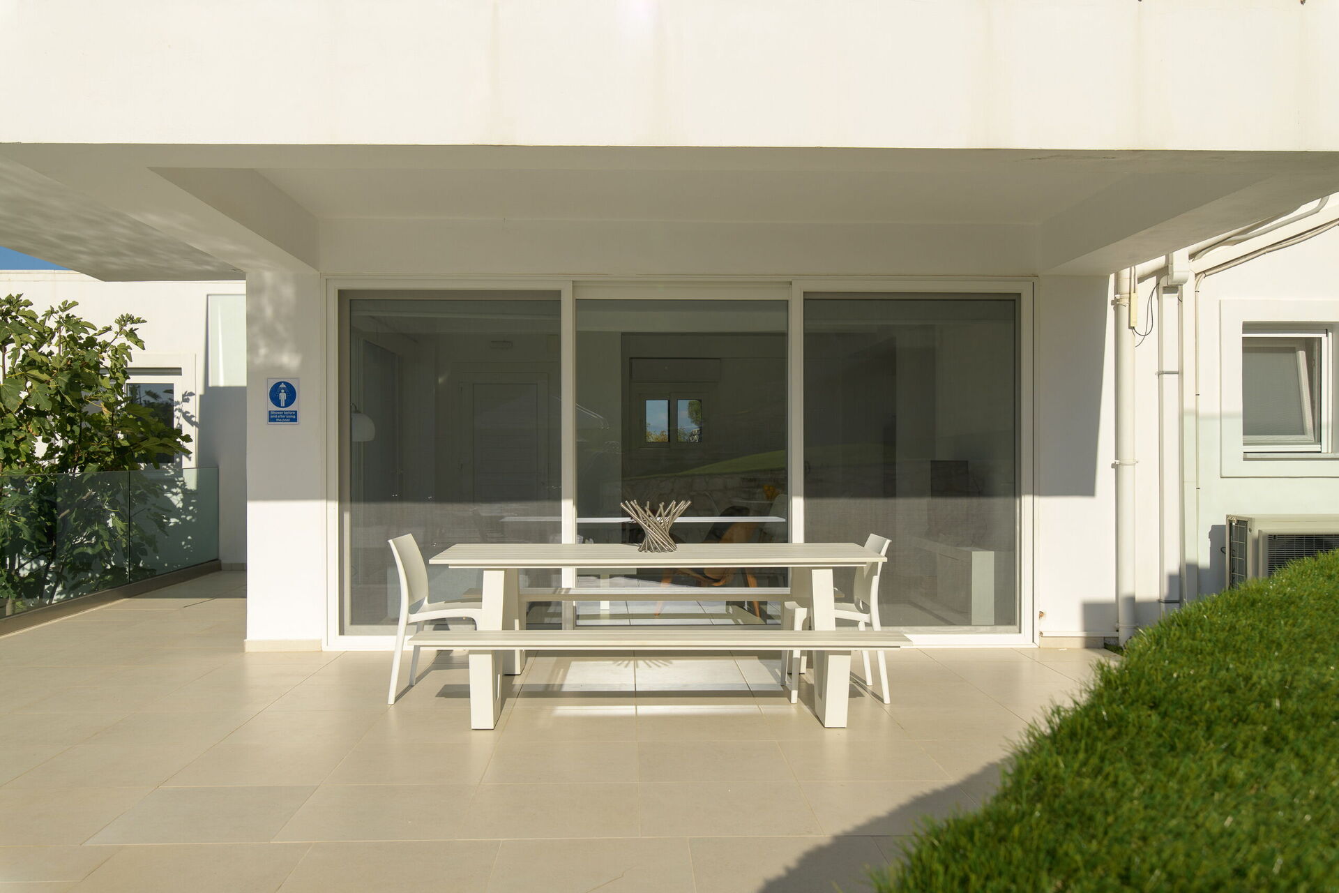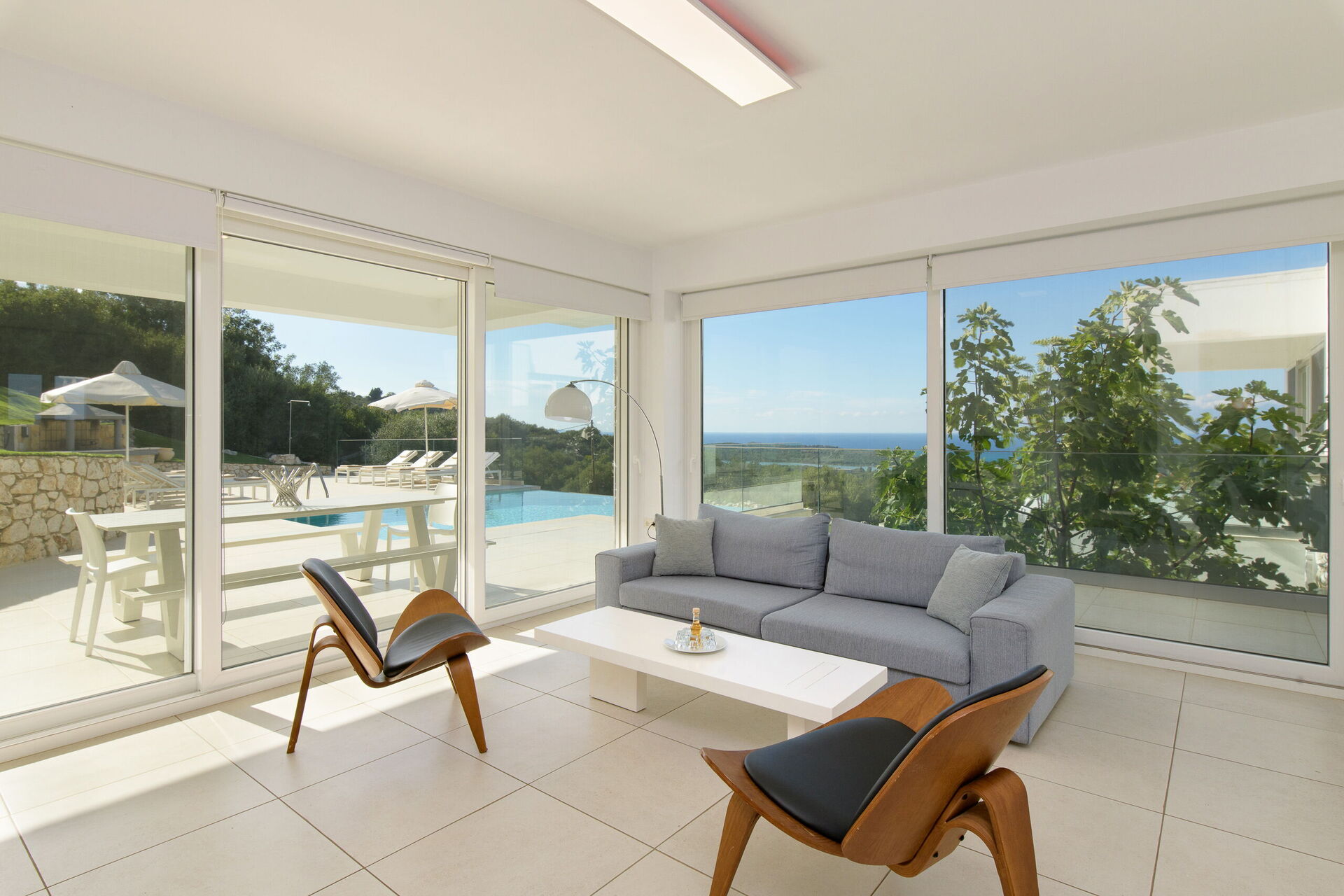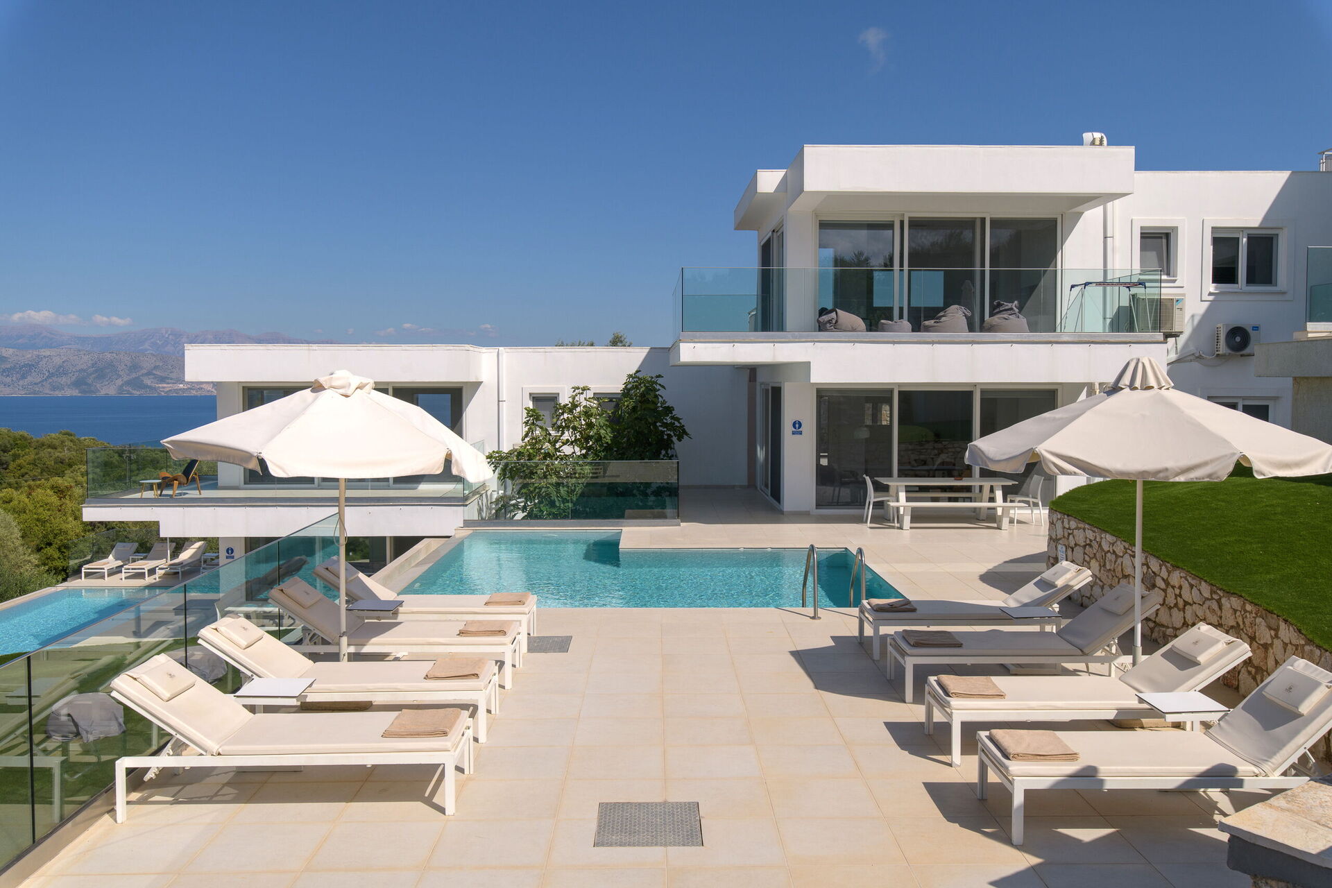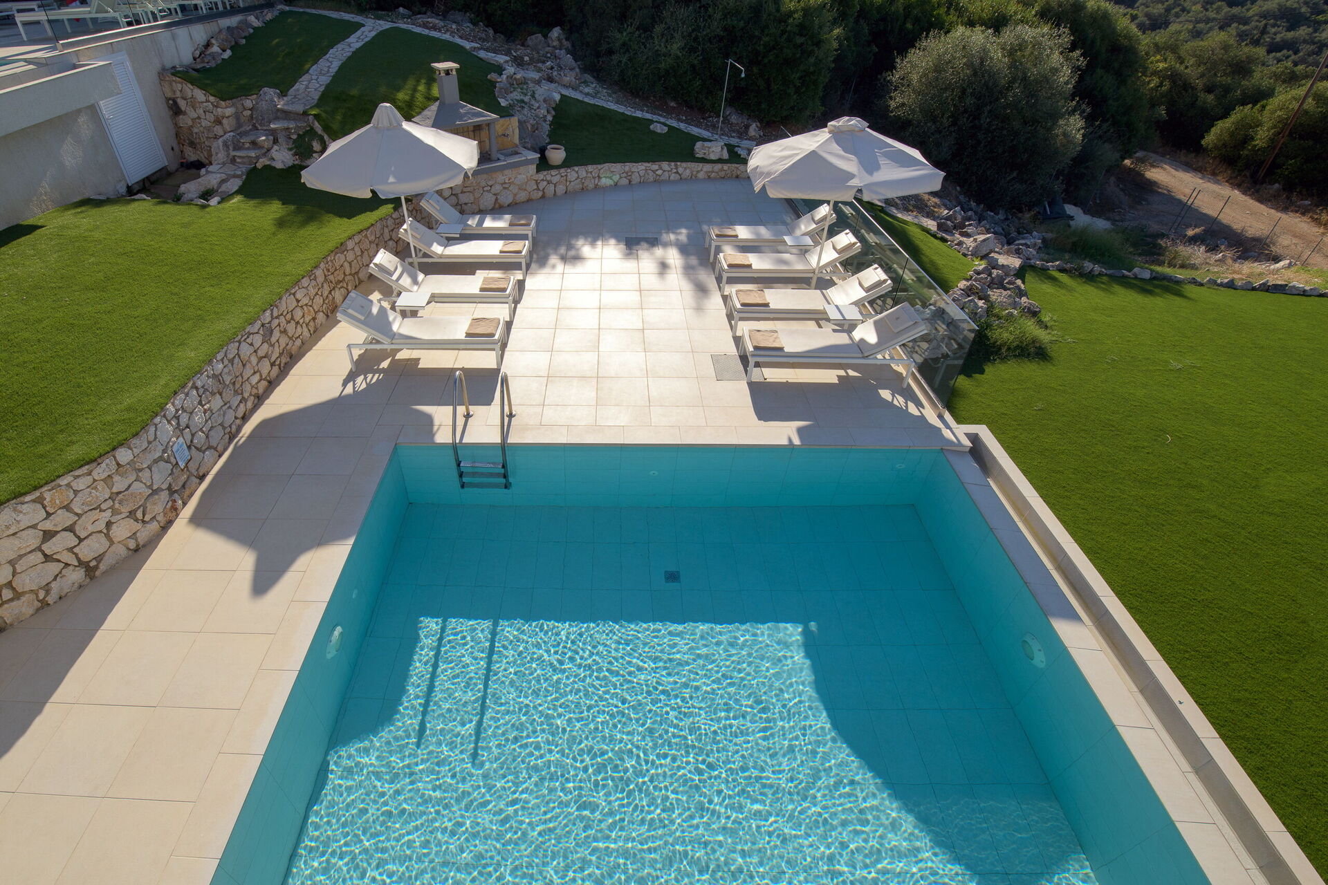 På utomhusområdet hittar du vackra asfalterade uteplatser med utemöbler för alla gäster att njuta av den vackra utsikten över havet. En matplats för gästerna tillsammans med en grill finns för läckra utomhus måltider. Den privata poolen mäter 7,5 m x 5,7 m (djup 1,5 m) och är vackert upplyst på natten (tillgång via romerska trappsteg).
