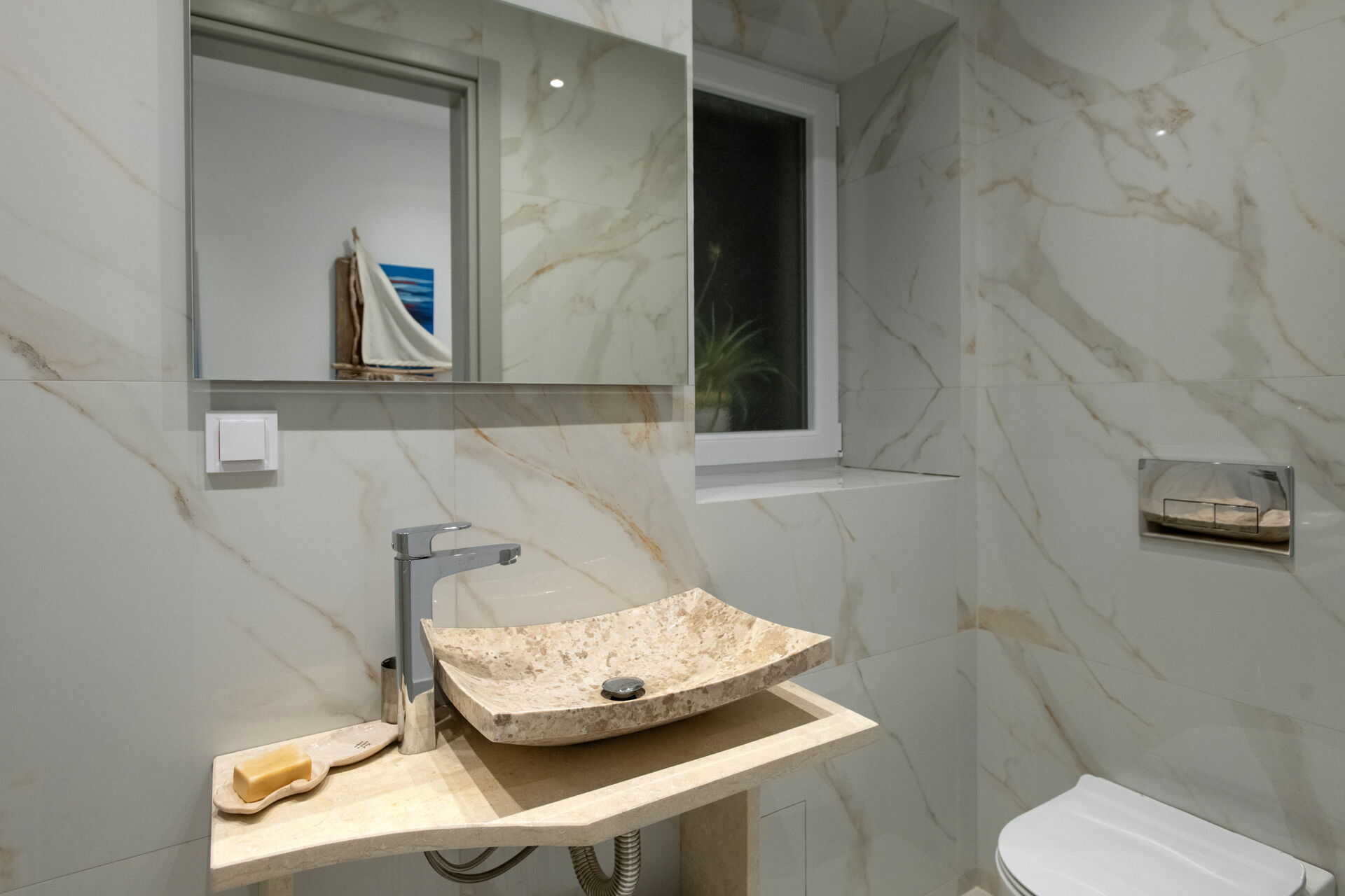 Bottenvåning: stor, ljus vardagsrumsdel bestående av vardagsrum (smart-TV) med matplats och kök (ugn, frys, kylskåp, diskmaskin, mikrovågsugn, espressomaskin, amerikansk kaffebryggare, brödrost), wc, dubbelrum med privat badrum med dusch.