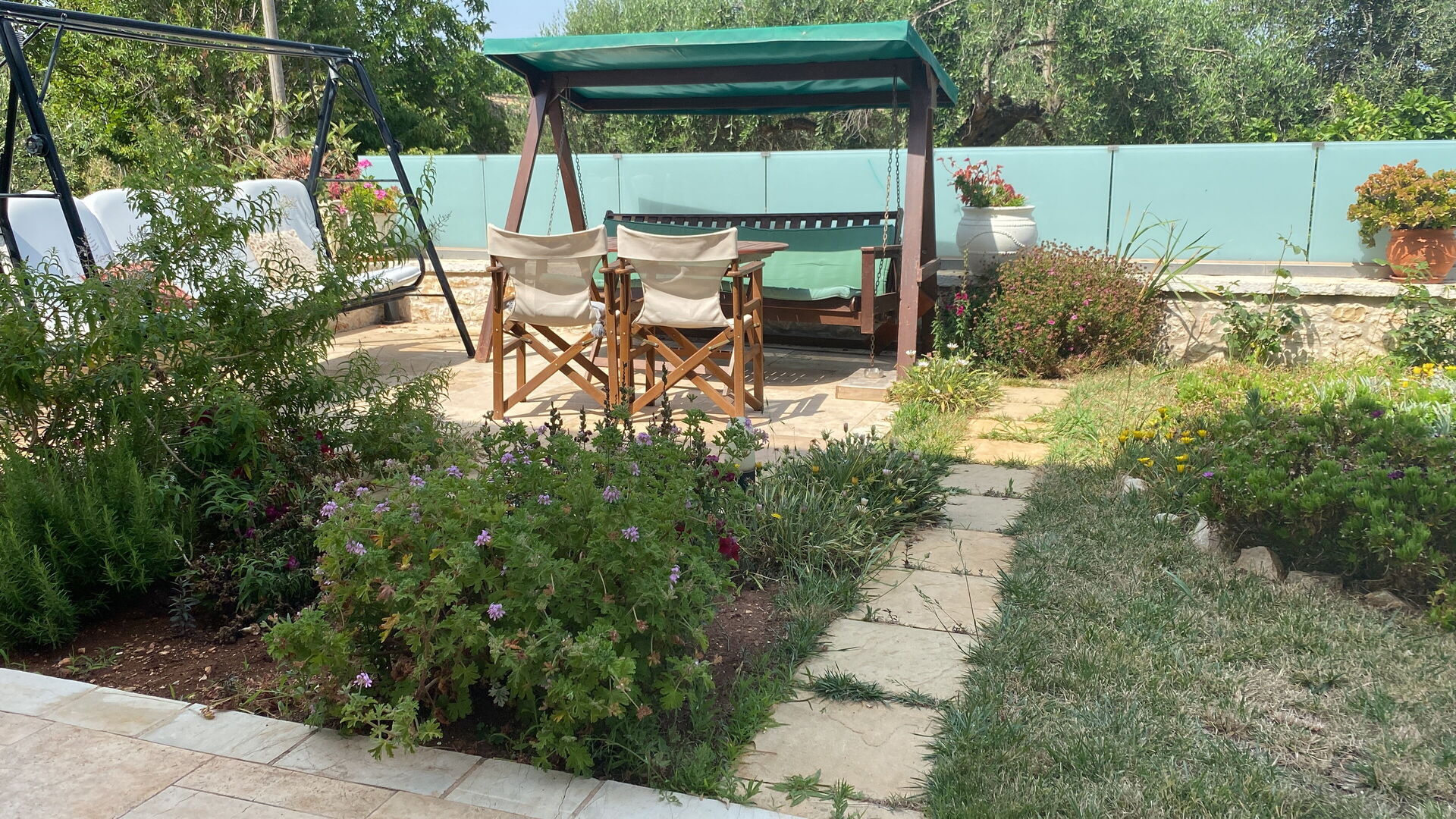 Huset är omgivet av ett skyddat utomhusområde utrustat för att äta utomhus, samt en vacker trädgård full av blommor och växter. På husets andra våning finns en stor terrass med stolar och fåtöljer.