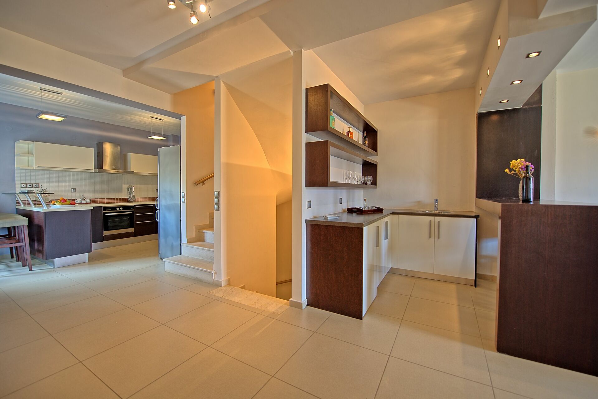 Första våningen: stort vardagsrum (satellit -TV) med matplats, barhörn (kylskåp) och kök (ugn, frys, diskmaskin, amerikansk kaffebryggare, mikrovågsugn); Denna våning har också direkt tillgång utifrån.