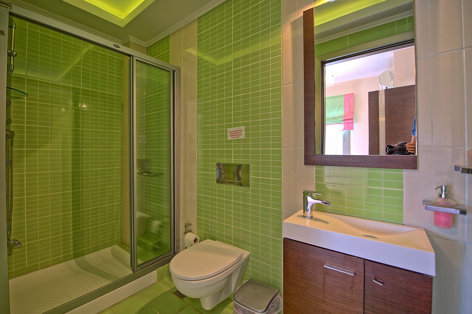 Bottenvåning: vardagsrum (satellit -TV) och gymhörna (löpband, viktmaskin); dubbelrum; badrum med dusch (utan fönster); rum med tvättmaskin.