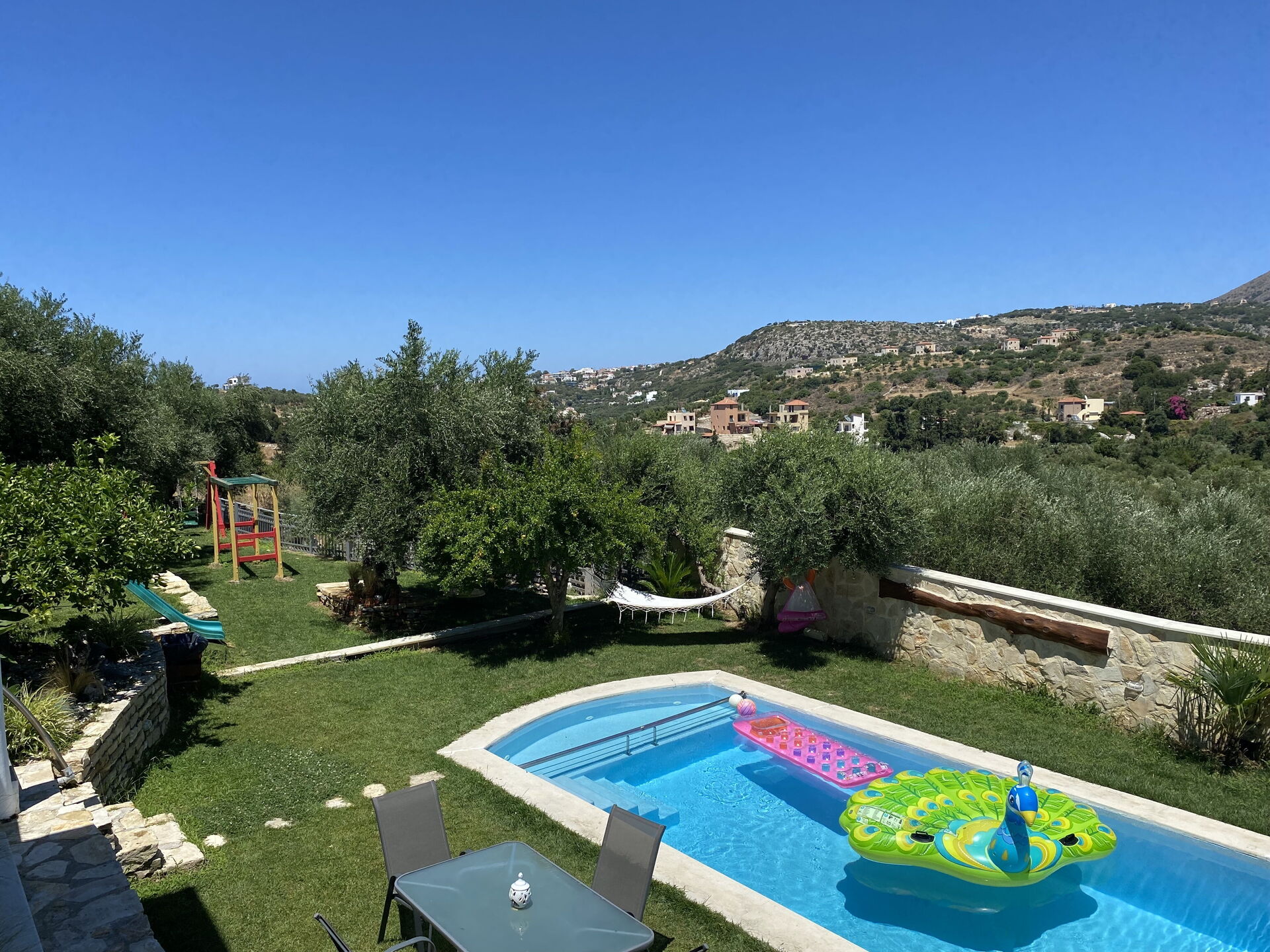 A peaceful paradise minutes from the sea! Everything about our vacation here was peaceful & relaxing, I would highly recommend both the villa & the hosts. Crete is a beautiful island & we’d love to come back!The house is set in spacious surroundings with hammocks, hanging chairs, plenty of seating options & comfortable sunloungers! Inside had luxury conveniences such as a washing machine, dishwasher, powerful showers & AC in the lounge area & all bedrooms. Also large TVs in all the rooms with Netflix & many other options. The decoration is a mix of modern inside & traditional outside with plenty of rustic features like old bicycles, radios or huge ceramic pots! There is a lovely BBQ area, play equipment & numerous places to soak up the sun. The Villa was very clean with hard floors throughout. There were towels for inside & others for the pool, plus the property was cleaned mid-way through our stay! The villa is about 4 minutes drive from Almyrida which is a small village but has plenty of essentials shops and a variety of restaurants. A hire car is essential as the house is a short distance up a short dirt track. Kalyves has a bigger supermarket around 10 minutes drive and then you have larger places about 30 minutes away such as Chania. The villa was as described, it has AC in the main lounge-kitchen and in all the bedrooms. In the villa was a welcome basket with wine and local luxuries! The fridge also had a selection of food and there were everyday essentials provided like toilet roll, hand soap and consumables. The kitchen was really well equipped with all the essentials and more! There was an oven, large fridge freezer, washing machine, dishwasher, utensils, even eggs provided from the owners chickens! The two swimming pools were both high quality & perfect size for water volleyball! There were plenty of sun loungers and places to sit, numerous options spread across the three outside floors of the villa. Excellent beds, with nice mattresses and good quality pillows and bedding. Excellent showers and sinks, nice decoration and clean. Nice touches like wash bins to collect your clothes up in.The decoration is a mix of modern inside & traditional outside with plenty of rustic features like old bicycles, radios or huge ceramic pots! There is a lovely BBQ area, play equipment & numerous patios and places to soak up the sun.Roxani & George own & host a beautiful villa set in the hills with great views. The hosts are excellent communicators available 24/7. They also gave good recommendations to keep us occupied throughout our stay!