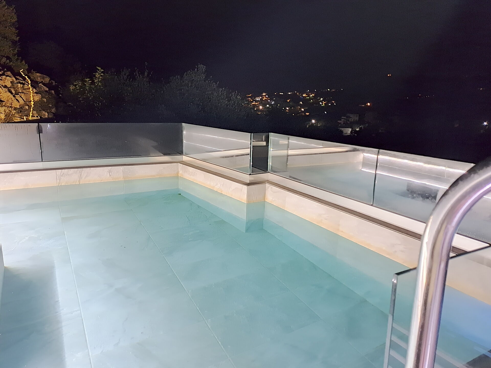 • pool med hydromassage på bottenvåningen i huset (2,35 x 3,40 meter; djup: 0,85 meter) på en terrass med panoramautsikt framför sovrummet