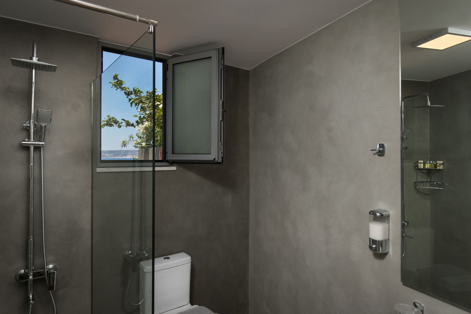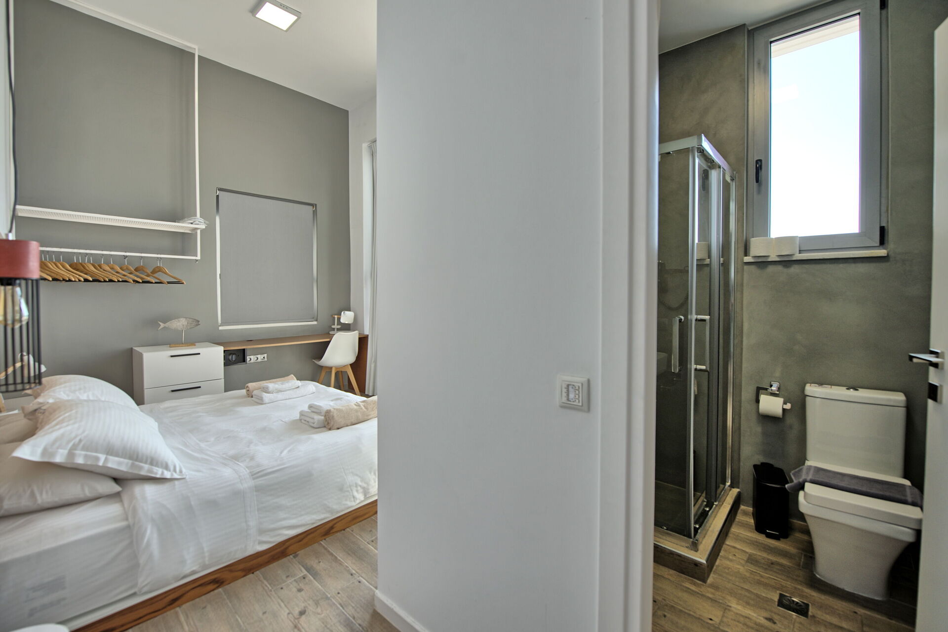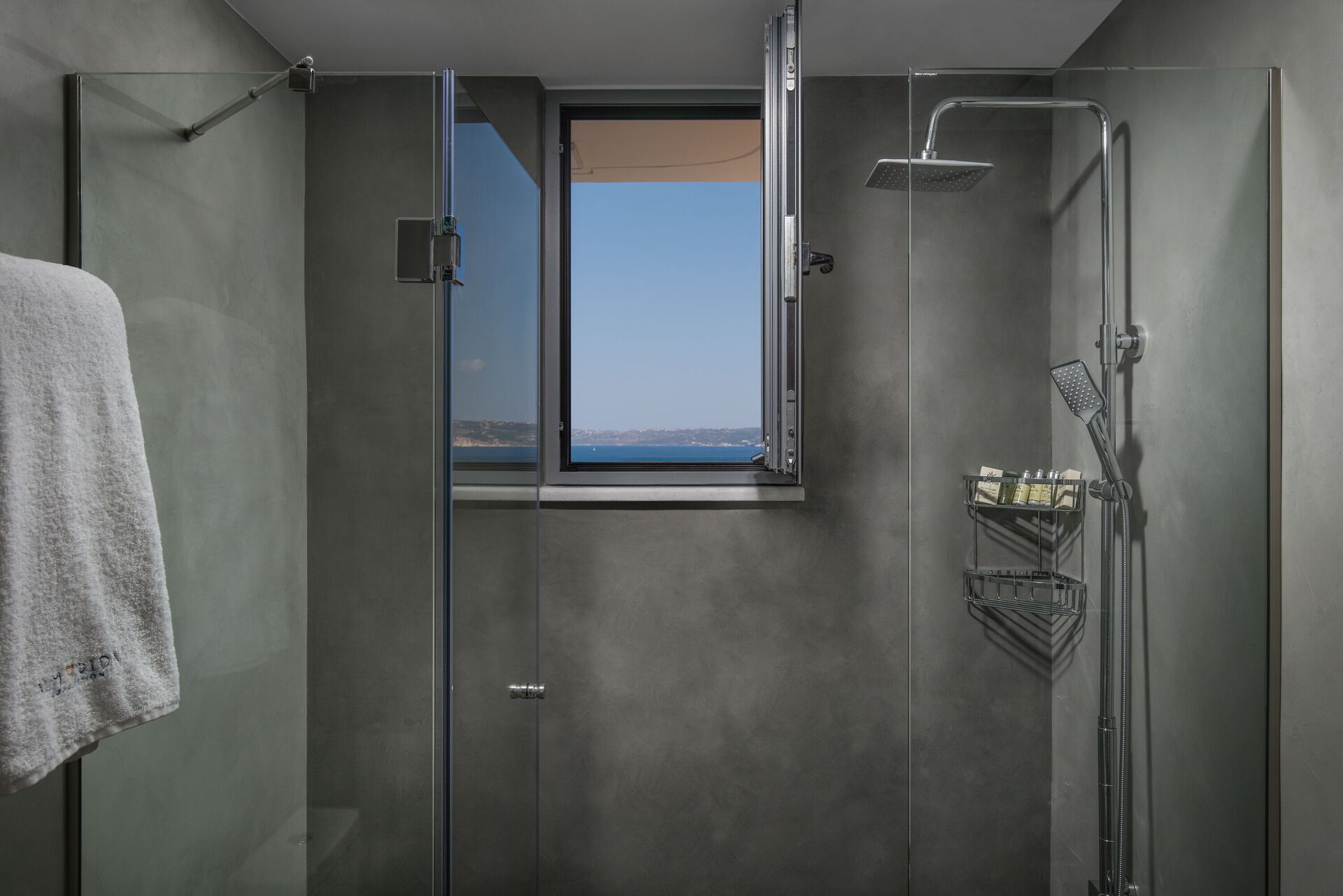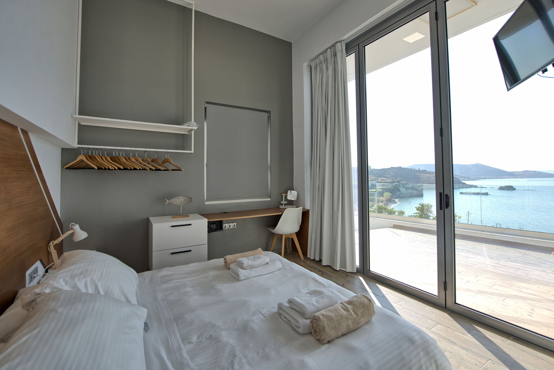 Dubbelrummet och vardagsrummet har tillgång till en naturskön terrass med havsutsikt.
