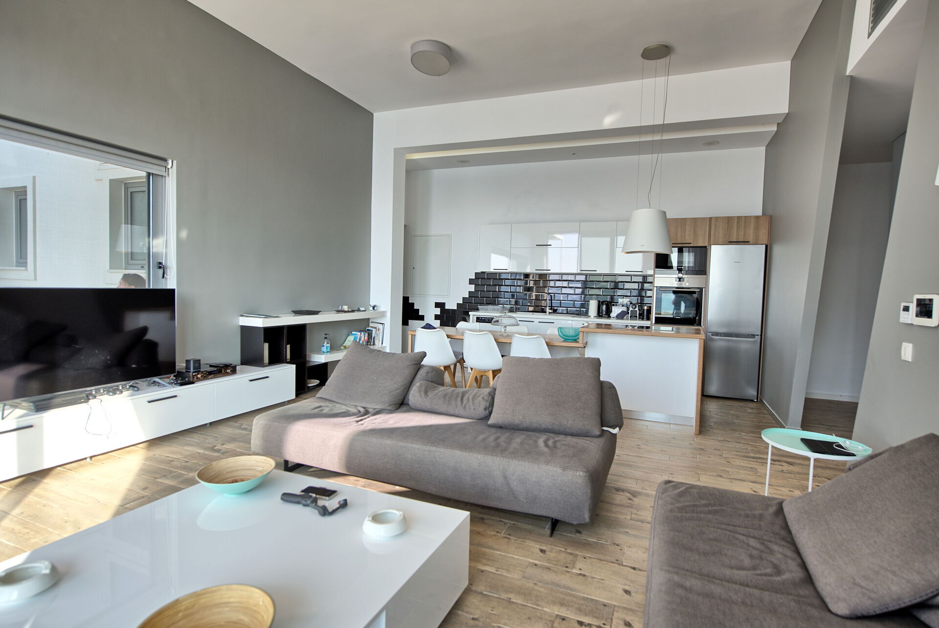 Ingång och vardagsrum med matplats med kök (ugn, kyl, frys, diskmaskin, mikrovågsugn, kaffebryggare) och vardagsrum (Smart TV) med 2 bäddsoffor för enkelsängar, 2 badrum med dusch, 1 sovrum med dubbelsäng, badrum med dusch.