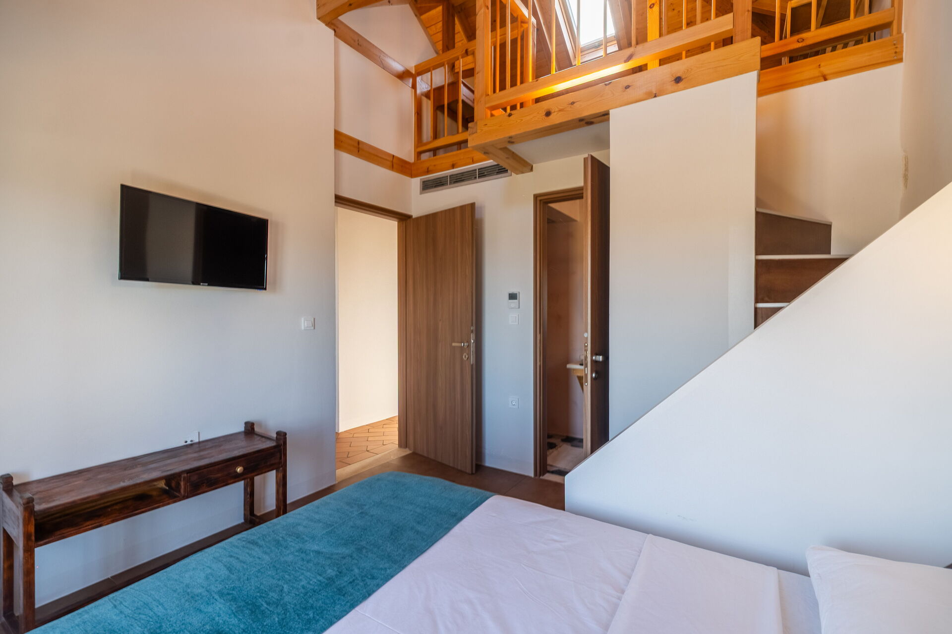 Övervåning: 2 dubbelrum med tillgång till ett loft med 1 enkelsäng, 2 badrum med dusch.