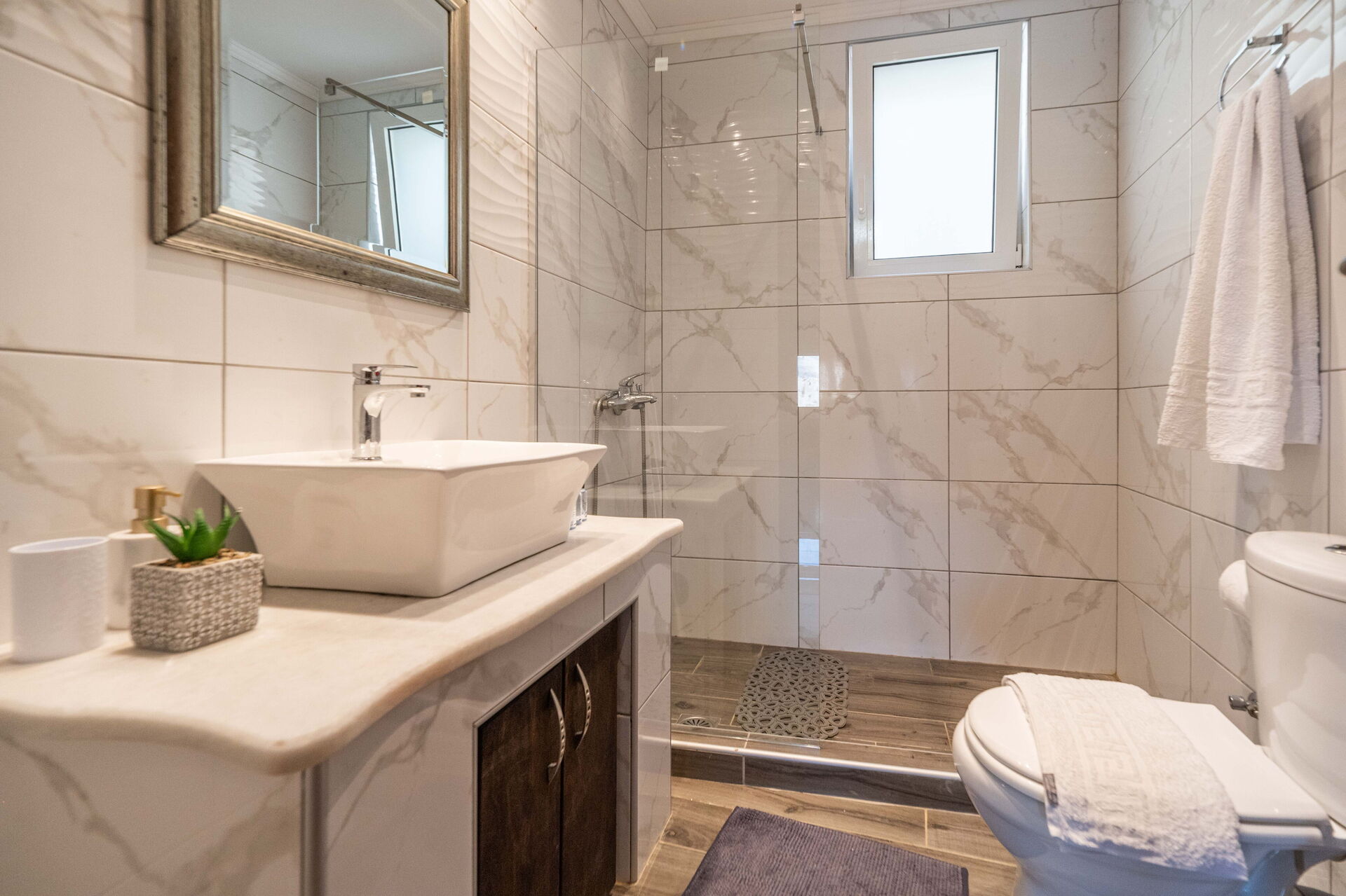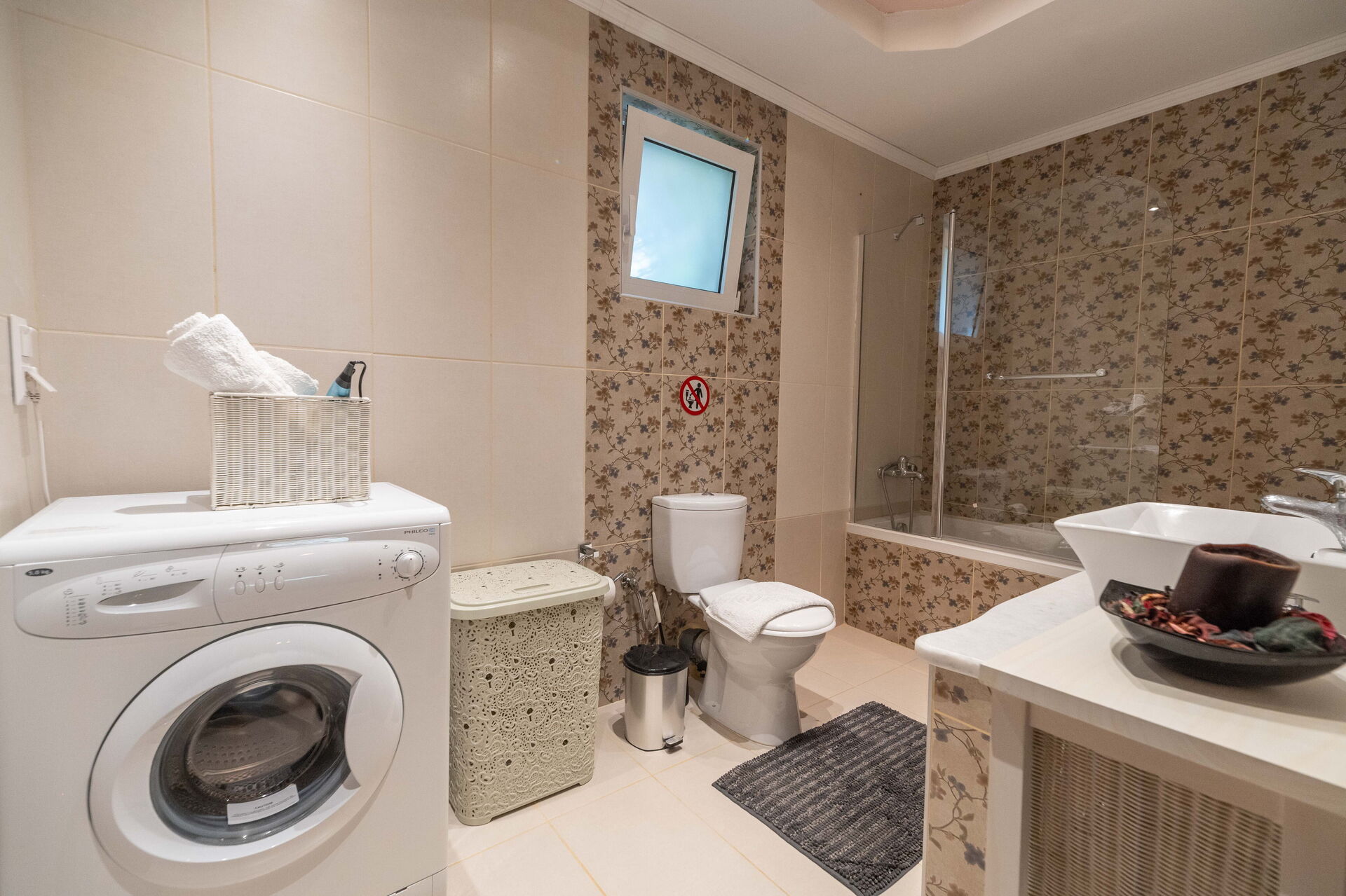 Bottenvåning: entré och vardagsrum med matplats och kök (häll, ugn, frys, kylskåp, diskmaskin, mikrovågsugn, kaffebryggare, brödrost), 1 dubbelrum (luftkonditionering) med eget badrum med badkar, 1 dubbelrum (luftkonditionering), 1 sovrum med två enkelsängar (luftkonditionering), badrum med dusch.