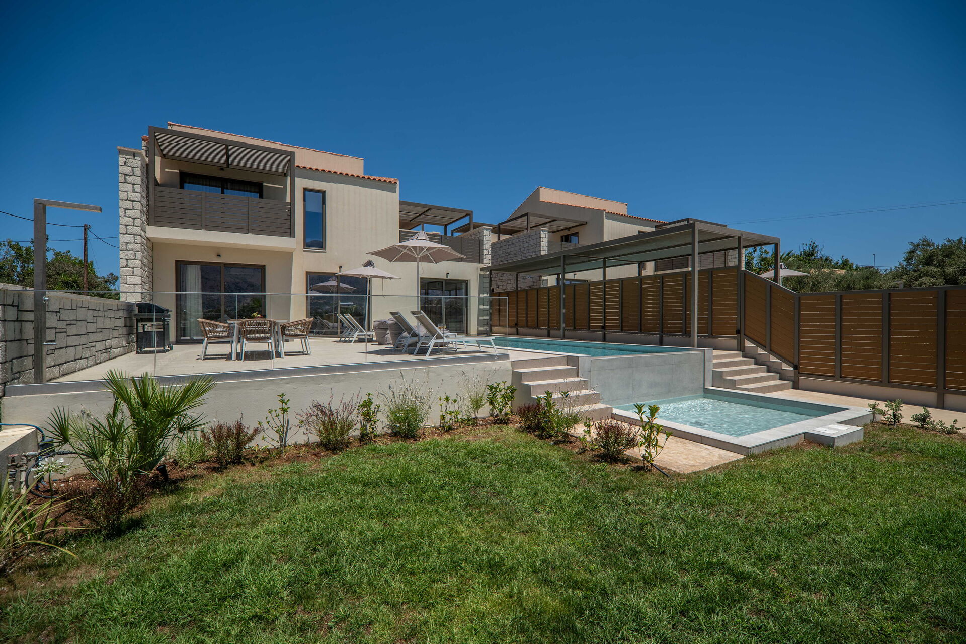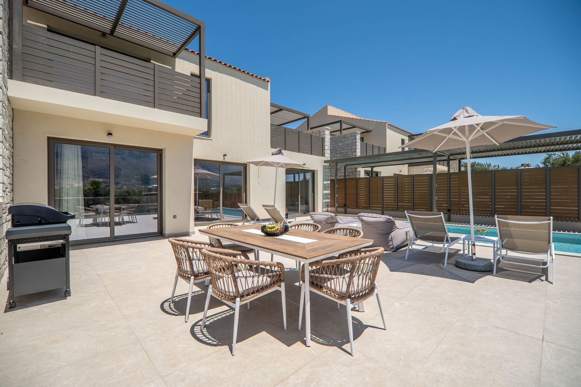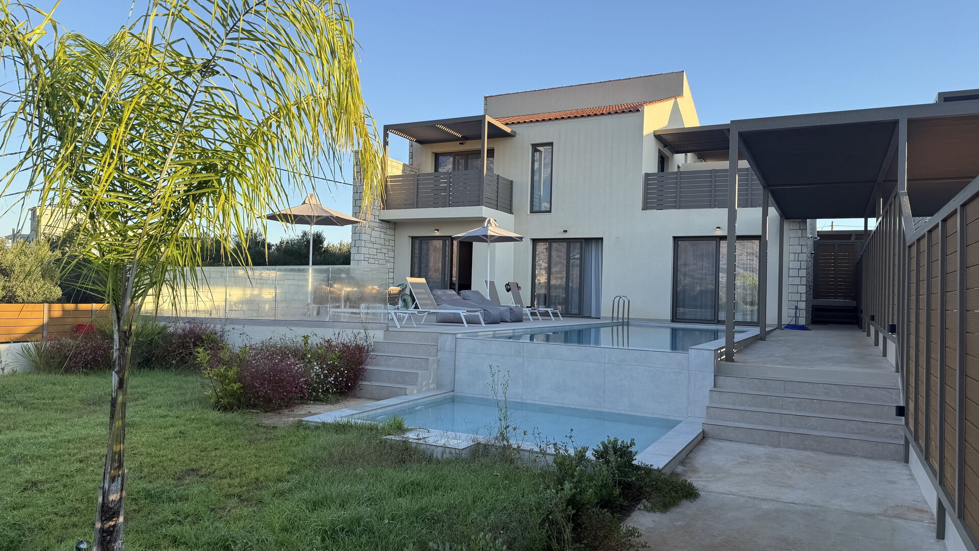 Varje semesterhus har 3 sovrum, 3 badrum, ett rymligt vardagsrum med kök, luftkonditionering i alla rum och ett fantastiskt uteområde med en privat pool som endast är tillgänglig för gästerna.
