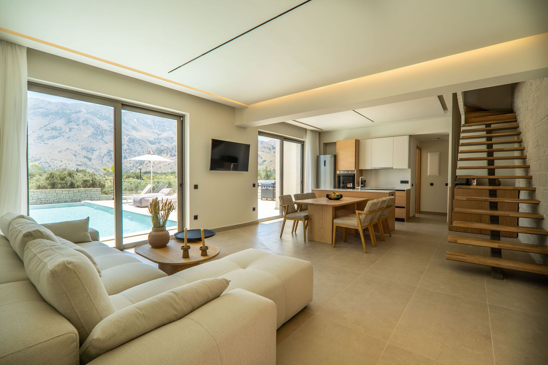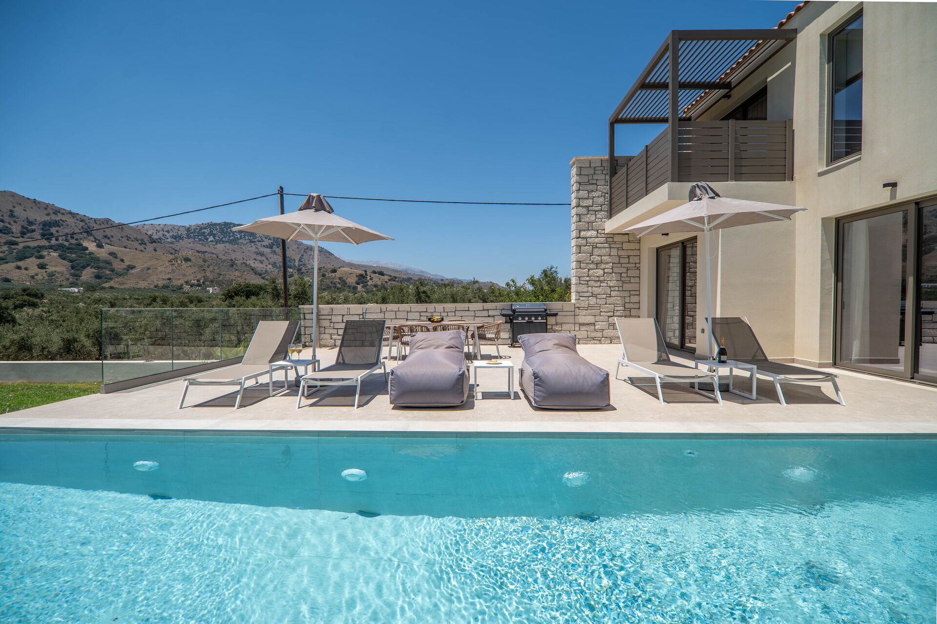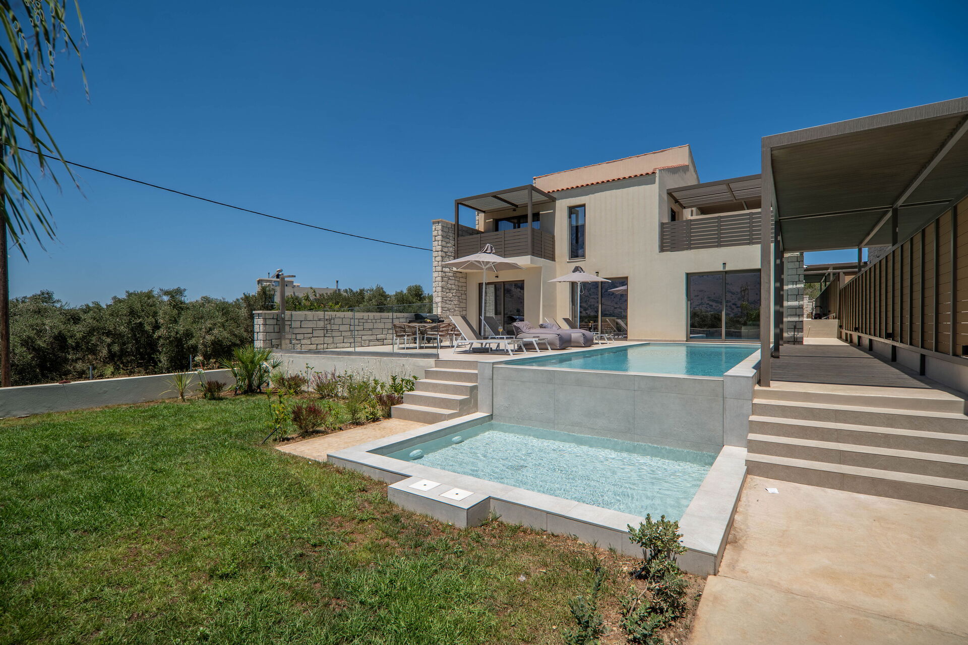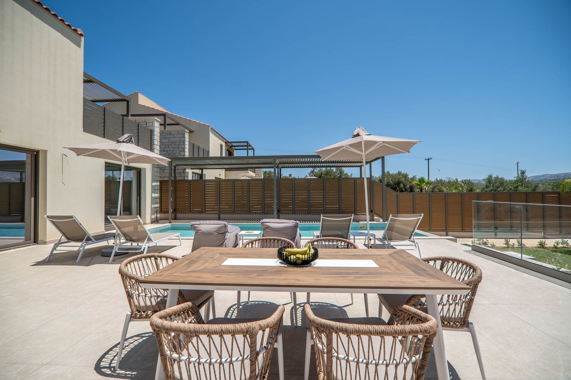Varje semesterhus har 3 sovrum, 3 badrum, ett rymligt vardagsrum med kök, luftkonditionering i alla rum och ett fantastiskt uteområde med en privat pool som endast är tillgänglig för gästerna.