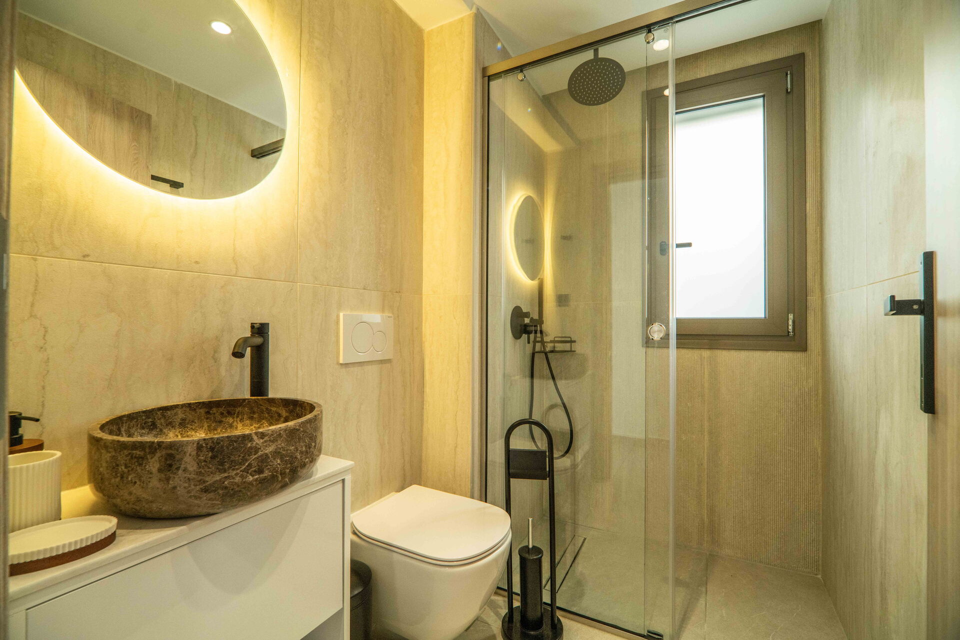 Semesterhuset är fördelat över 3 våningar och har totalt 5 bekväma och välutrustade sovrum: två på första våningen, två på bottenvåningen och ett på nedre plan. Från köket, som är utrustat med matbord, har man vacker utsikt över poolen, landskapet och havet. Det finns även ett möblerat utomhusområde för måltider i det fria.