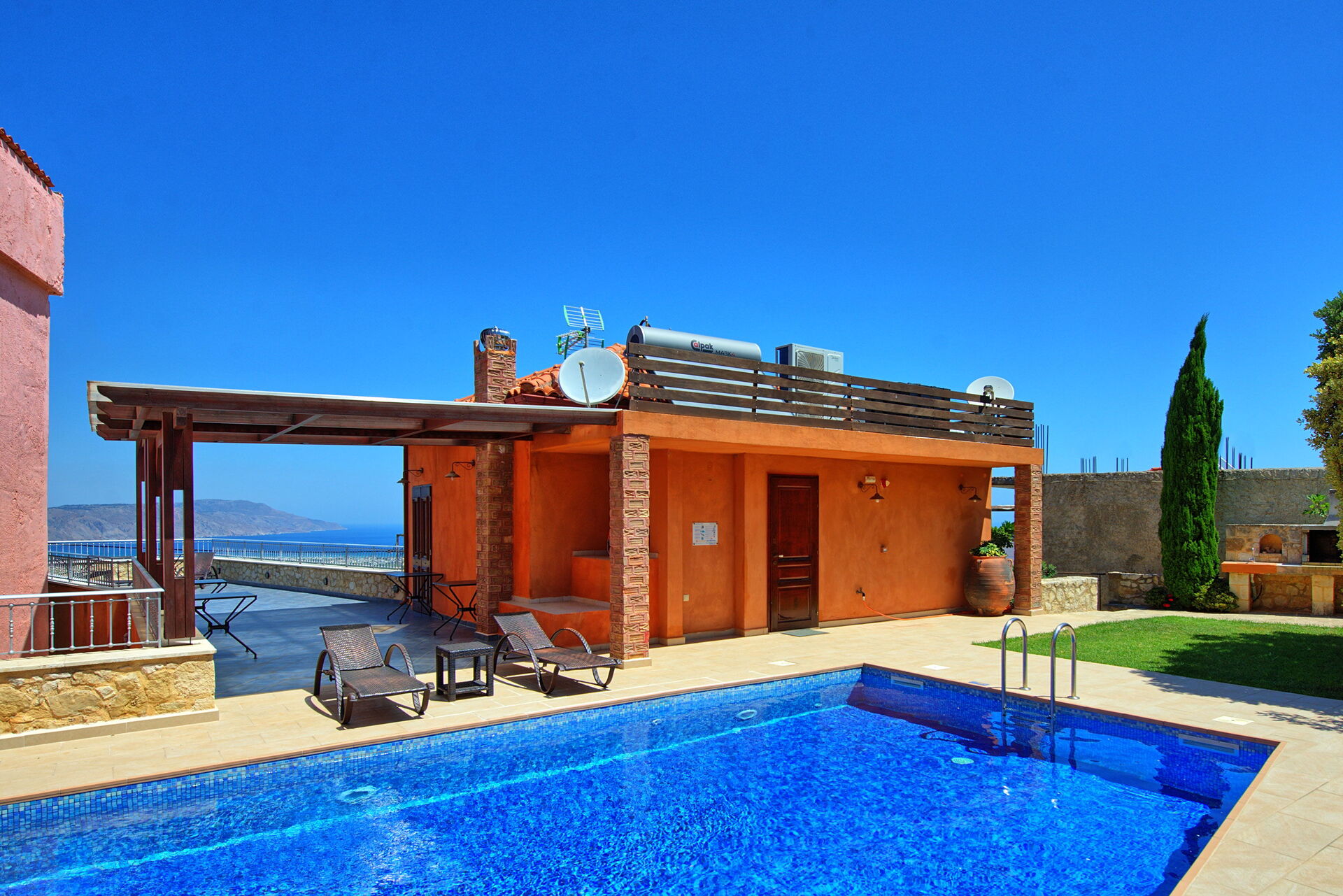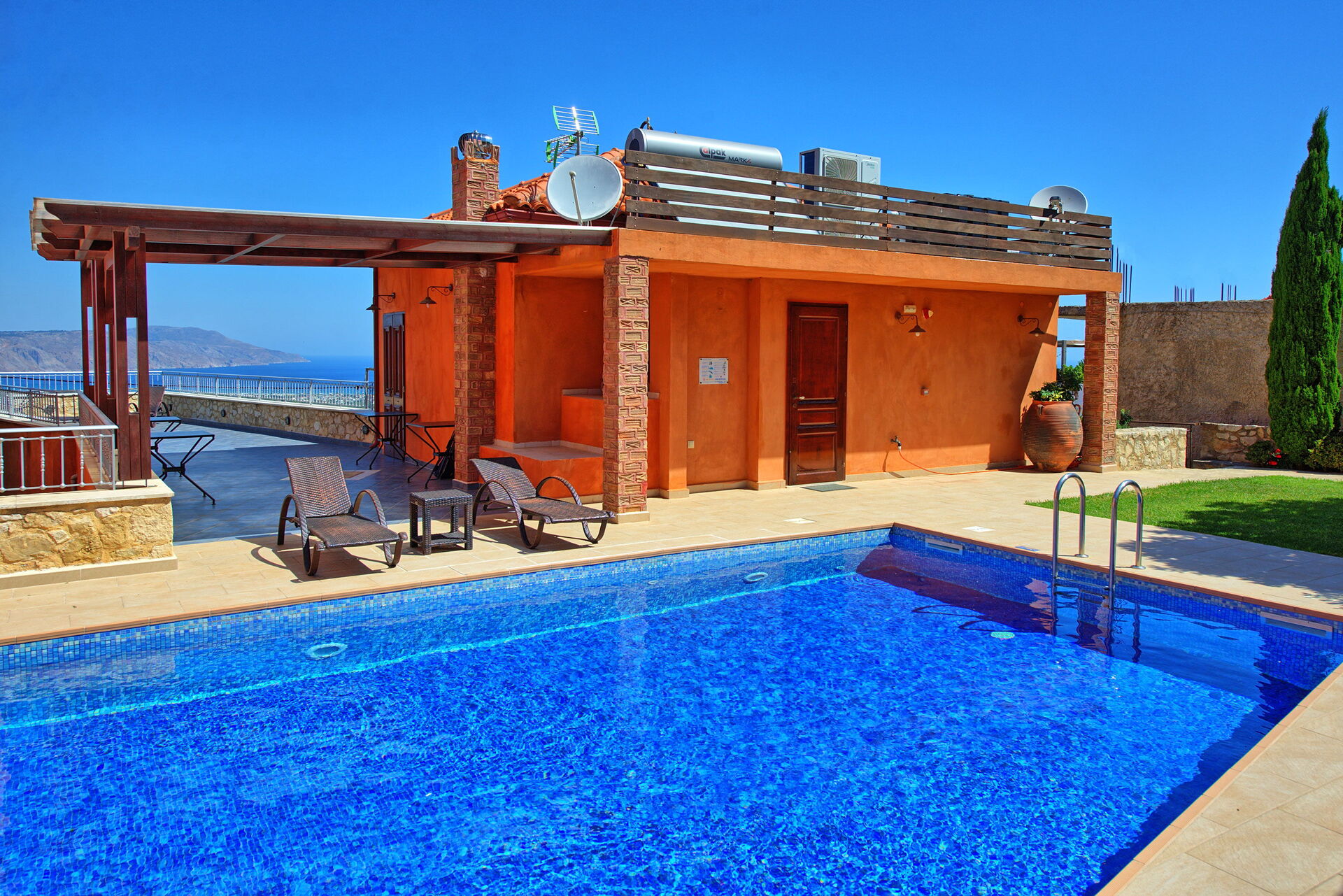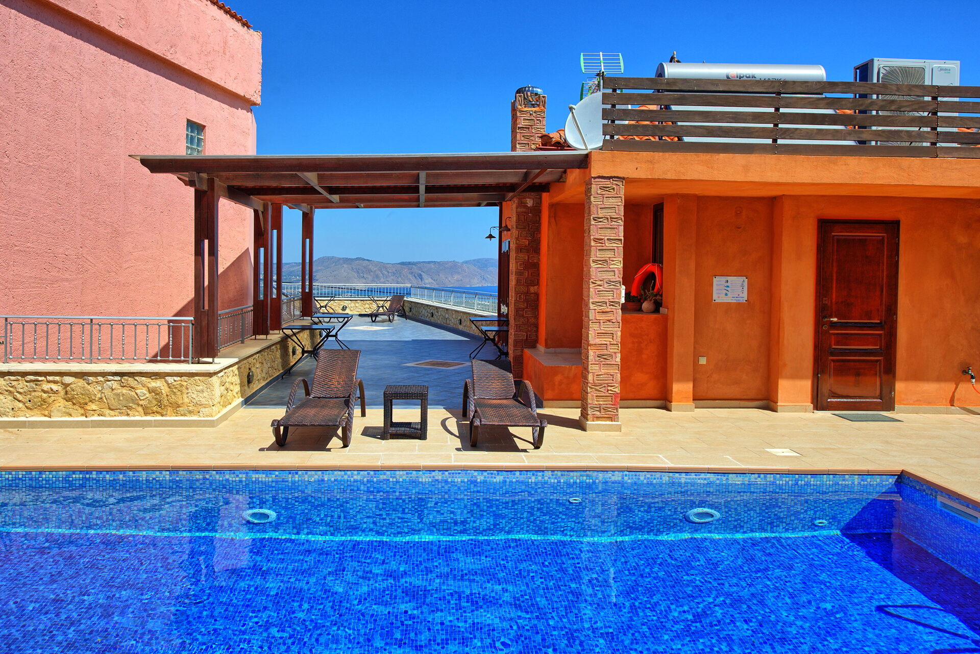 Villa Rodanthi har en vacker pool för att svalka dig under soliga dagar, och en härlig terrass för uteservering med fantastisk utsikt.