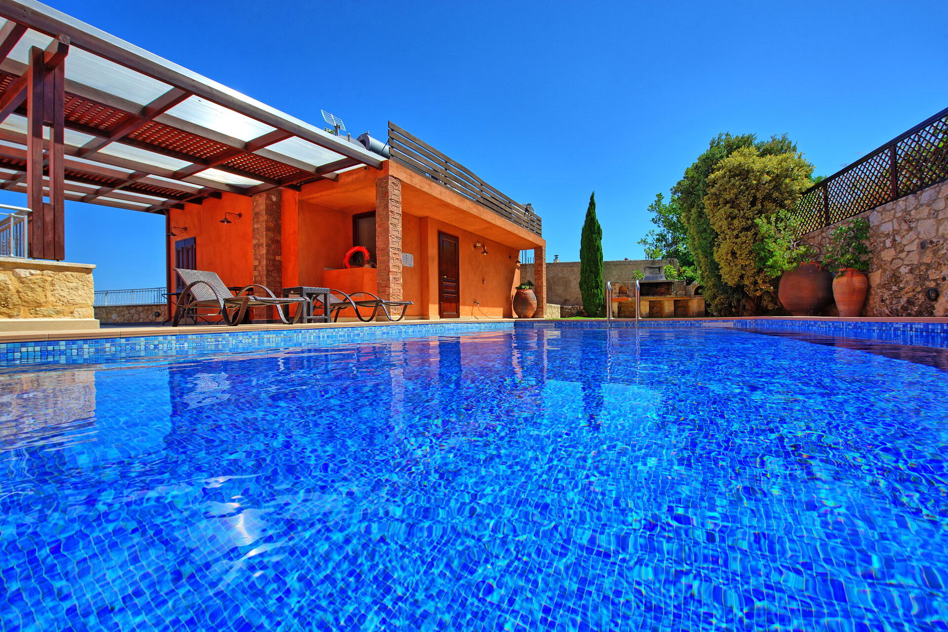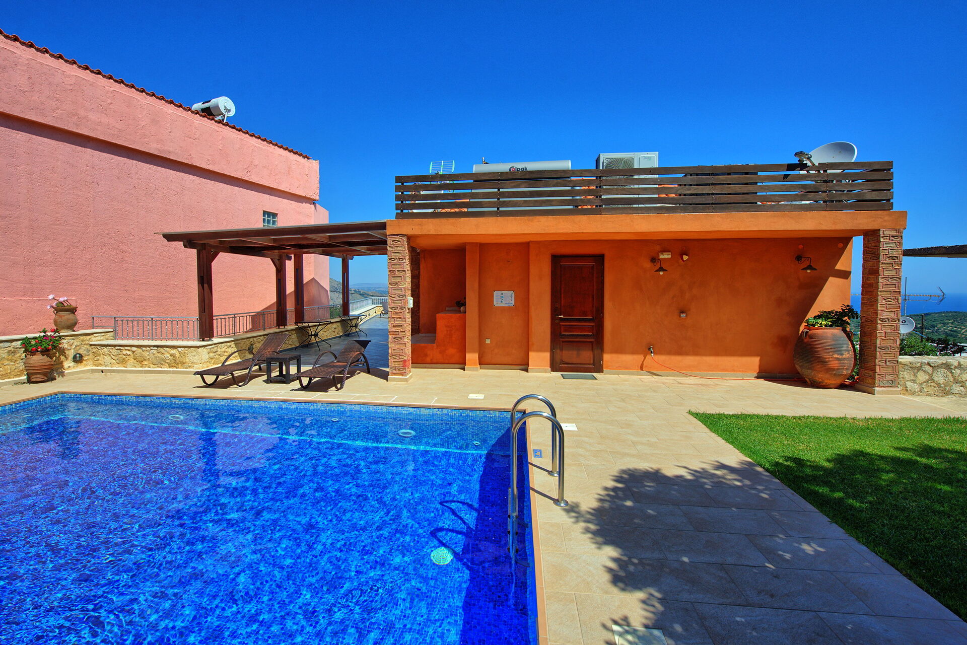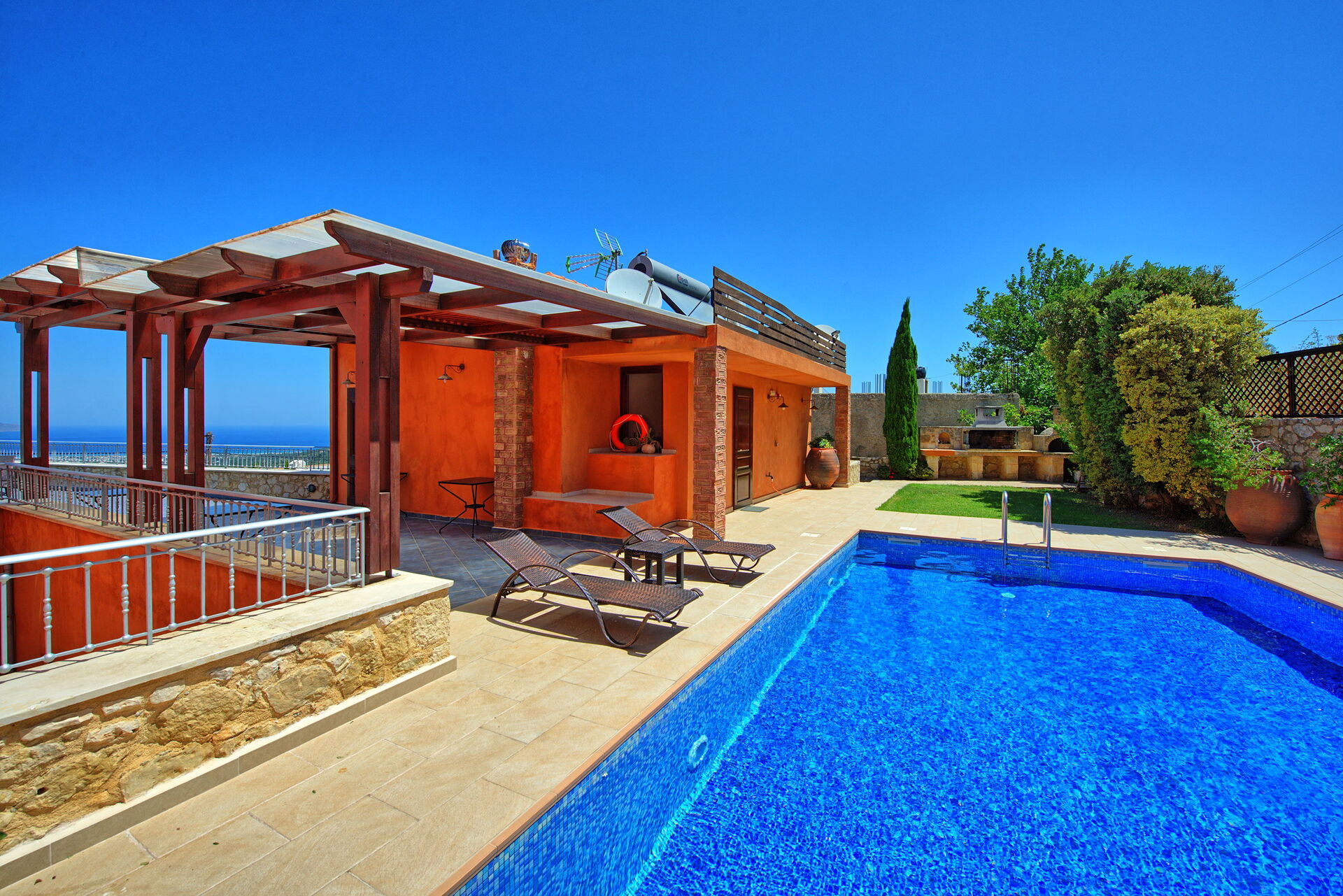 Villa Rodanthi har en vacker pool för att svalka dig under soliga dagar, och en härlig terrass för uteservering med fantastisk utsikt.