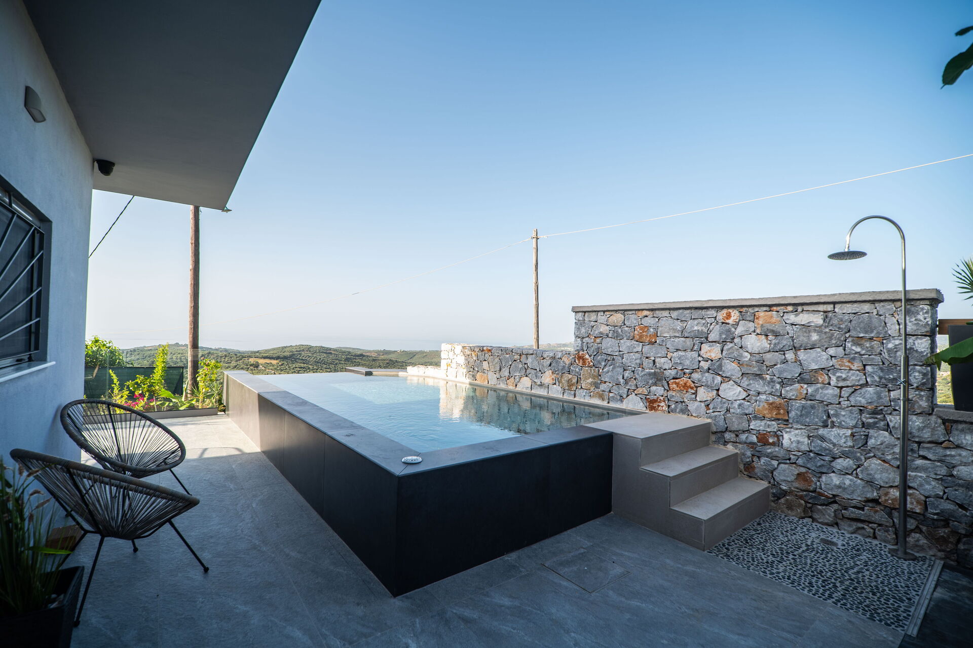 Semesterhuset har en trädgård och en sittgrupp utomhus med bord och grill. Under soliga sommardagar kan du svalka dig i den privata poolen med bubbelpool (kan värmas upp på begäran), njuta av fantastiska solnedgångar och den hisnande utsikten över det omgivande landskapet som sträcker sig hela vägen till havet.