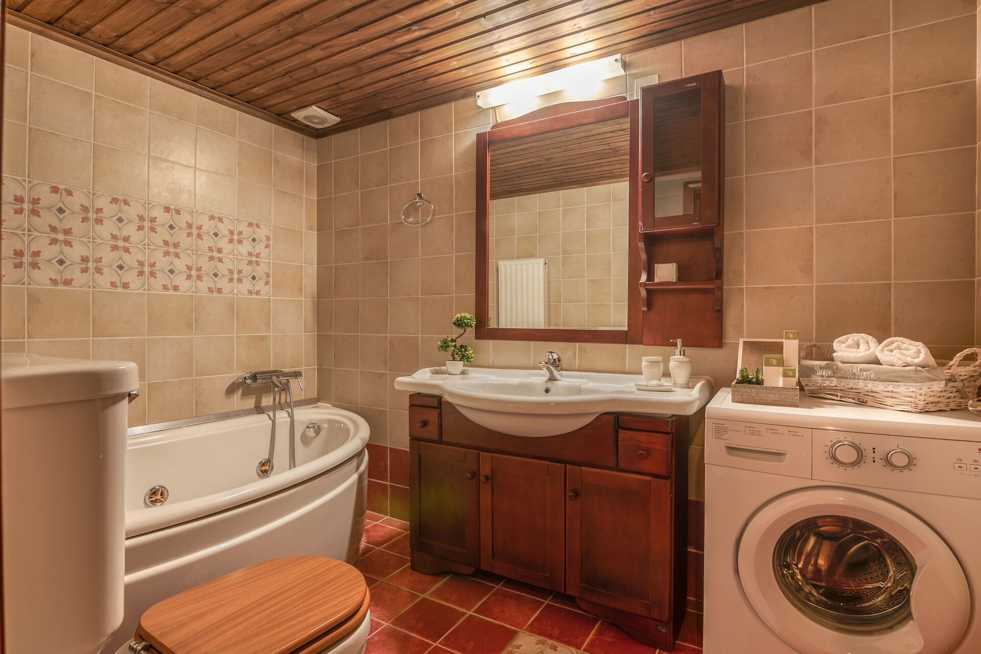 Högt belägen bottenvåning: stort vardagsrum med öppen spis (Smart-TV, luftkonditionering) med matplats, kök (ugn, diskmaskin, kylskåp, frys, spishäll, mikrovågsugn, brödrost), badrum med bubbelbadkar och tvättmaskin; 2 dubbelrum (luftkonditionering), varje med ett eget badrum med dusch och tillgång till en stor veranda med panoramautsikt.