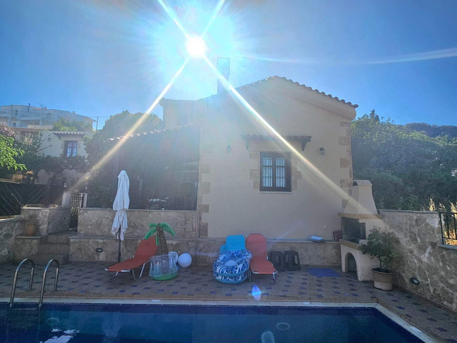 Das Haus und der Pool sind sehr gepflegt und sauber. Die Lage etwas abgelegen in einem kleinen Dorf, für eine ruhige Auszeit zu zweit optimal. Die Ausstattung und Einrichtung sind sehr gut. Die Terrasse ist schattig überdacht mit einer schönen Anlage und Zitronenbäumen. In ständiger Begleitung sind wilde Katzen, die nach Nahrung betteln. Supermarkt und das Meer sind einige km entfernt, mit dem Auto in 10min erreichbar. Ebenso (Auto) kleine Tavernen mit gutem Essen (frische Meeresfrüchte) und bezahlbaren Preisen. Nachbargrundstück ist verwildert mit Bauruine. Das Meer ist als kleiner Ausschnitt in einigen km zu sehen.