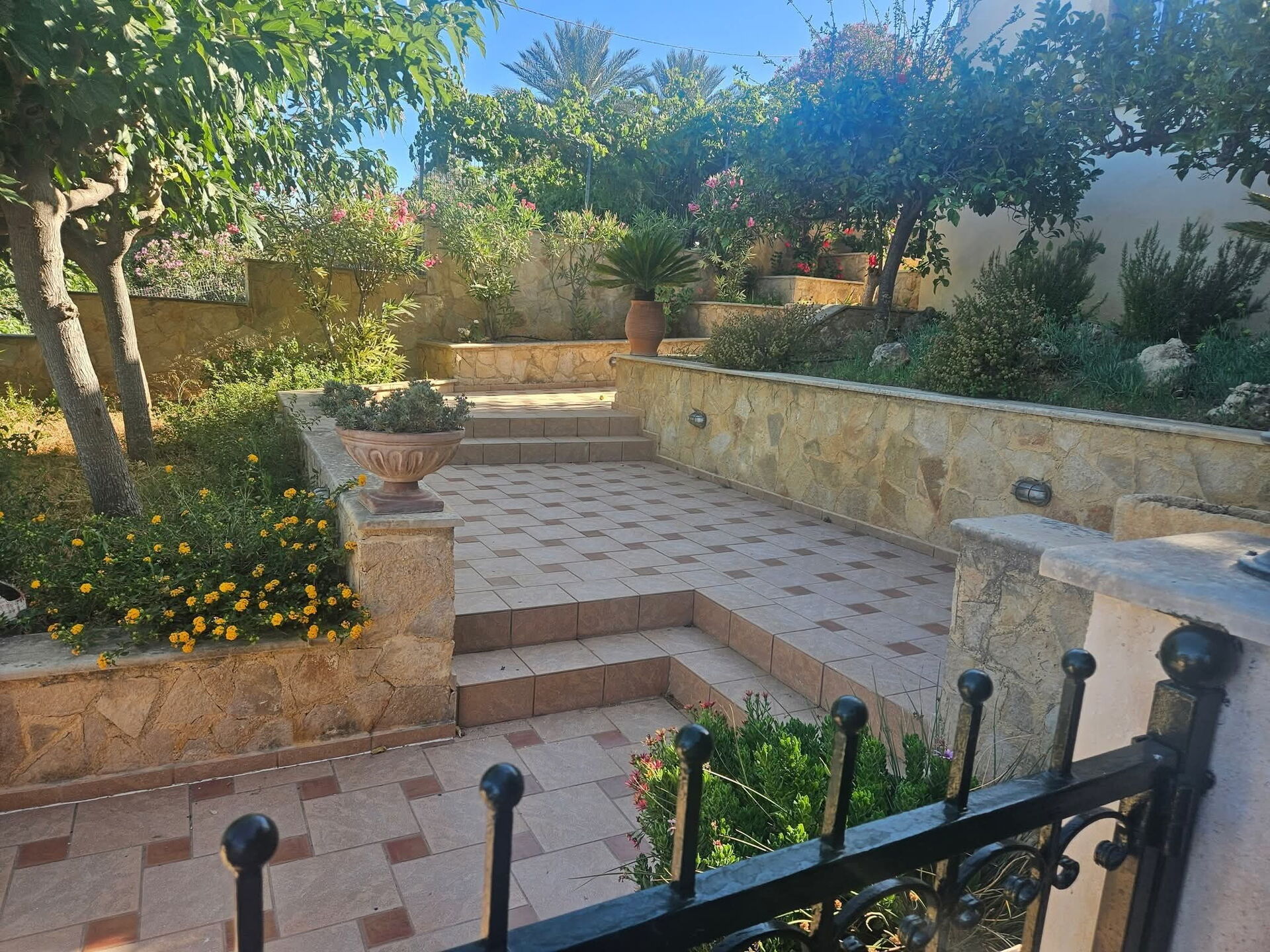 - Terrass och trädgårdar med blommor och buskar