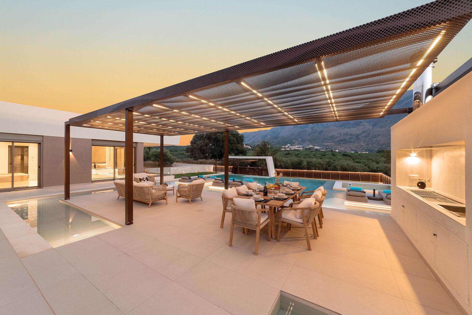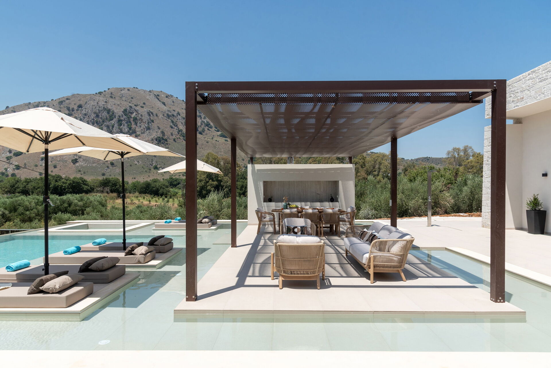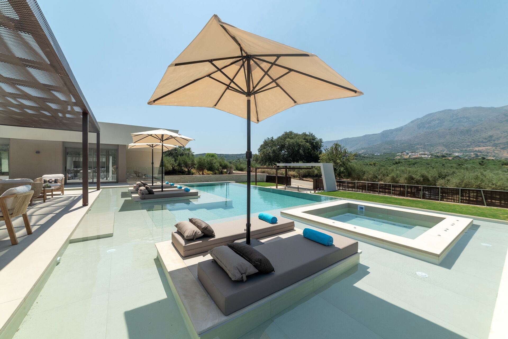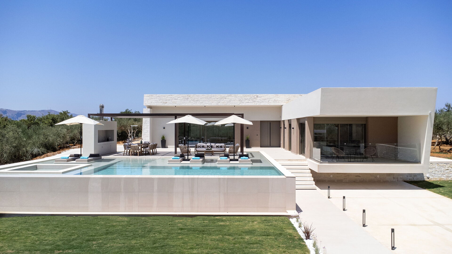 Design och komfort kännetecknar denna ljusa, lyxiga villa: möblerna och planlösningen har valts med stor omsorg. Invändigt och utvändigt är fastigheten designad för att erbjuda högsta komfort. Semesterhuset har plats för 7/8 personer i 4 sovrum och på uteplatsen finns ett stort möblerat område med utekök och matplats där du kan njuta av vackra soliga dagar på Kreta. I den privata poolen (med bubbelpool) kan gästerna svalka sig och ha kul.