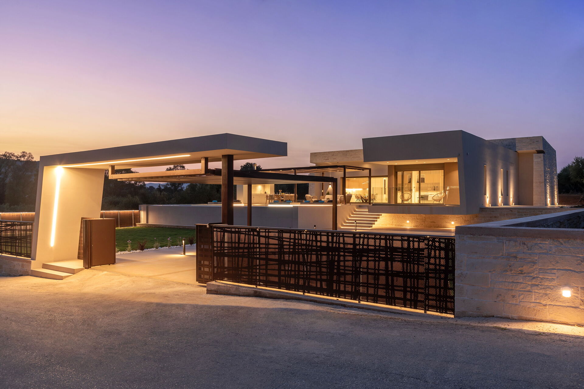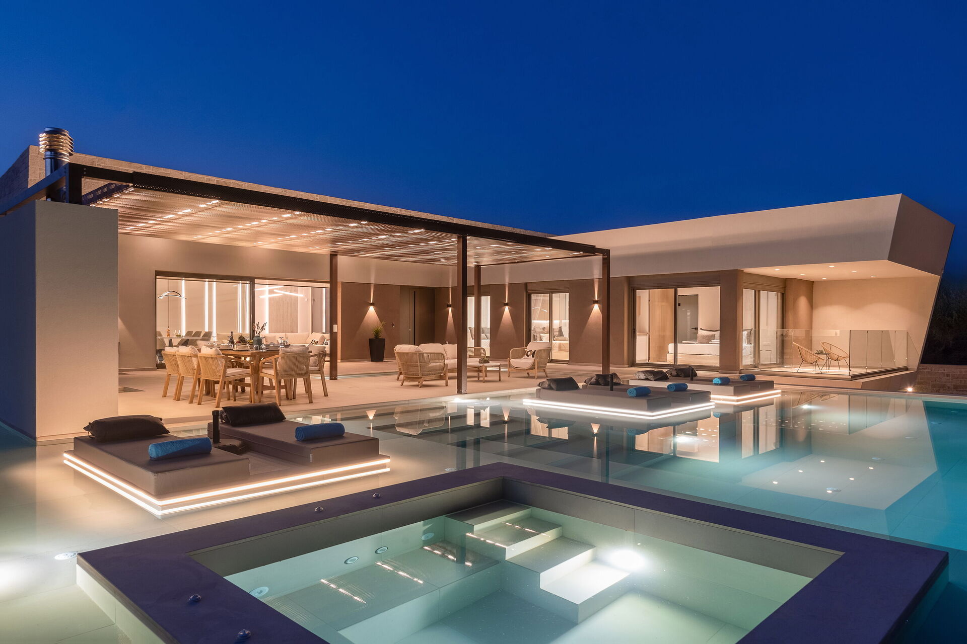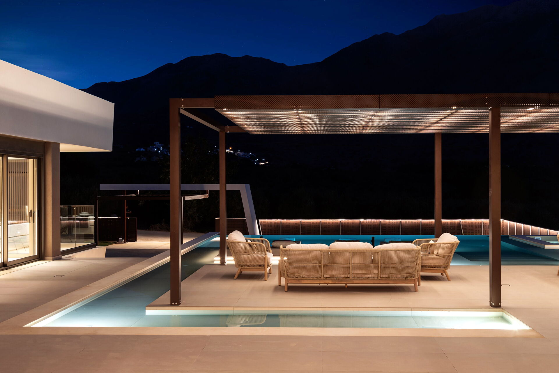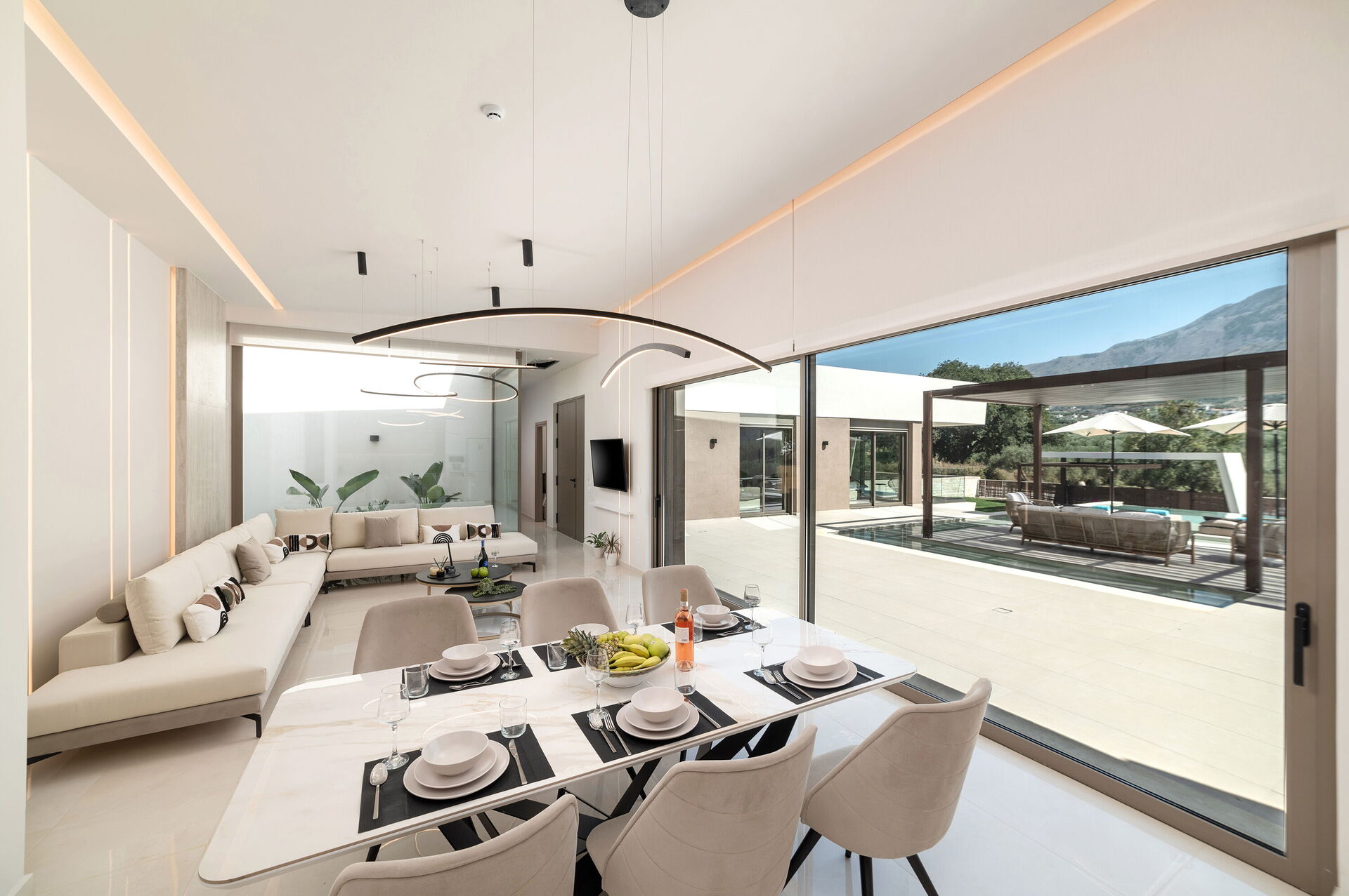Design och komfort kännetecknar denna ljusa, lyxiga villa: möblerna och planlösningen har valts med stor omsorg. Invändigt och utvändigt är fastigheten designad för att erbjuda högsta komfort. Semesterhuset har plats för 7/8 personer i 4 sovrum och på uteplatsen finns ett stort möblerat område med utekök och matplats där du kan njuta av vackra soliga dagar på Kreta. I den privata poolen (med bubbelpool) kan gästerna svalka sig och ha kul.