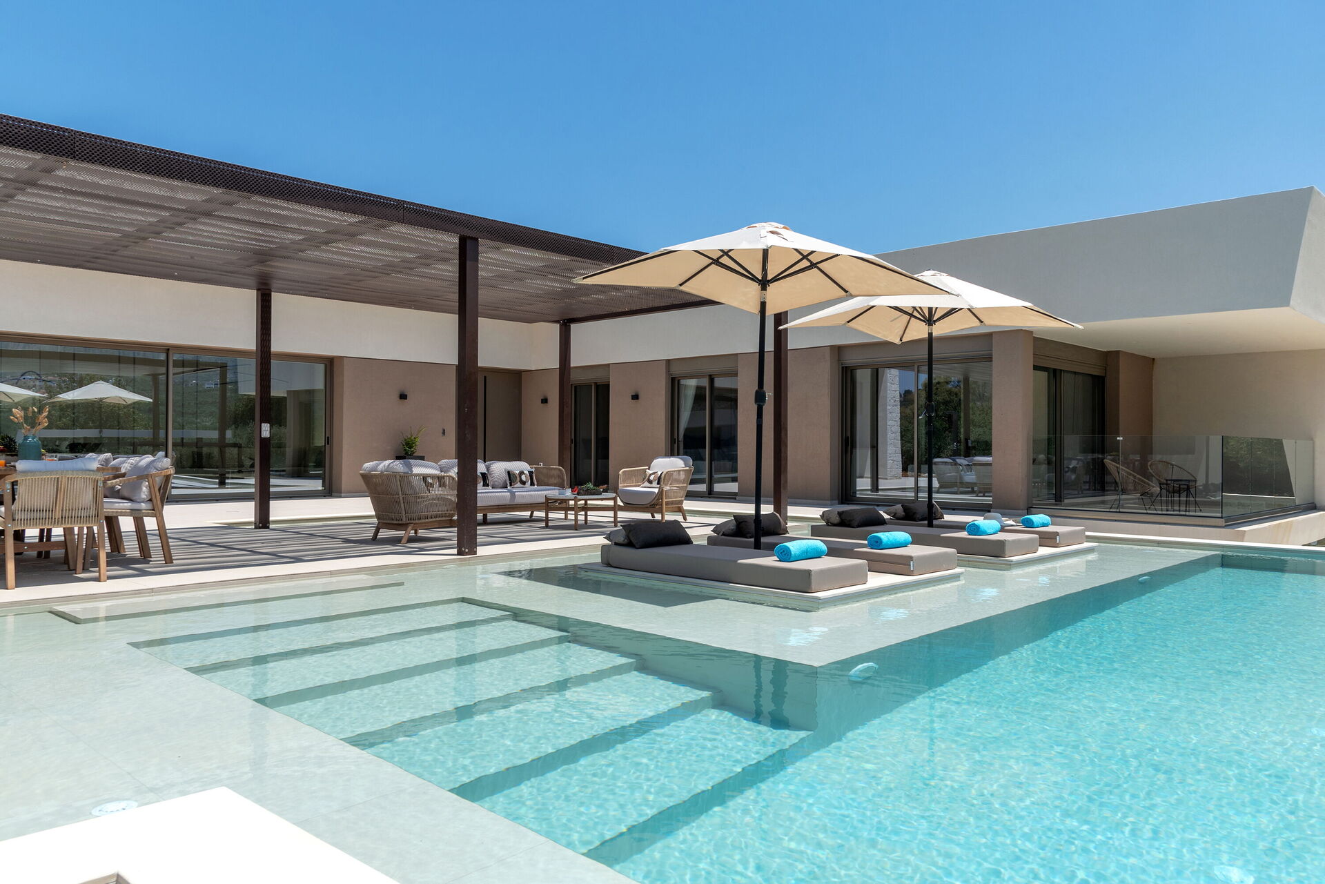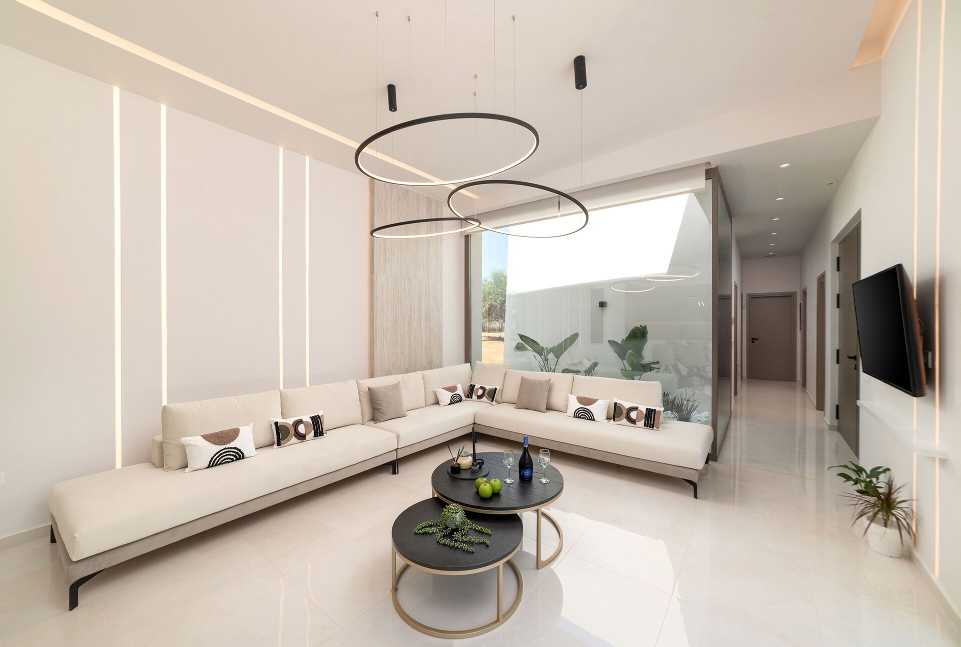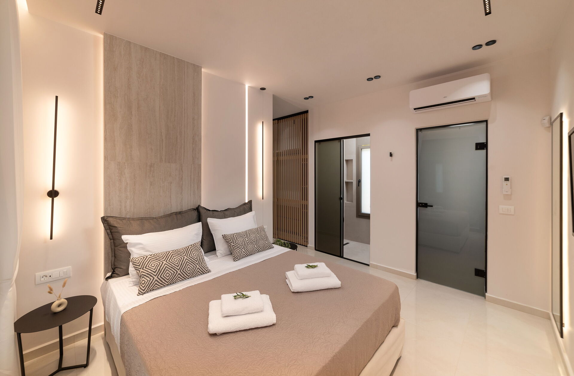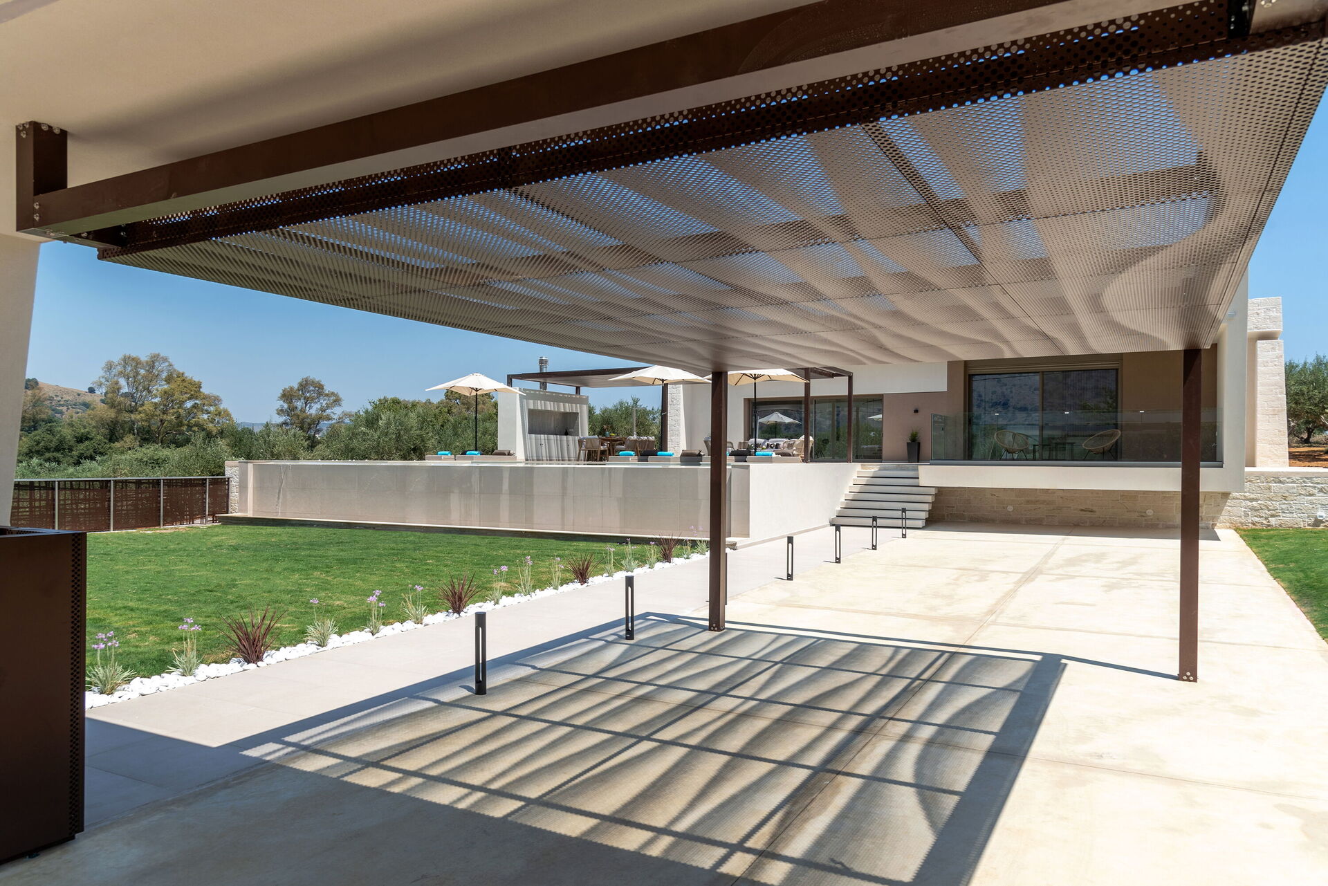 Design och komfort kännetecknar denna ljusa, lyxiga villa: möblerna och planlösningen har valts med stor omsorg. Invändigt och utvändigt är fastigheten designad för att erbjuda högsta komfort. Semesterhuset har plats för 7/8 personer i 4 sovrum och på uteplatsen finns ett stort möblerat område med utekök och matplats där du kan njuta av vackra soliga dagar på Kreta. I den privata poolen (med bubbelpool) kan gästerna svalka sig och ha kul.